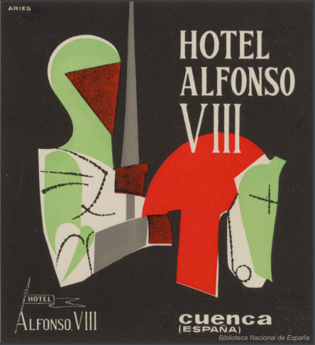 Hay dos diseños del Hotel Alfonso VIII, que abrió sus puertas en 1963. En ambas aparece el rey conquistador de Cuenca montando a caballo y empuñando una lanza, pero mientras que una es en blanco y negro y la palabra ‘Hotel’ aparece dentro de un estandarte, la segunda es a color y aparece la firma del ilustrador, Aries, nombre de una editorial conquense de la década de los sesenta.