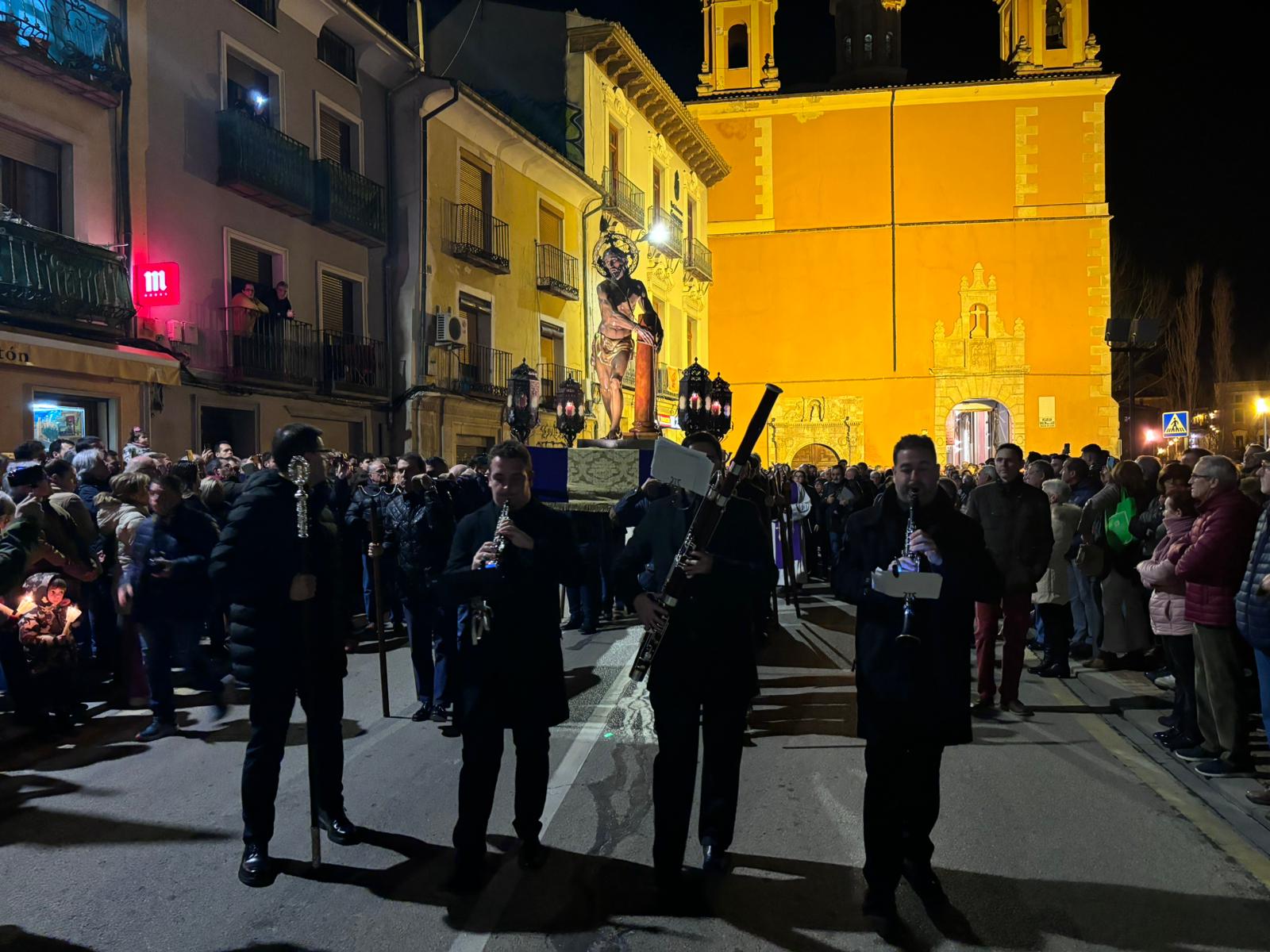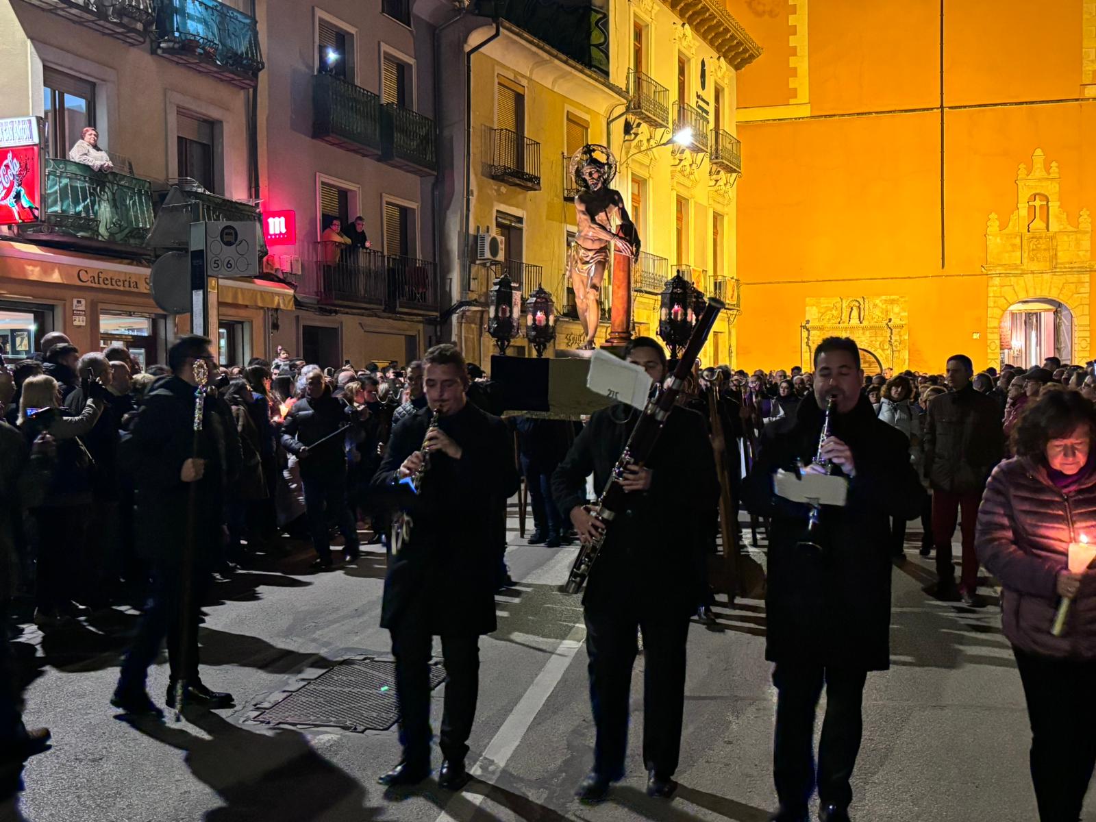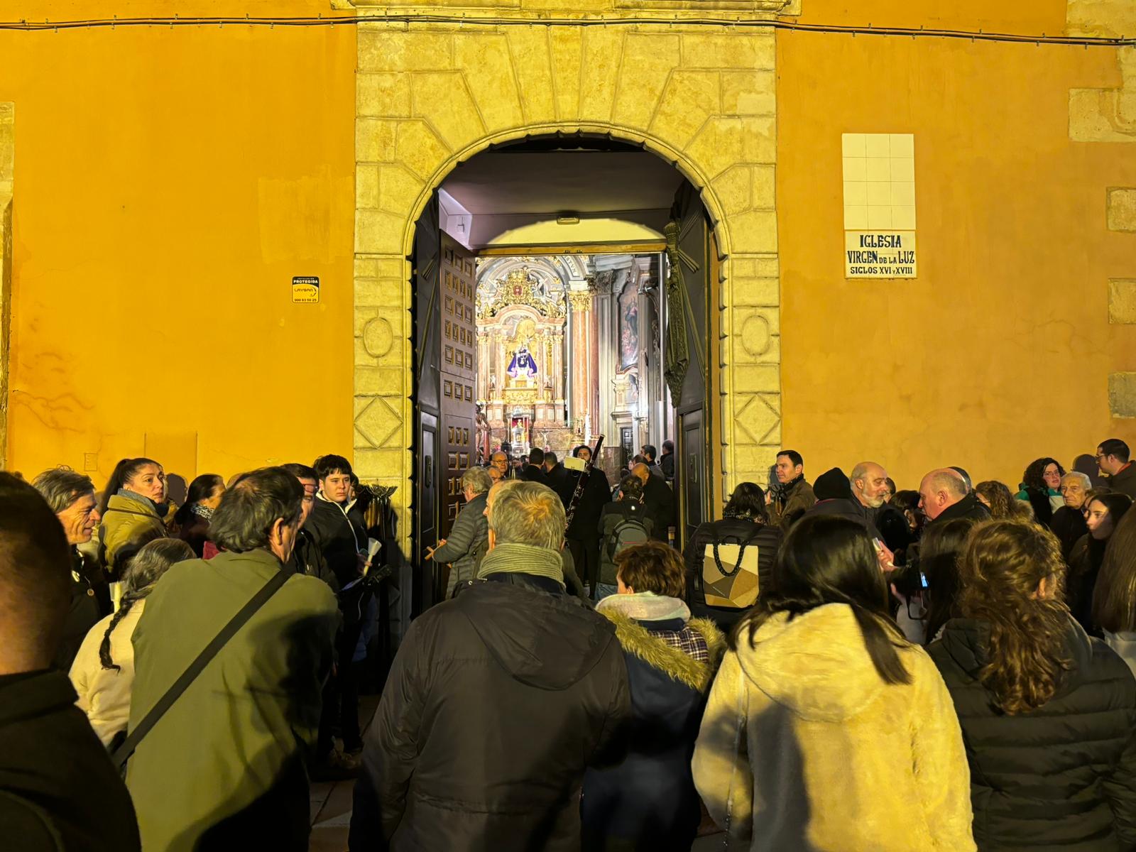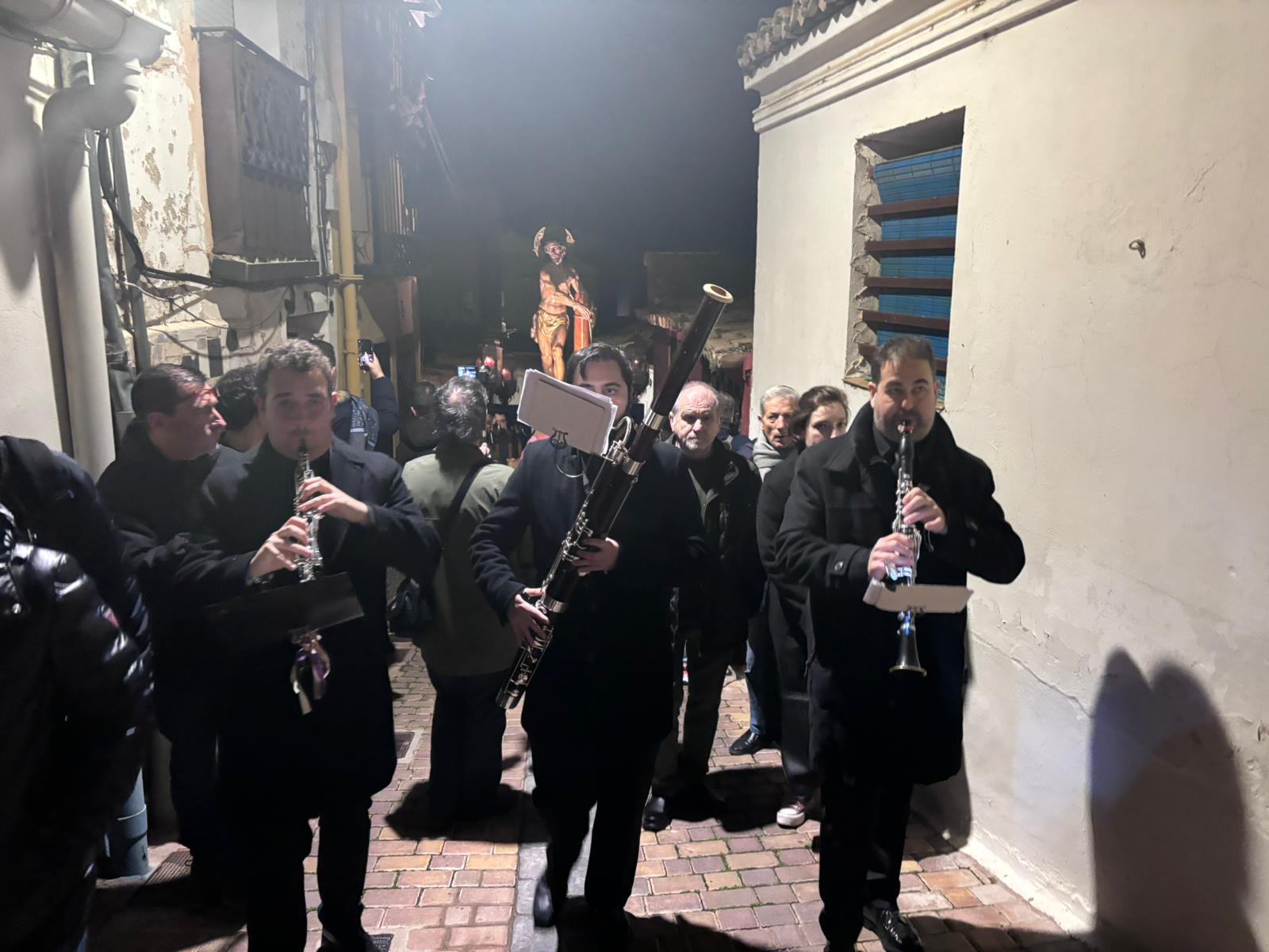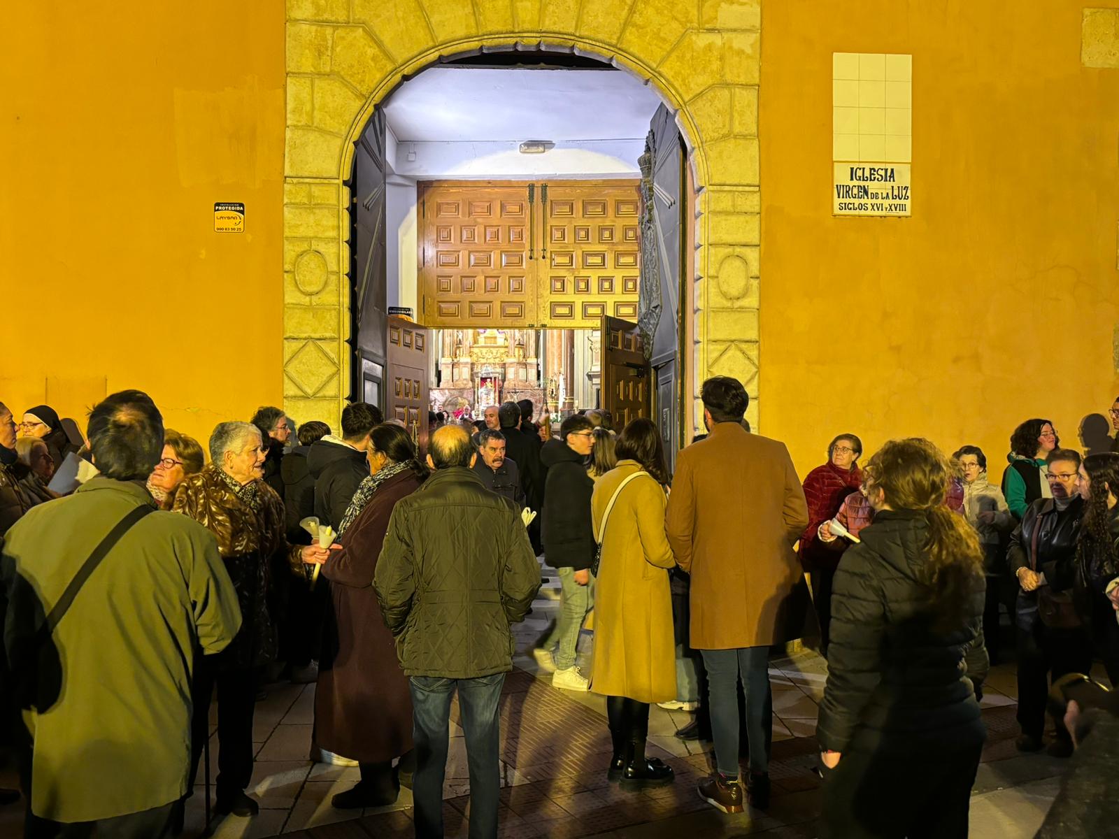 Pasadas las ocho de la tarde, pocos minutos después de la conclusión de la tradicional misa, se han abierto las puertas de la iglesia de la Virgen de la Luz para que se pusiera un cortejo procesional que tenía como principal novedad el acompañamiento musical del Trío de Capilla de Cuenca, que introdujo un nuevo matiz sonoro a una procesión que siempre se ha movido a golpe de rezo y horquilla.