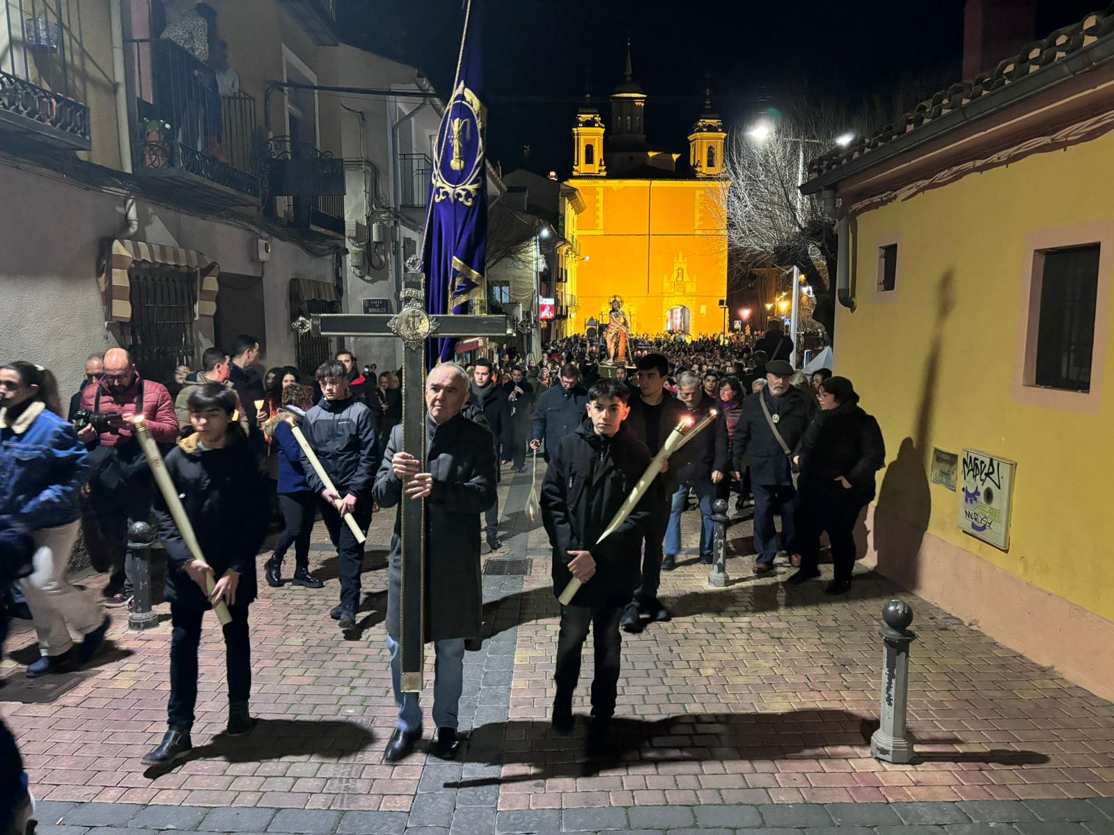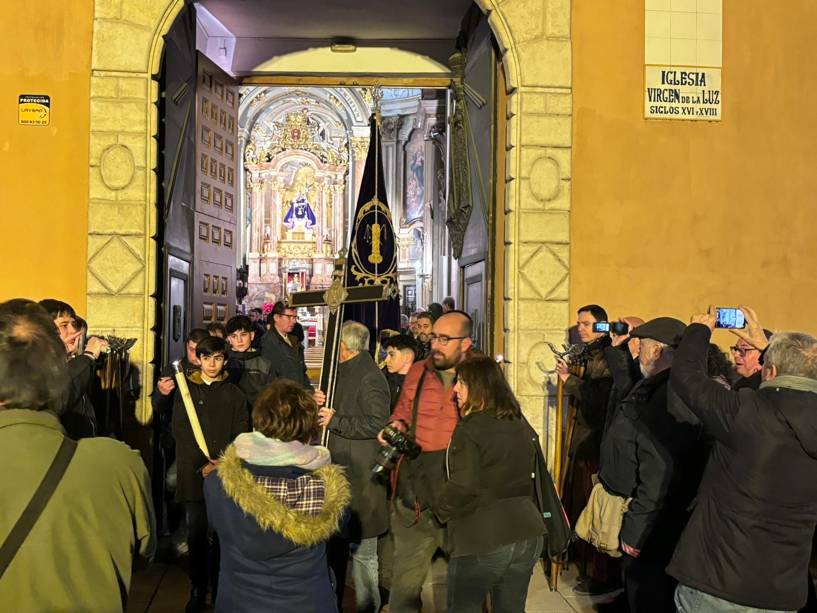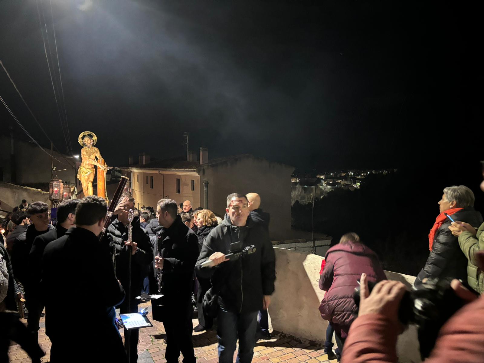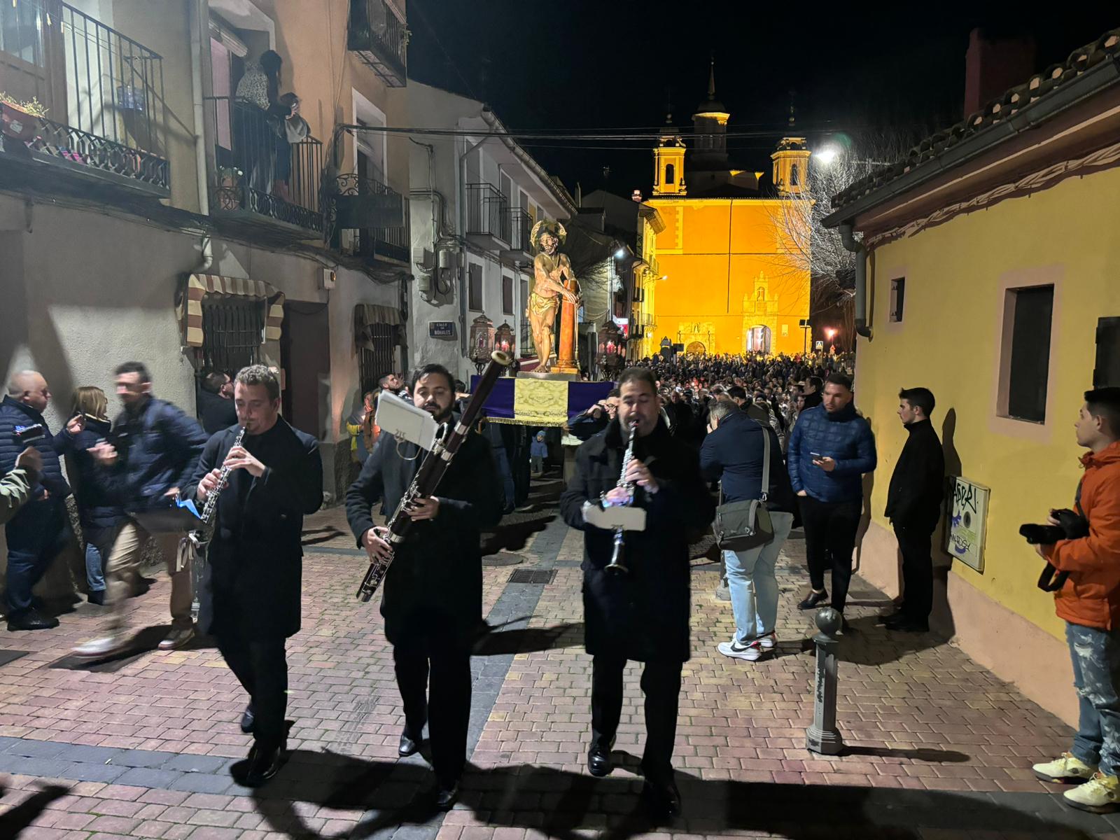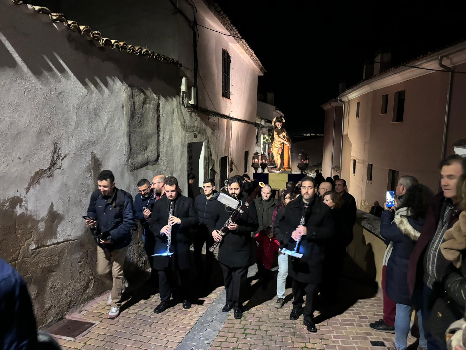 Pasadas las ocho de la tarde, pocos minutos después de la conclusión de la tradicional misa, se han abierto las puertas de la iglesia de la Virgen de la Luz para que se pusiera un cortejo procesional que tenía como principal novedad el acompañamiento musical del Trío de Capilla de Cuenca, que introdujo un nuevo matiz sonoro a una procesión que siempre se ha movido a golpe de rezo y horquilla.