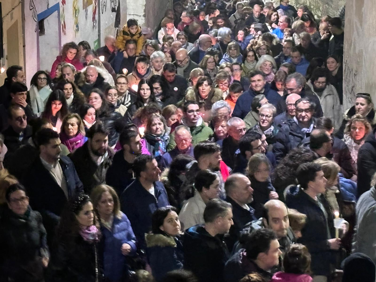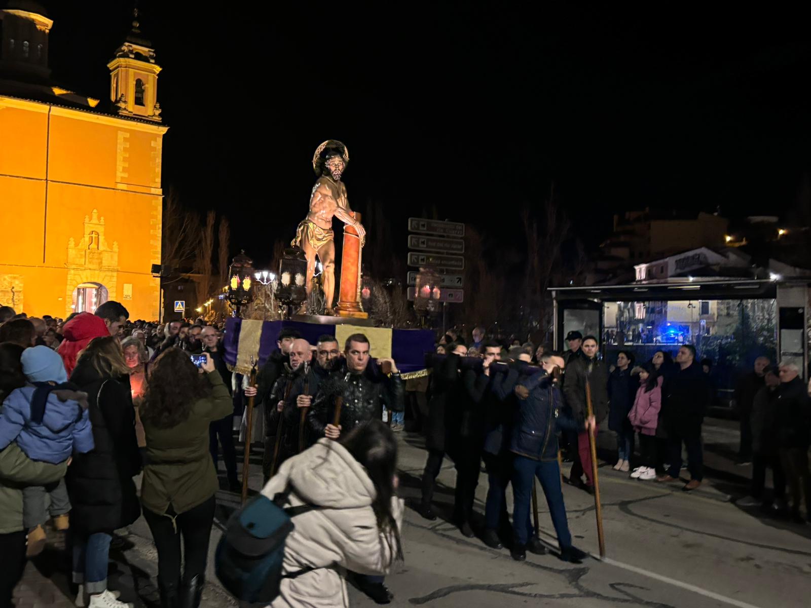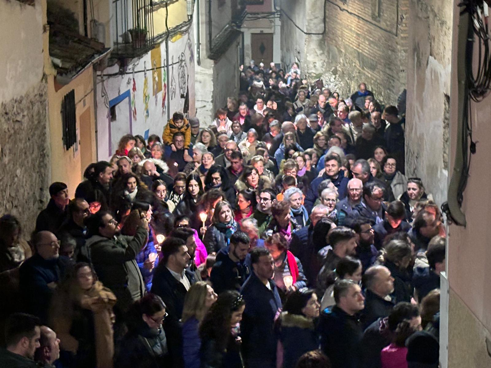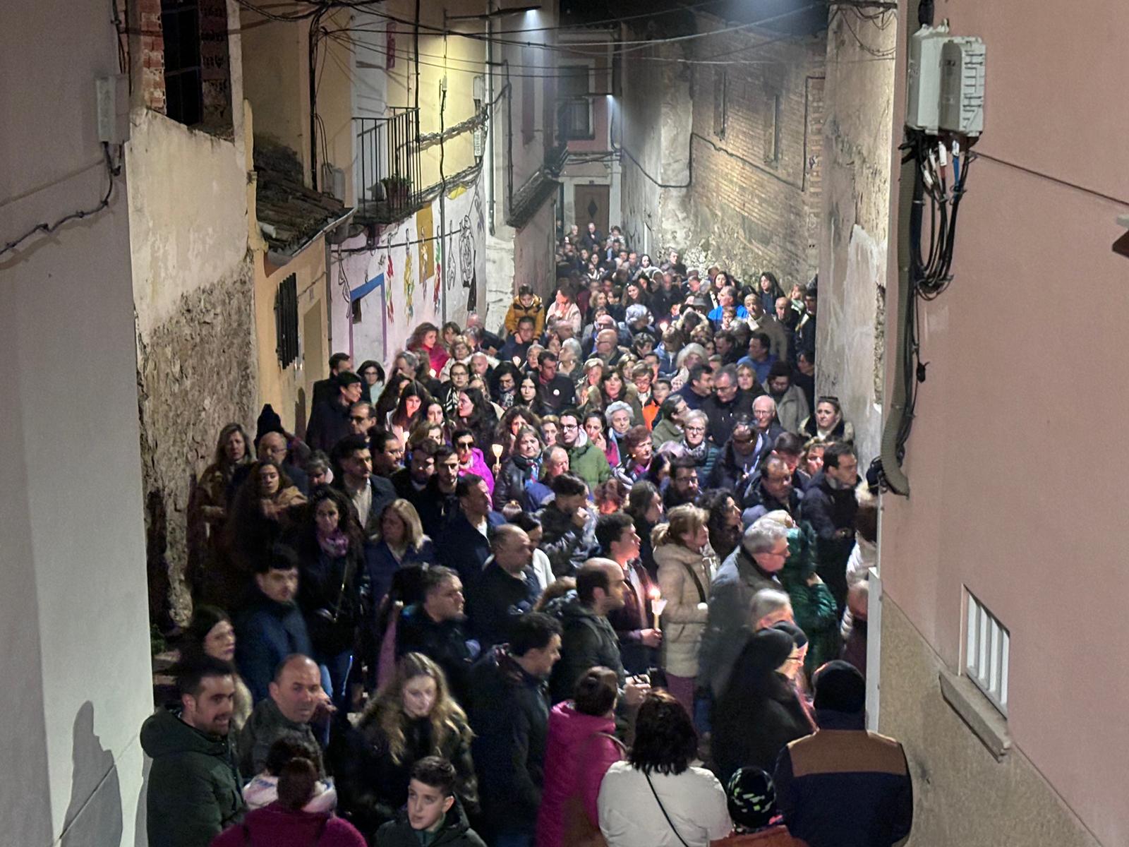 Una multitud ha acompañado a Jesús Amarrado a la Columna en su Vía Crucis por el barrio de San Antón en el primer viernes de Cuaresma, en una fría noche de oraciones y velas que han recordado a los conquenses que ahora sí que huele a cera.