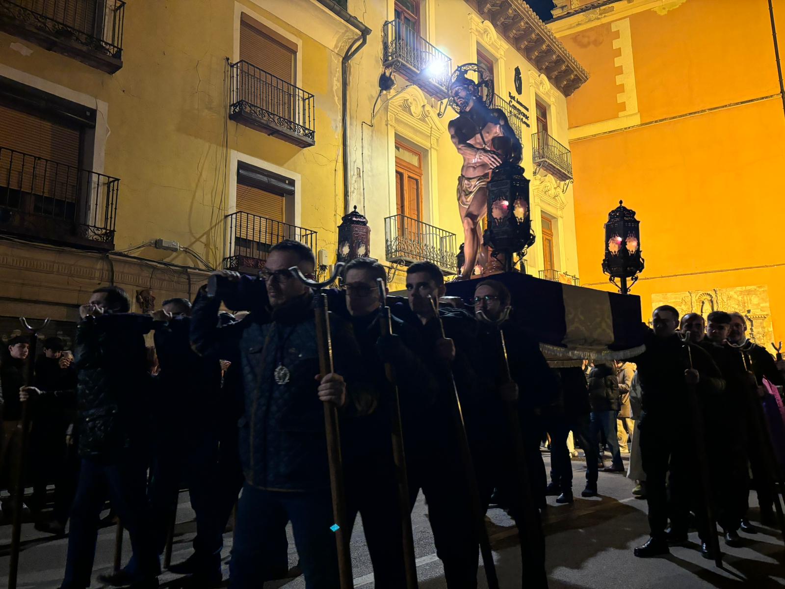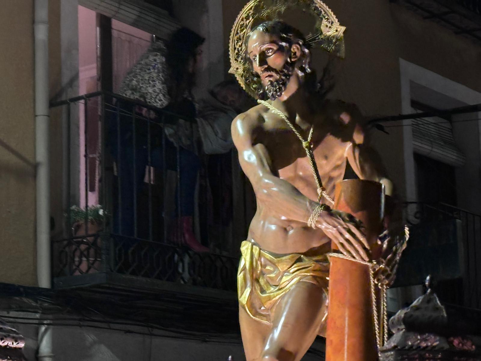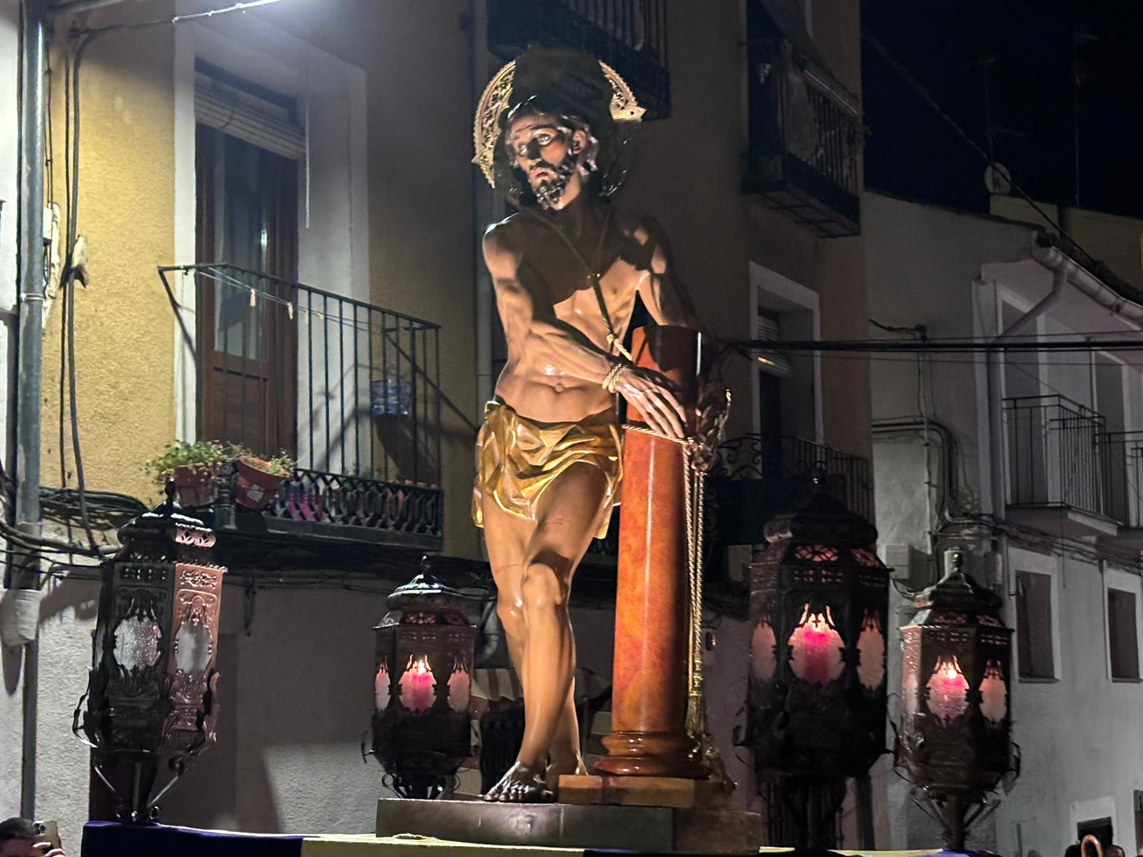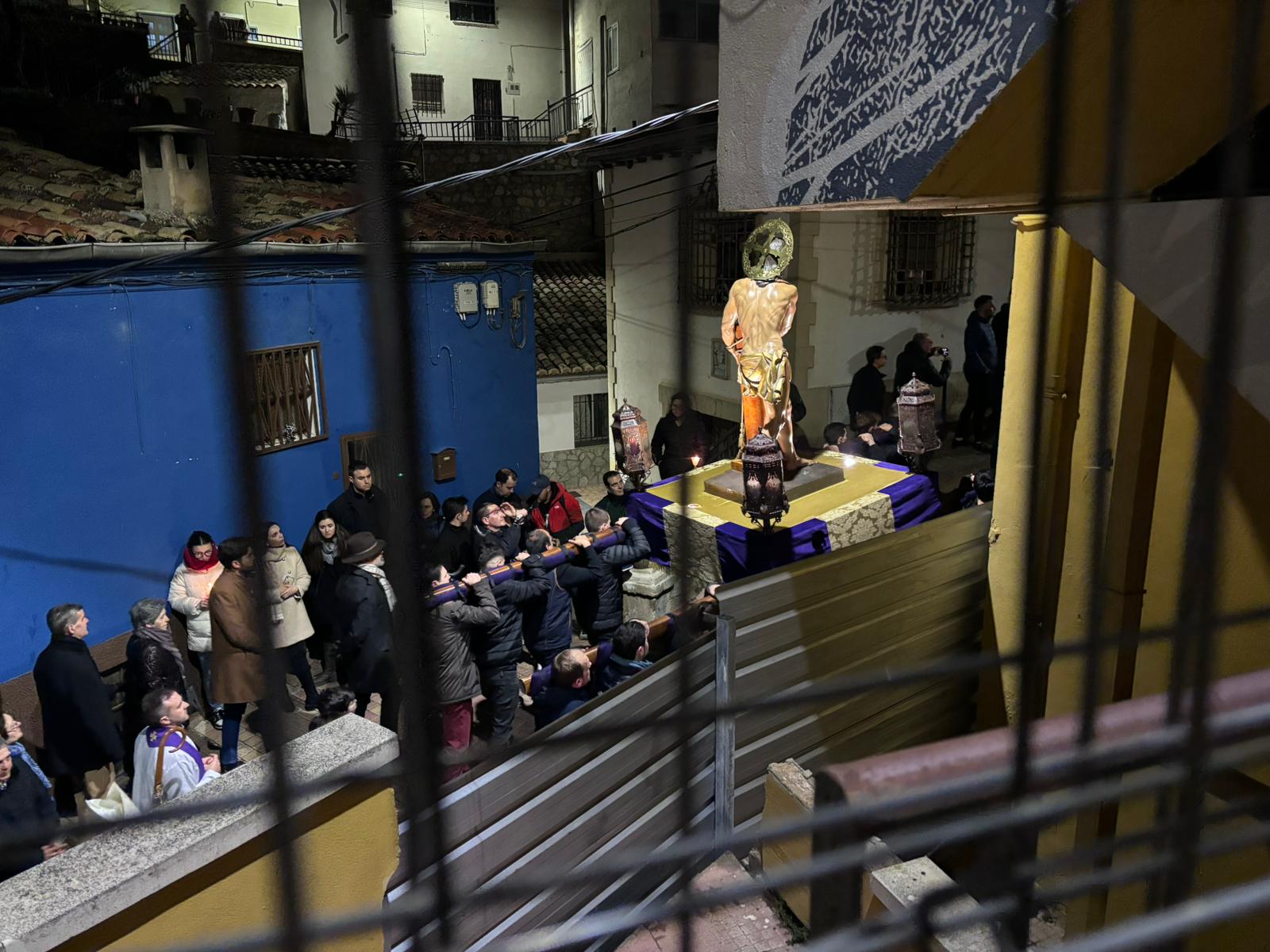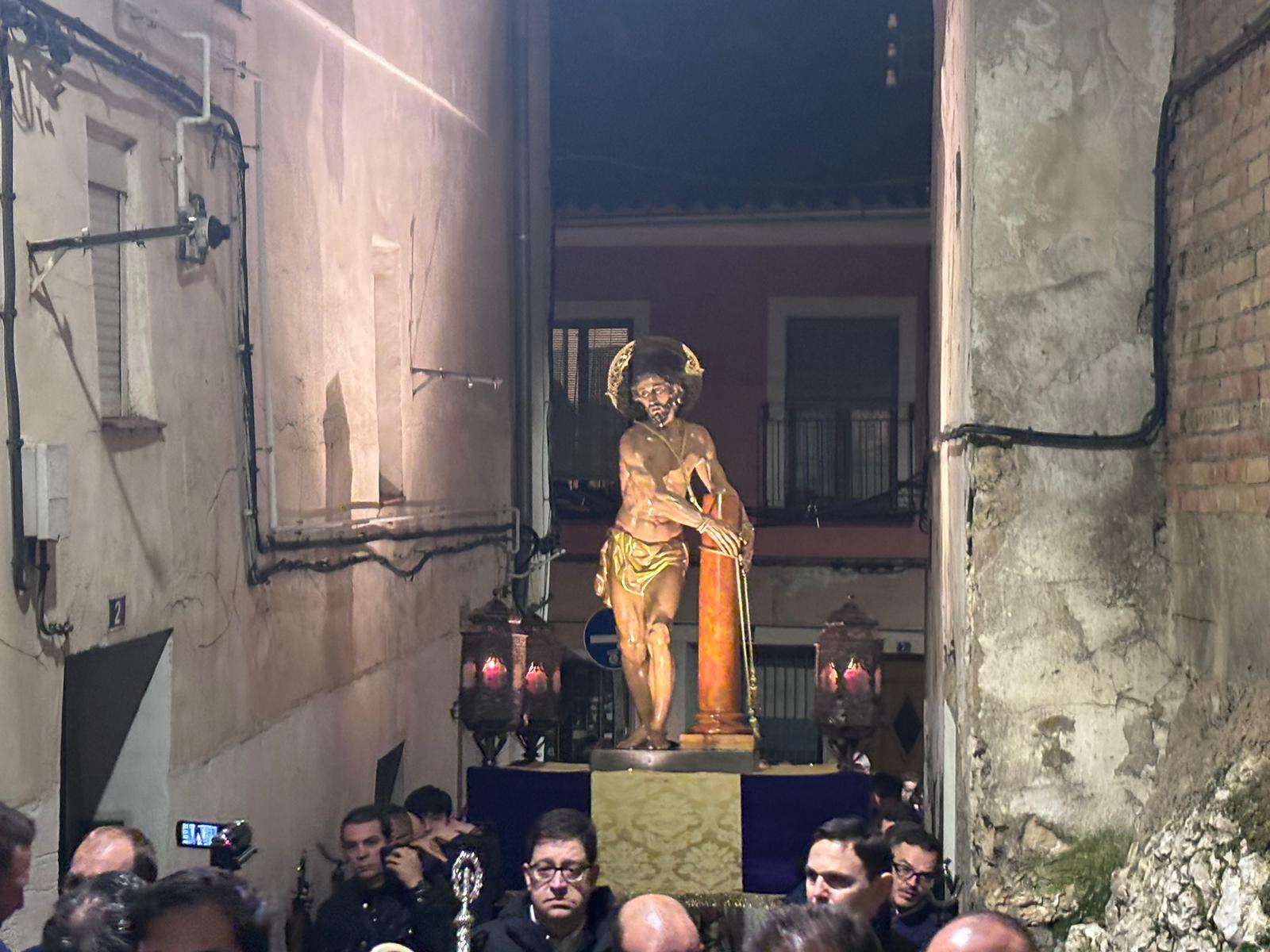 La comitiva penitencial ascendió hasta lo más alto de San Antón a ritmo ceremonioso y con pausas para reflexionar sobre las lecturas de cada una de las estaciones. Cumplidas las estaciones, el Amarrado volvió a desplazarse entre callejuelas con paredes ornamentadas de grafitis y cables para regresar a su templo de origen, recibido nuevamente por la Cuenca nazarena que ha hecho suya esta cita anual de la hermandad del Jesús Amarrado a la Columna.