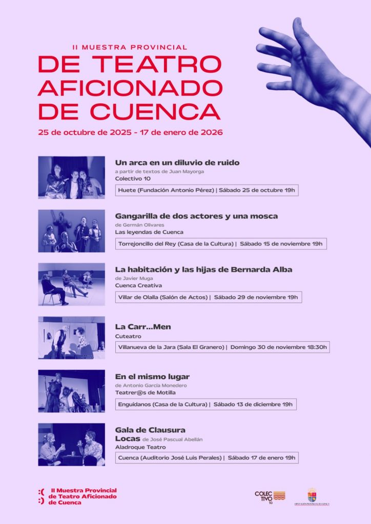 Organizada por Colectivo 10 con el apoyo de la Diputación de Cuenca, esta segunda edición se desarrollará entre octubre de 2025 y enero de 2026, consolidándose como un espacio de encuentro y exhibición no competitivo para los grupos de teatro aficionado de la provincia.