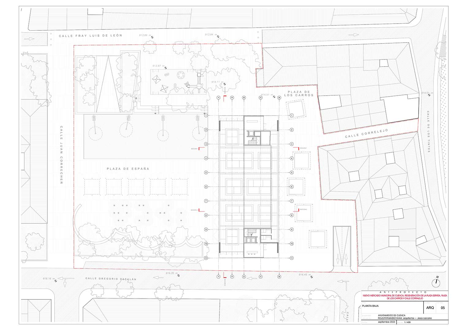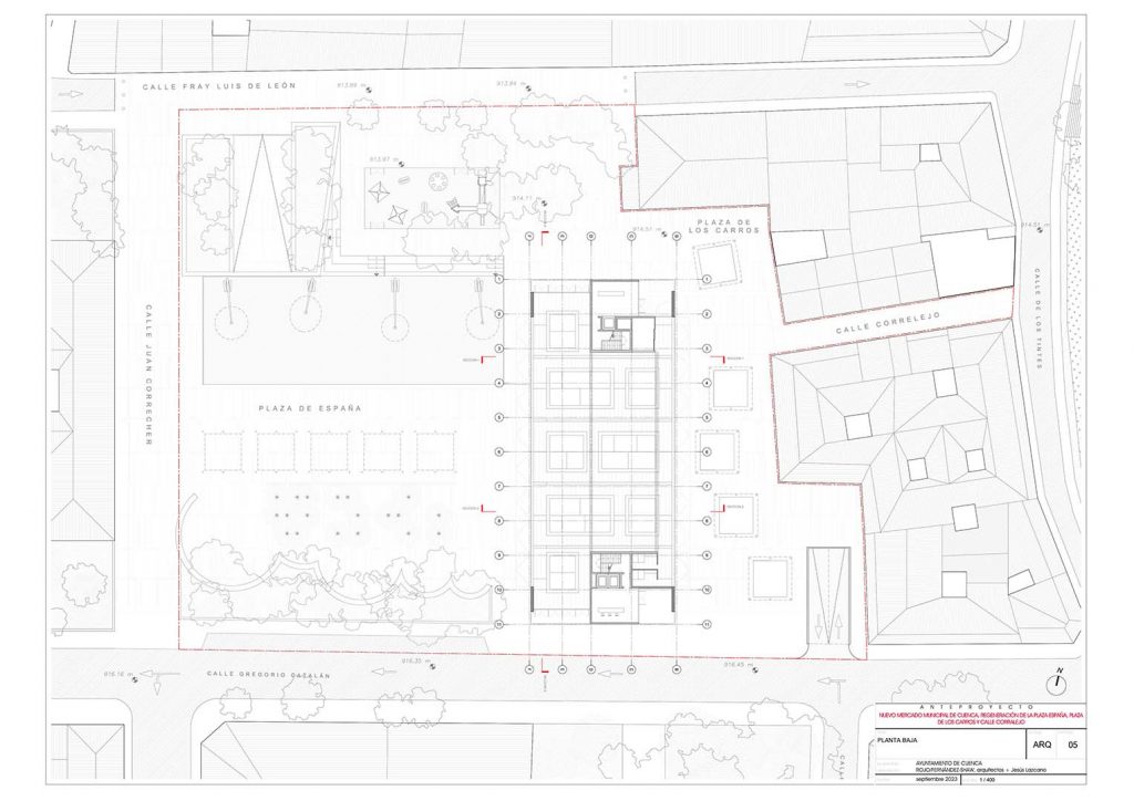 El proyecto presentado por los arquitectos Begoña Fernández-Shaw, Jesús Lazcano López y Luis Rojo de Castro a este concurso, que se lanzó en 2022, propone una estrategia de actuación en el conjunto de elementos que componen zona de la ciudad: Plaza de los Carros y calle Corralejo, el nuevo edificio Municipal, la Plaza de España, las calles Juan Correcher y Fray Luis de León y el aparcamiento subterráneo.
