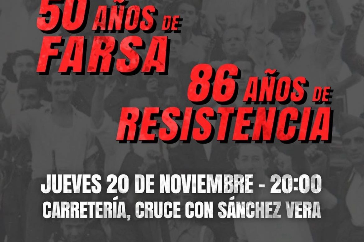 El día 20 de noviembre, en el cruce de las Calles Carretería y Sánchez Vera se llevará a cabo una concentración convocada por el Colectivo Académico 13 Rosas (CA13), esta se encuadra en la programación del “noviembre antifascista”, organizado bajo el lema “50 años de farsa, 86 años de resistencia””.