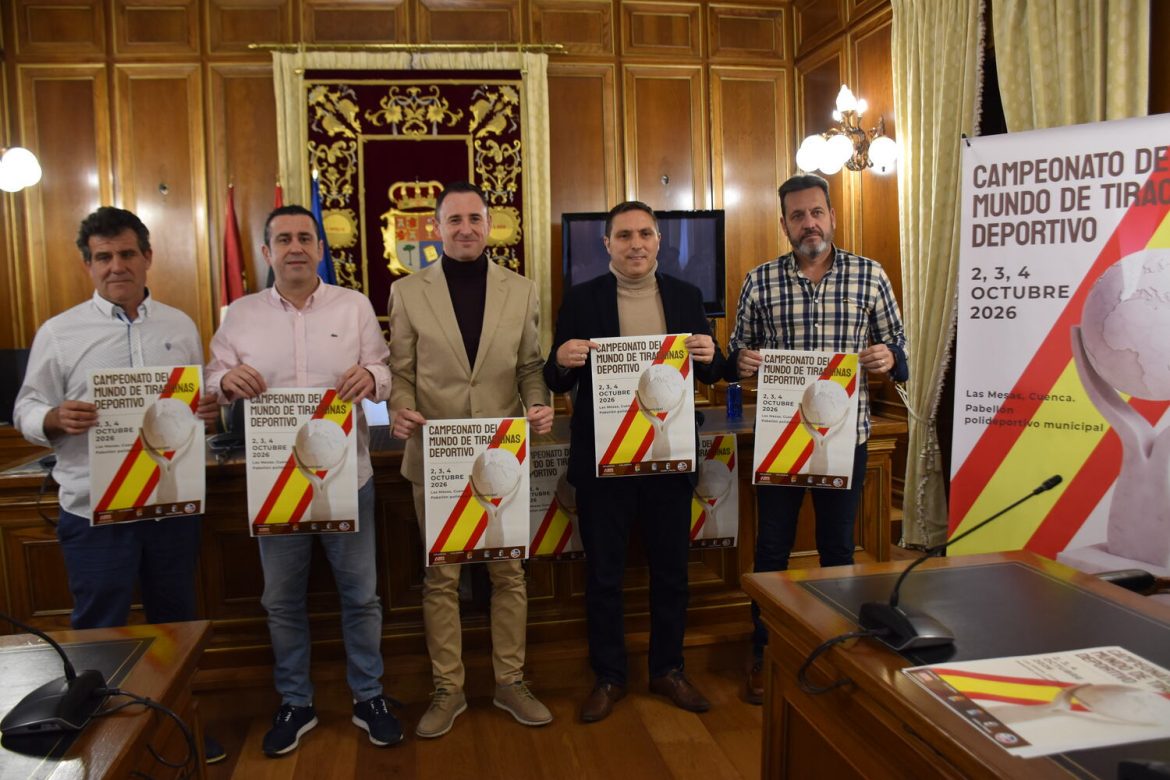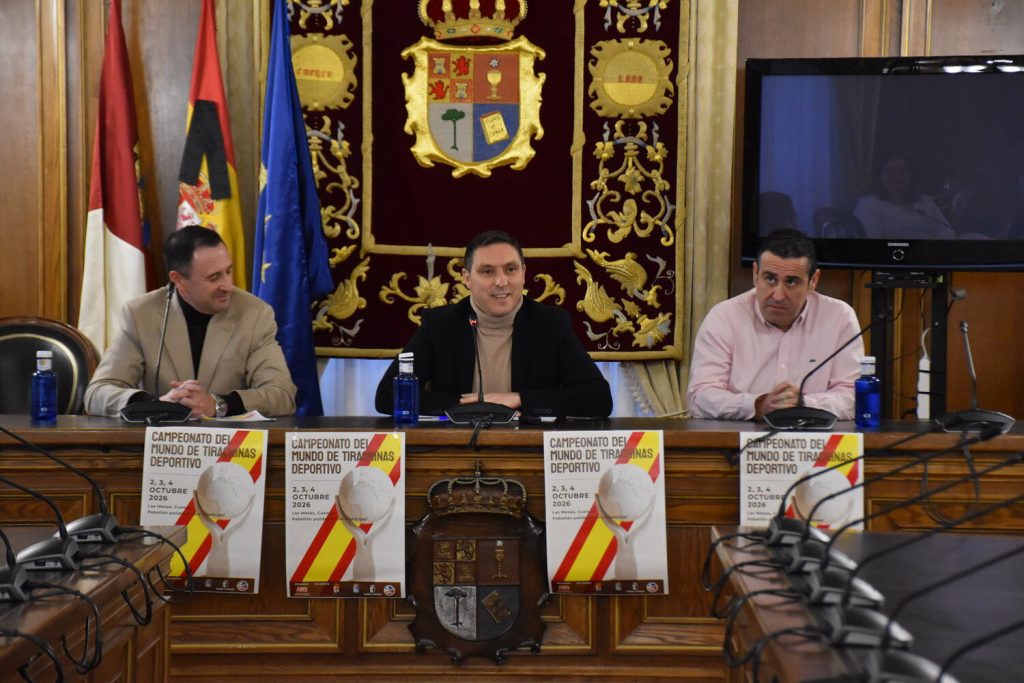 El presidente de la Diputación de Cuenca, Álvaro Martínez Chana; el alcalde de Las Mesas, Carlos Algaba; y el presidente de la Asociación Española de Tirachinas Deportivo, Óscar Collado; han presentado en el Palacio Provincial la tercera edición del Campeonato Mundial de Tirachinas que, en esta ocasión, se celebrará en la localidad de Las Mesas del 2 al 4 de octubre de 2026.