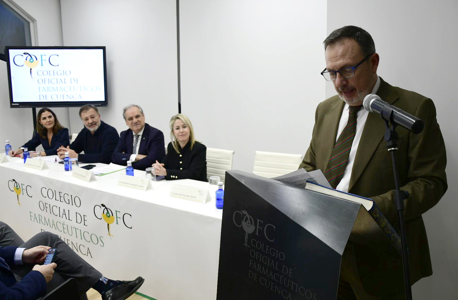 El acto contó con la presencia de Jesús Aguilar Santamaría, presidente del Consejo General de Colegios Oficiales de Farmacéuticos, así como con representantes de institucionales locales y regionales y miembros de la Consejería de Sanidad de Castilla-La Mancha, también, la nueva junta de gobierno estuvo arropada con la representación de los colegios oficiales de farmacéuticos de la región, representados por el Presidente del Colegio de farmacéuticos de Toledo, D. Francisco Javier Jimeno Gil, el Presidente del Colegio de farmacéuticos de Albacete, D. Pablo Silvestre Molina y la Presidenta del Colegio de farmacéuticos de Guadalajara y también presidenta del COFCAM, Dª María Concepción Sánchez Montero, una muestra de colaboración entre la administración y el sector farmacéutico.