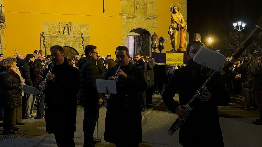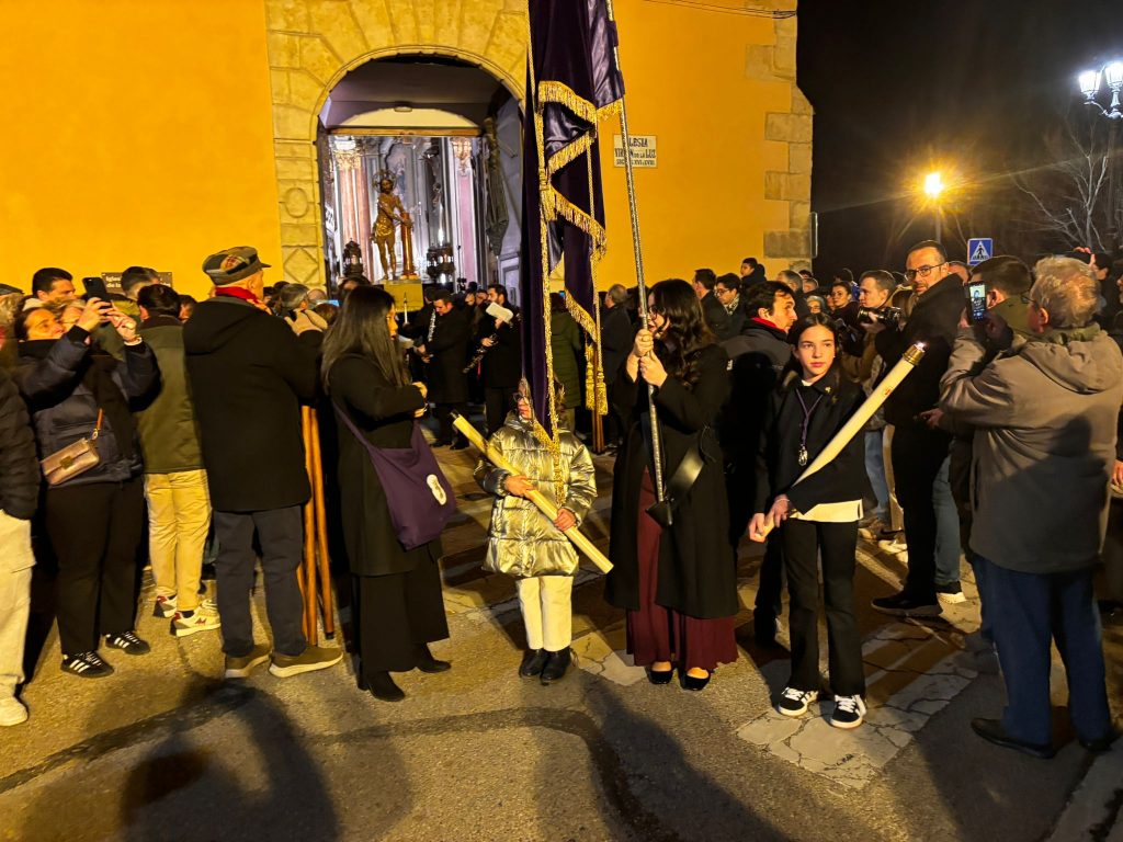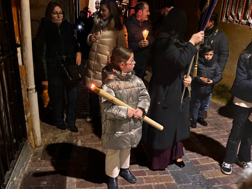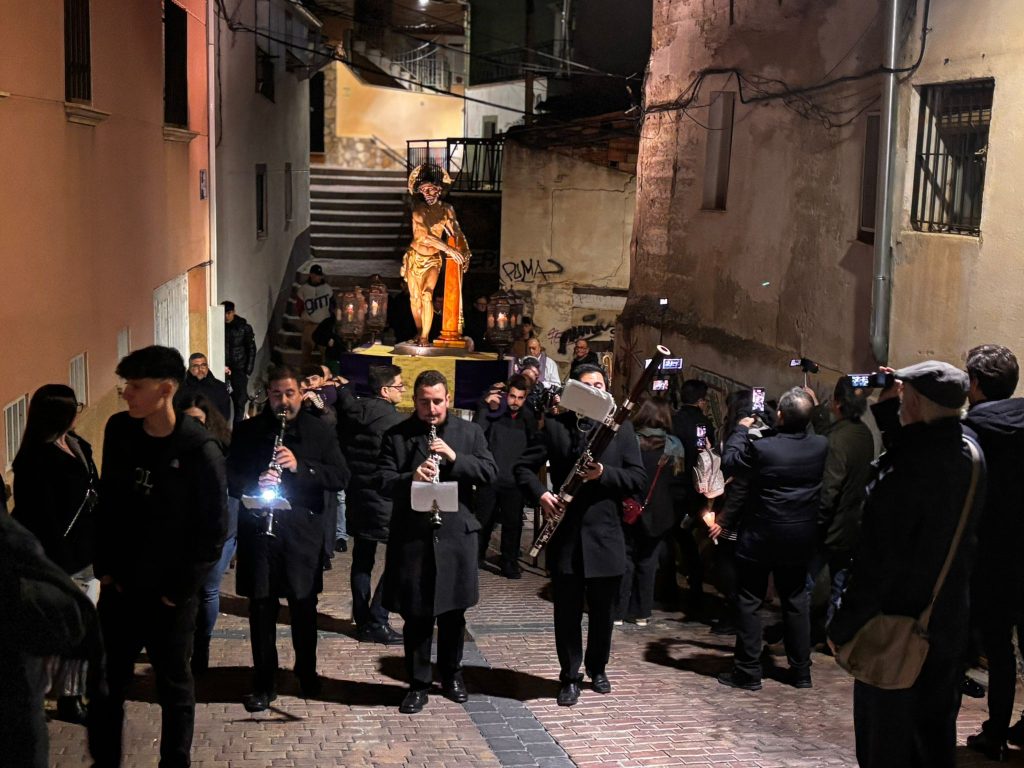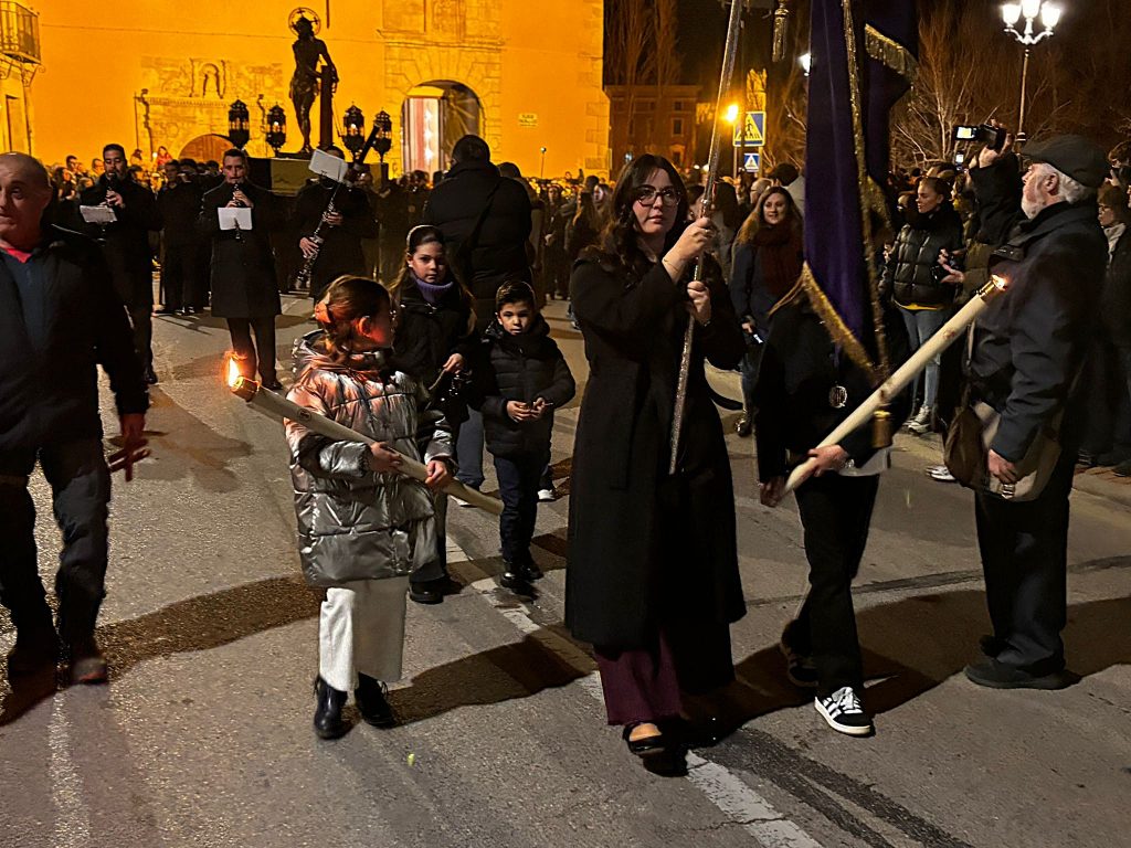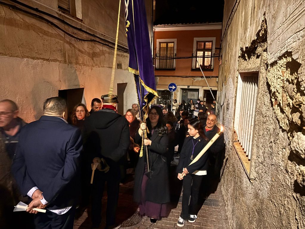 Un trío de la Capilla de Cuenca ha guiado a los banceros por las catorce estaciones de este Vía Crucis del ‘Amarrao’- En el cortejo han participado hermanos del Amarrado, representantes de la Archicofradía de Paz y Caridad y vecinos llegados de toda la ciudad, además de “amigos” de la Semana Santa conquense como Tomás Bux, autor del cartel anunciador del vía crucis de este año.
