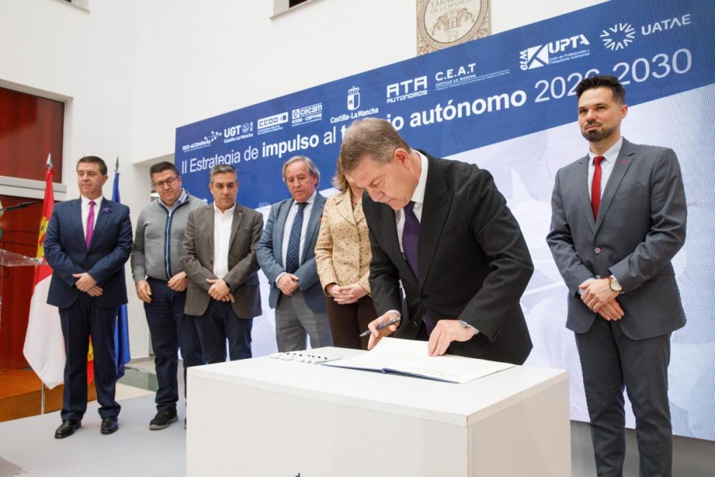 El presidente de Castilla-La Mancha, Emiliano García-Page, ha firmado esta mañana en Tarazona de la Mancha la II Estrategia de Impulso al Trabajo Autónomo 2026-2030 de la región, una nueva hoja de ruta que pone su mirada en el final de la década y prevé una inversión de 100 millones de euros para continuar construyendo un ecosistema emprendedor y de apoyo a la actividad de las personas trabajadoras autónomas en Castilla-La Mancha. “La actividad de las personas trabajadoras autónomas genera economía y riqueza en nuestro territorio, y lo hace además vertebrando socialmente nuestra región, porque fijan población y cohesionan nuestra comunidad autónoma”, ha indicado la consejera.