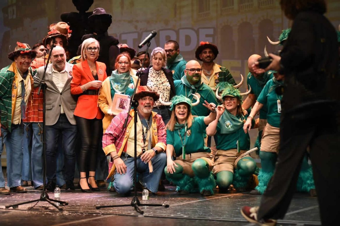 La jornada comenzó con la actuación de la chirigota de Cuenca, que este año se presentó bajo el nombre de “Los de Verde”, desvelando por fin el misterio de su tipo. Una propuesta cargada de ironía y creatividad que combinaba un vestuario con una mezcla entre excursionista y toro, cuernos incluidos, en un guiño humorístico al futuro parque que se proyecta en la ciudad. Con ese juego de sátira y humor tan característico del carnaval, la agrupación ofreció un repertorio que volvió a evidenciar su crecimiento año tras año, ganándose el aplauso de un teatro prácticamente lleno que respondió con una gran ovación cuando interpretaron su última letra a capela.