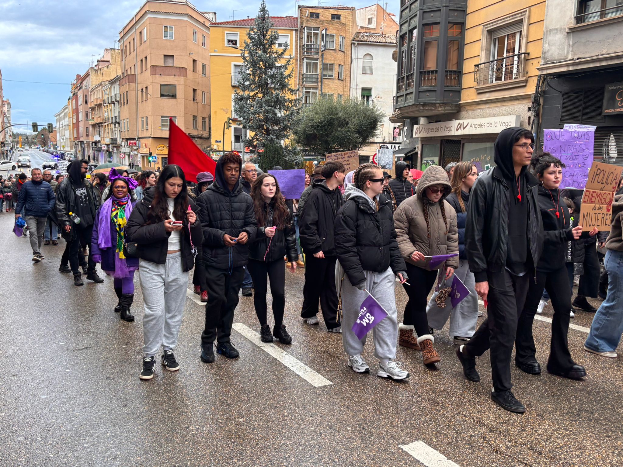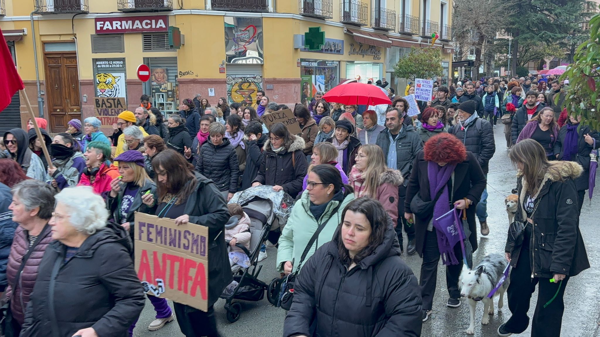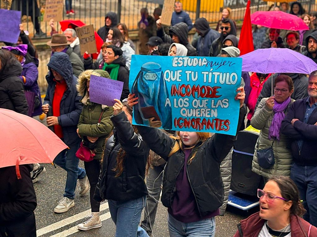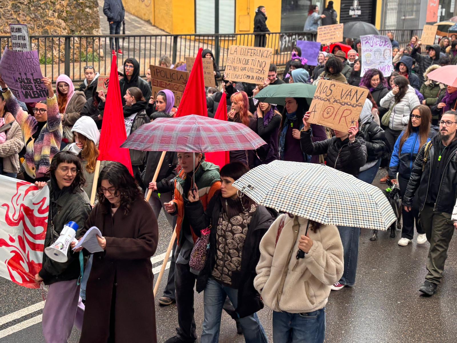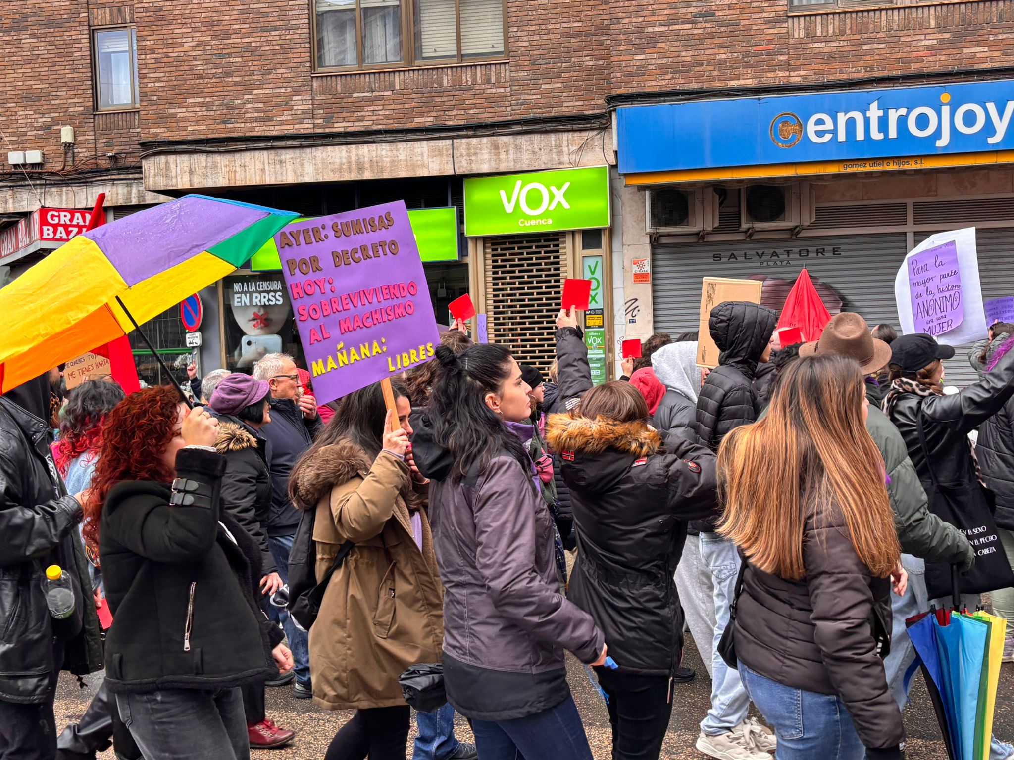 En esta marcha, los participantes en la manifestación han señalado a Vox como una de las formaciones que están contribuyendo al auge del fascismo y del antifeminismo. Al pasar delante de su sede, los asistentes dedicaron una sonora pitada y mostraron tarjetas rojas en dirección a su fachada al partido liderado a nivel nacional por Santiago Abascal, que este año no instaló mesa informativa en Carretería como hizo el 8 de marzo del año pasado.