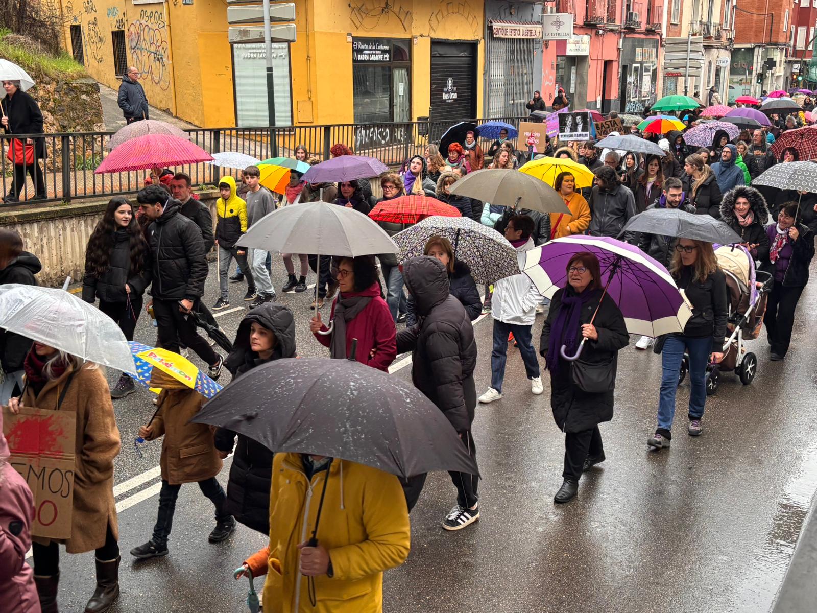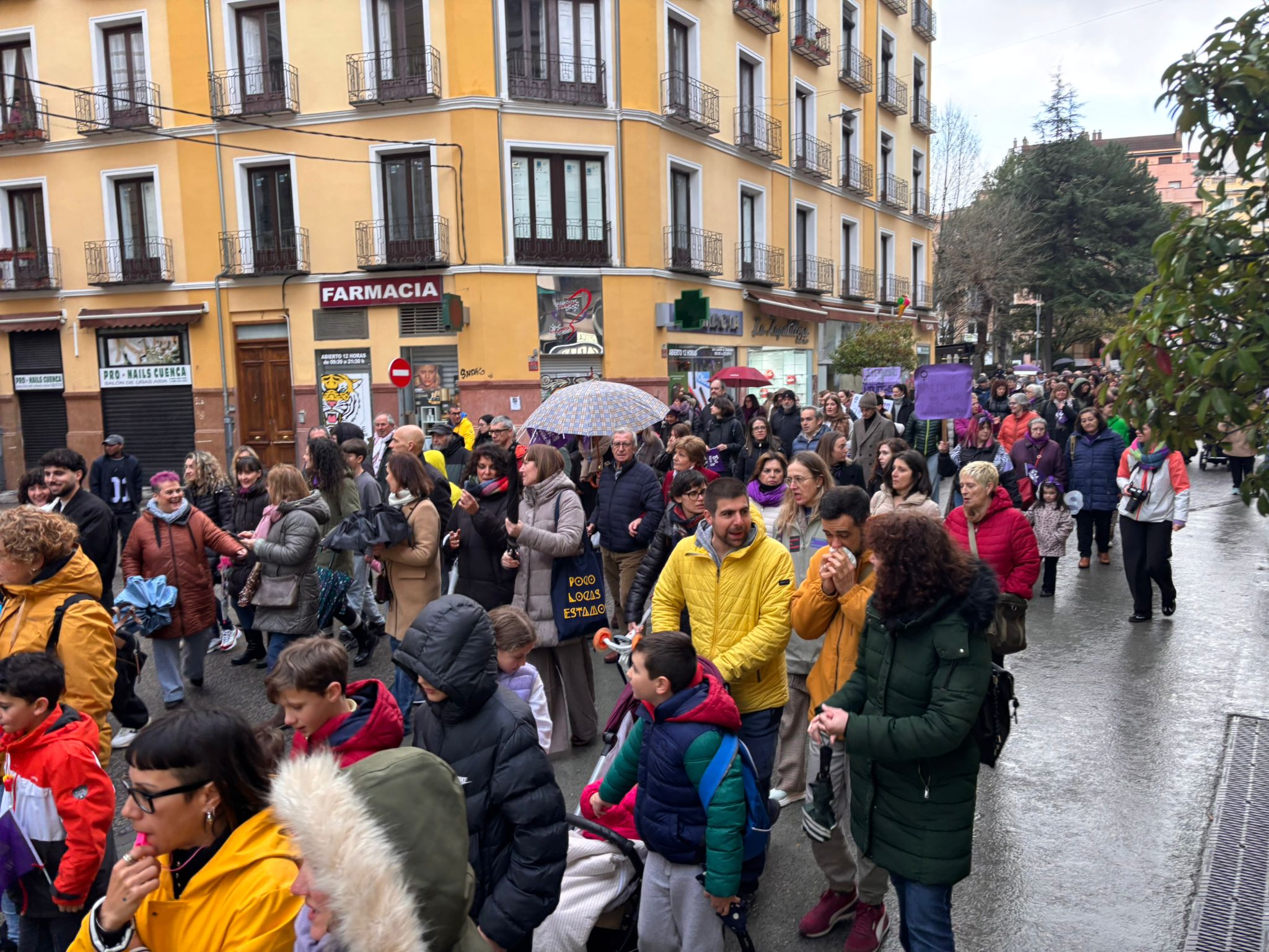 Cientos de conquenses, especialmente mujeres jóvenes, han participado este domingo en la manifestación del 8M, Día de la Mujer, que ha transcurrido desde la Plaza de Toros de Cuenca hasta la Plaza de España con una ligera lluvia durante gran parte del recorrido, lo que ha obligado a sujetar con una mano las pancartas y con otra los paraguas.