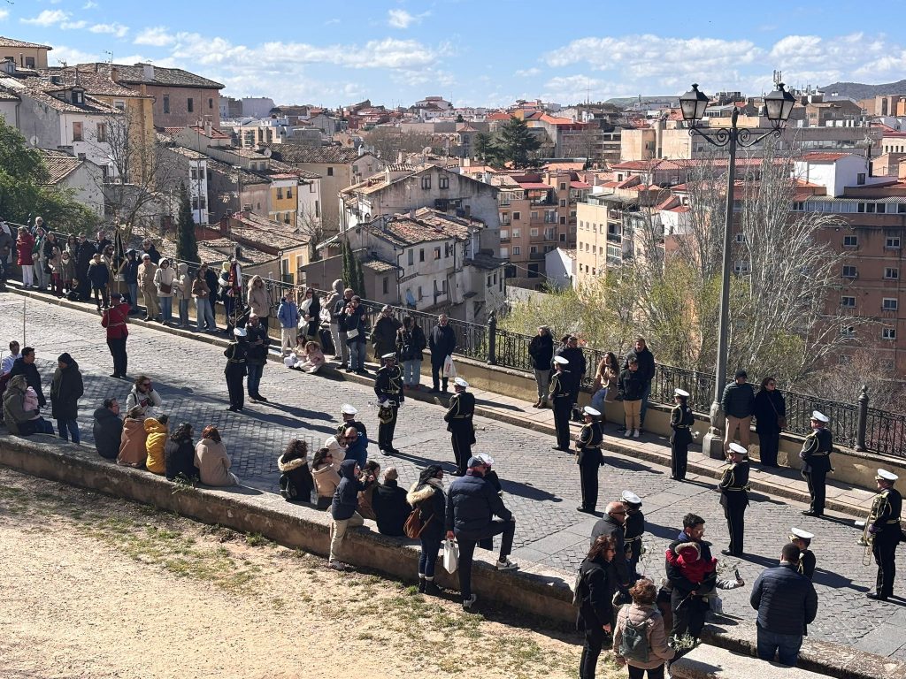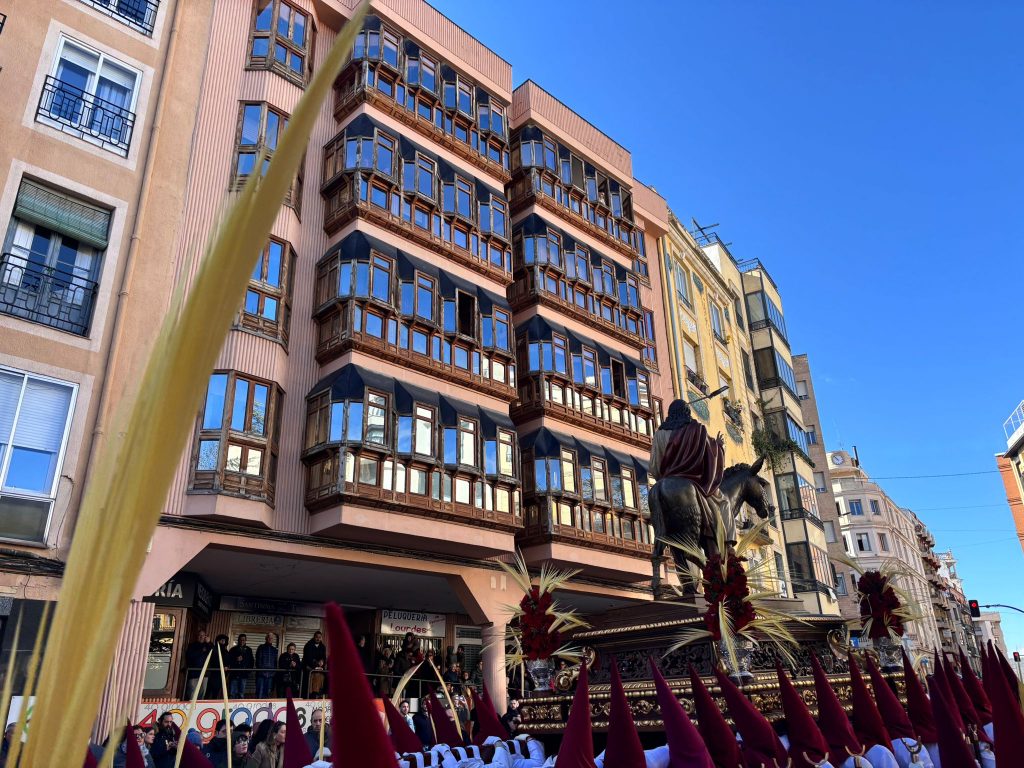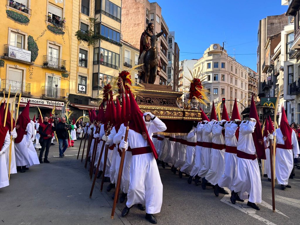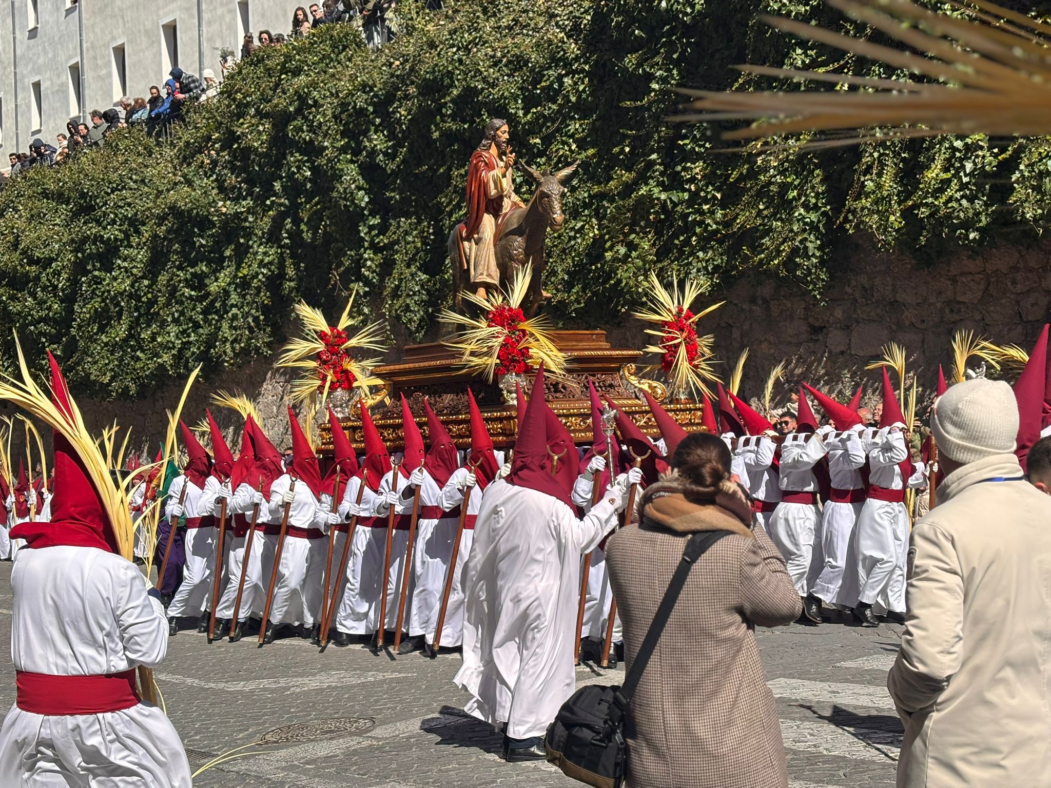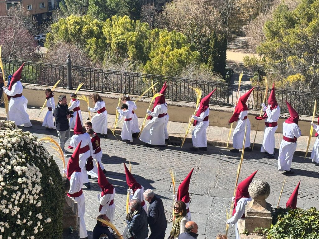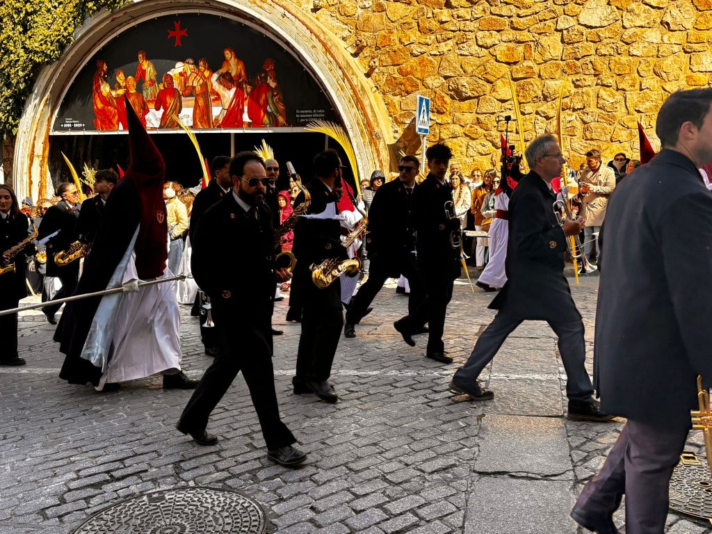 Tras el complicado descenso por las escaleras de esta plaza, que nos recuerdan todo el esfuerzo que hay detrás de este paseo triunfal del Domingo de Ramos, la comitiva se ha deslizado por el barrio de El Salvador bajo un sol brillante y una lluvia de campanadas. En la Puerta de Valencia, se han sumado más sonidos a la procesión, como los murmullos del río y de la gente y cálidas voces de las monjas de Las Concepcionistas, que abrigan con su canto a la procesión del Hosanna.