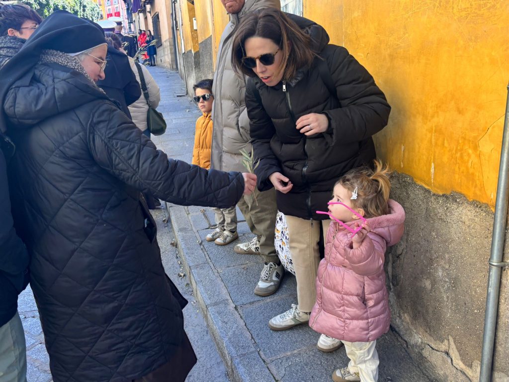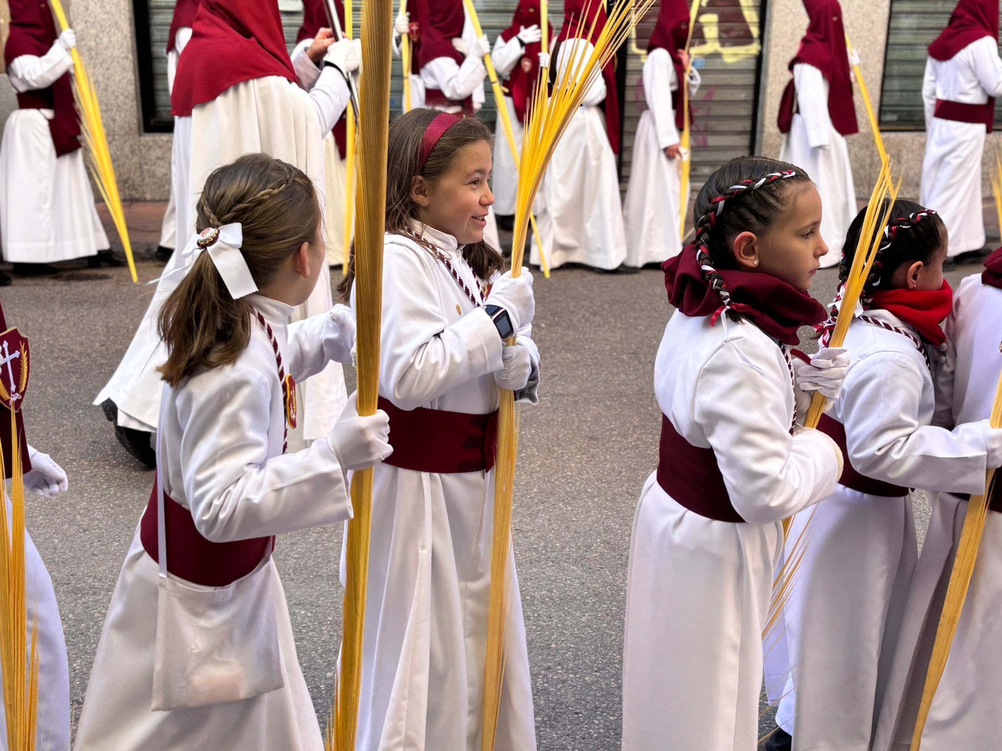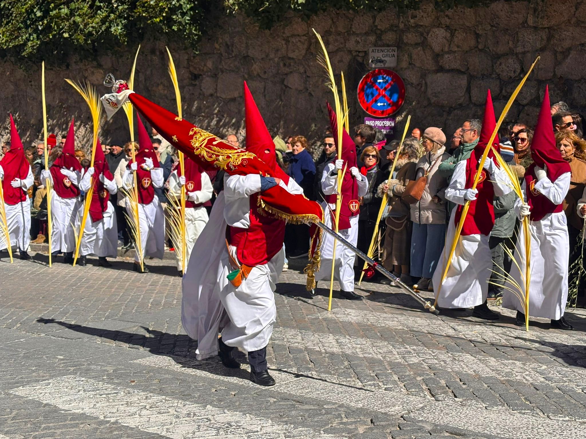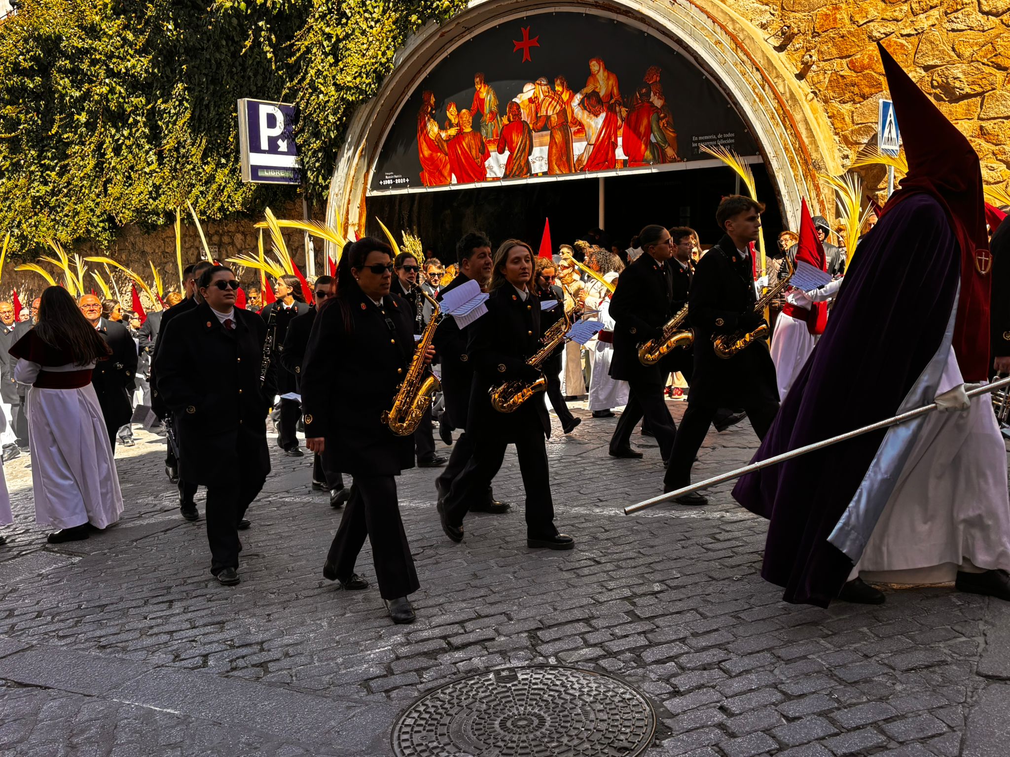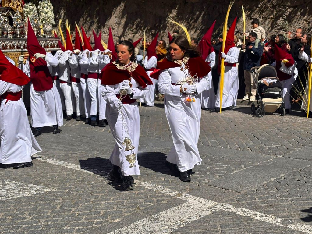Tras el complicado descenso por las escaleras de esta plaza, que nos recuerdan todo el esfuerzo que hay detrás de este paseo triunfal del Domingo de Ramos, la comitiva se ha deslizado por el barrio de El Salvador bajo un sol brillante y una lluvia de campanadas. En la Puerta de Valencia, se han sumado más sonidos a la procesión, como los murmullos del río y de la gente y cálidas voces de las monjas de Las Concepcionistas, que abrigan con su canto a la procesión del Hosanna.