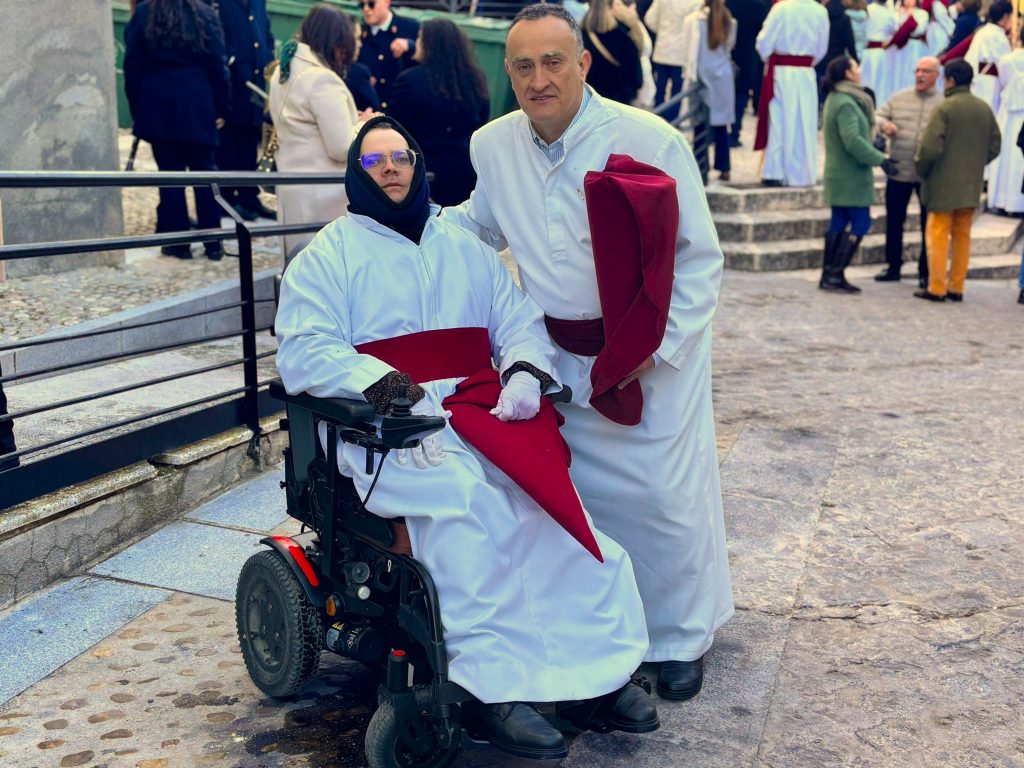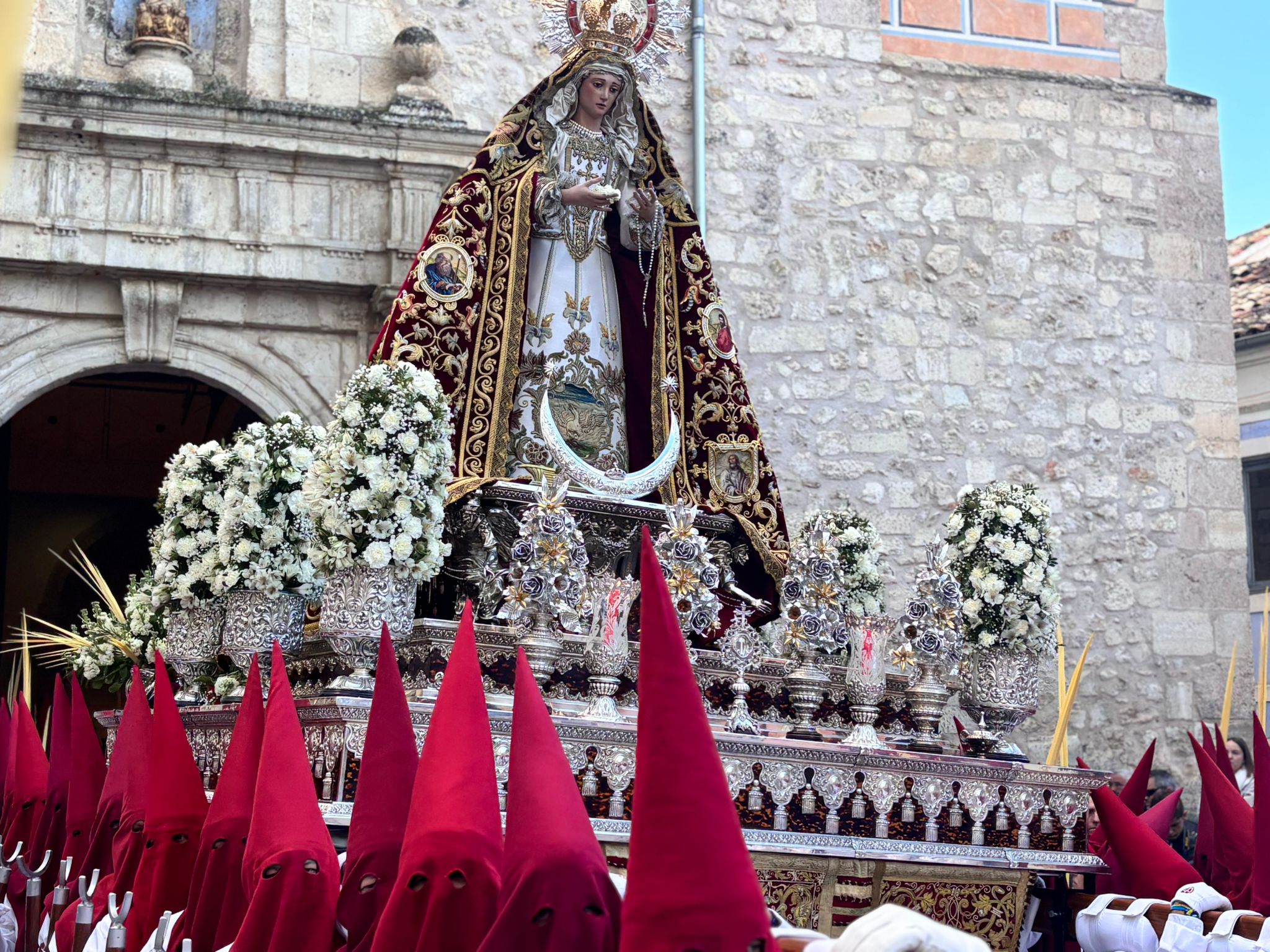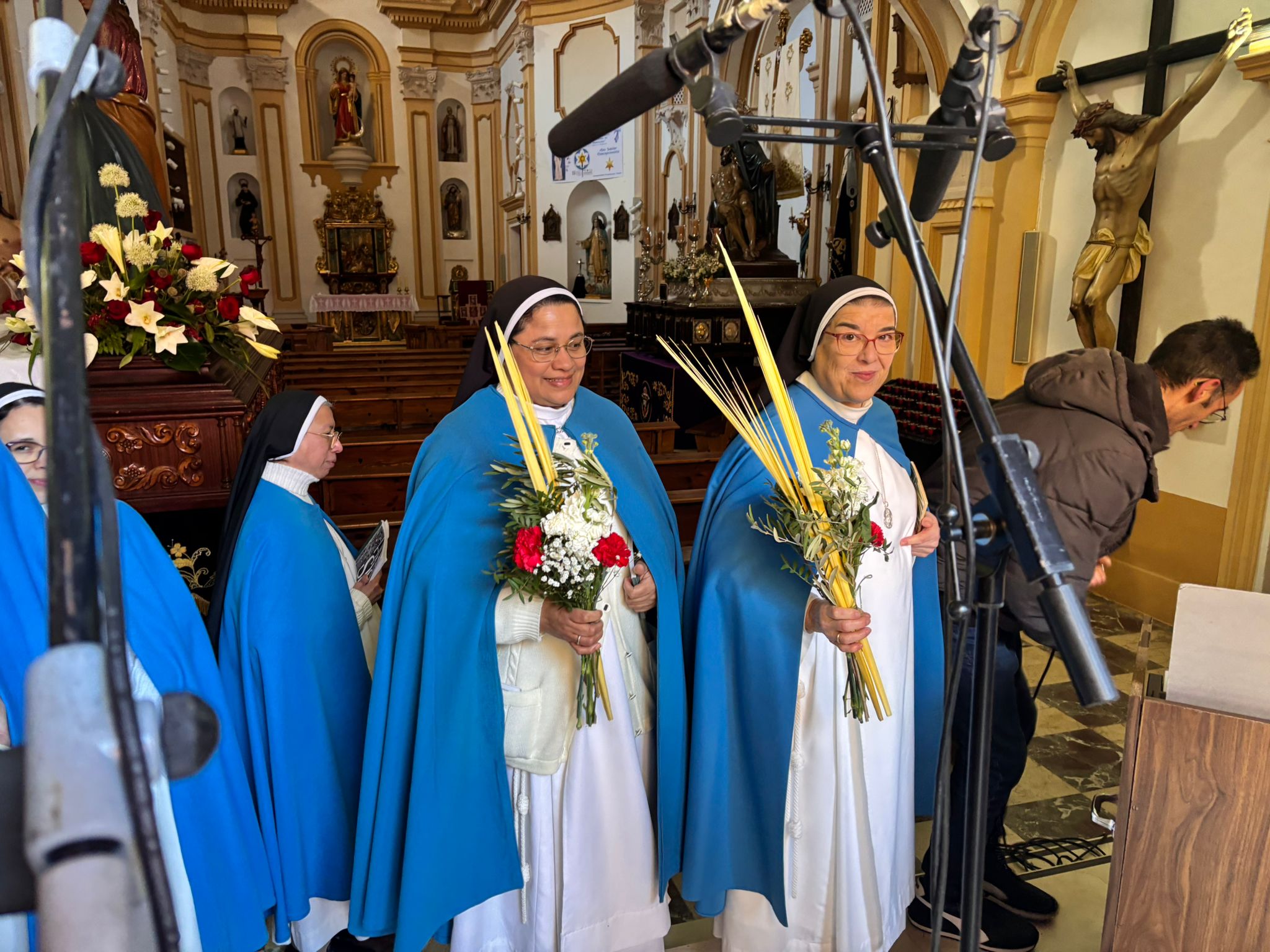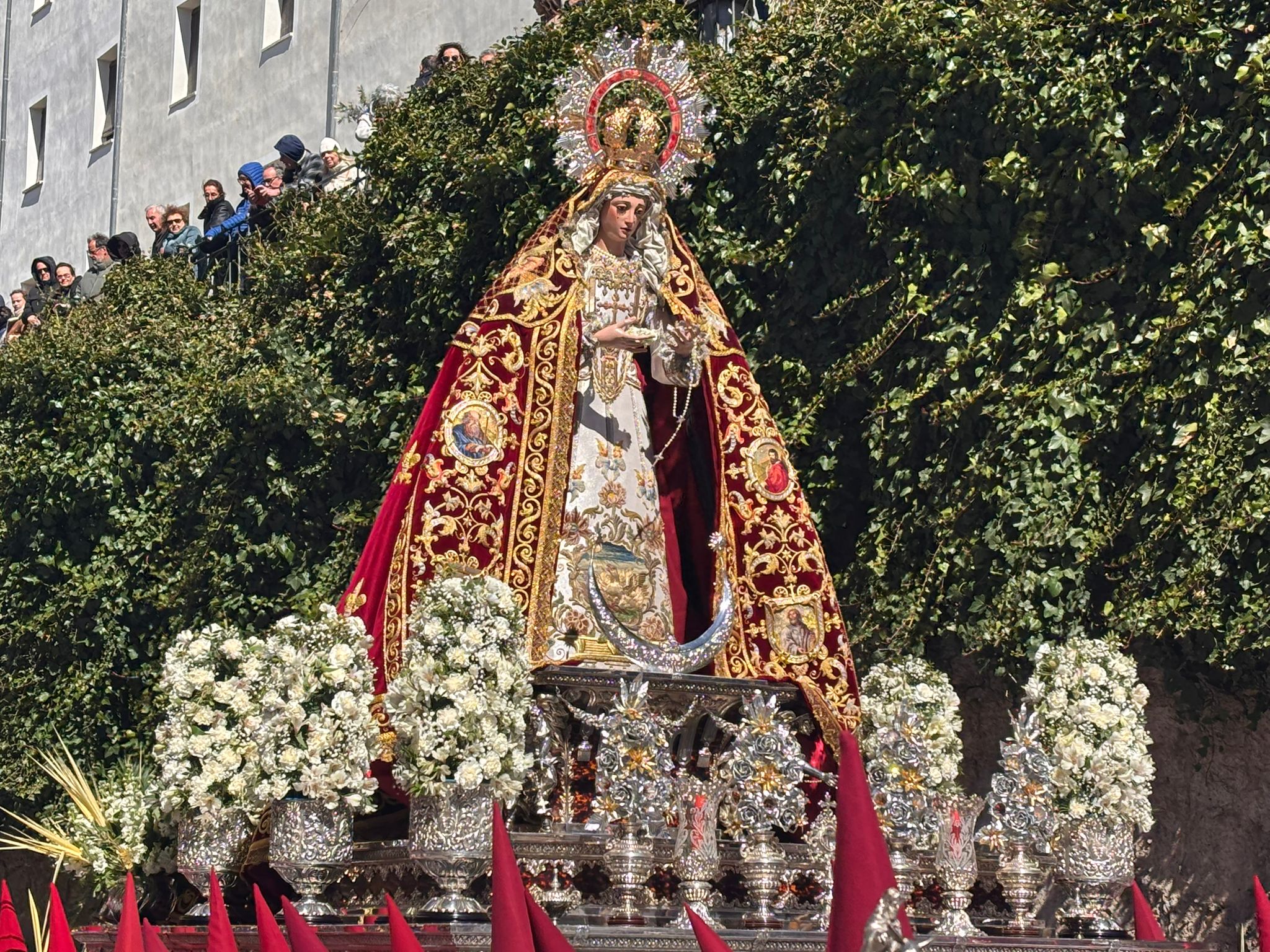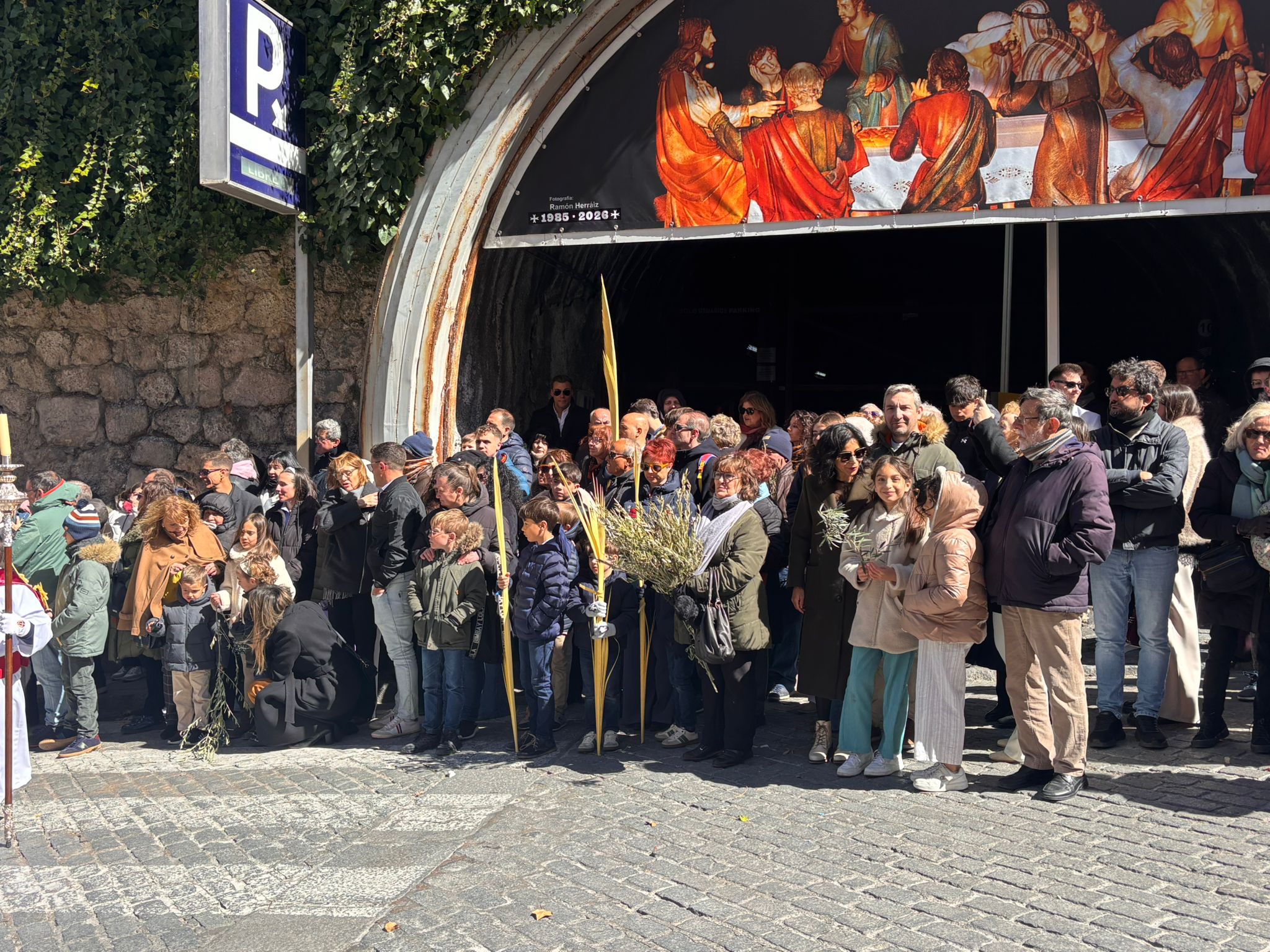 Tras el complicado descenso por las escaleras de esta plaza, que nos recuerdan todo el esfuerzo que hay detrás de este paseo triunfal del Domingo de Ramos, la comitiva se ha deslizado por el barrio de El Salvador bajo un sol brillante y una lluvia de campanadas. En la Puerta de Valencia, se han sumado más sonidos a la procesión, como los murmullos del río y de la gente y cálidas voces de las monjas de Las Concepcionistas, que abrigan con su canto a la procesión del Hosanna.