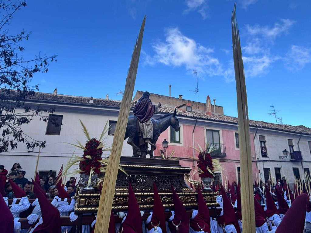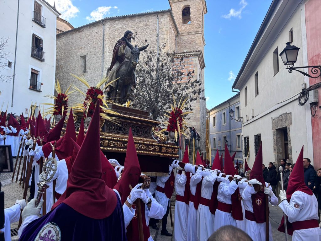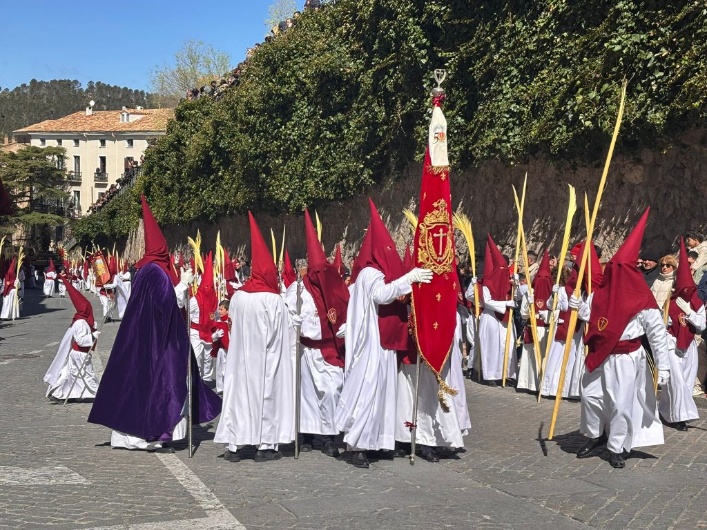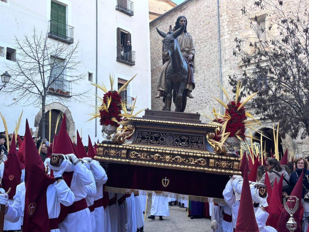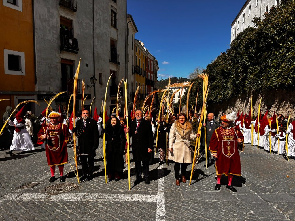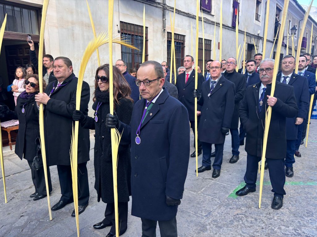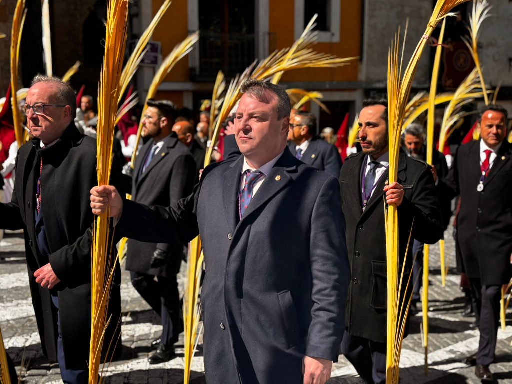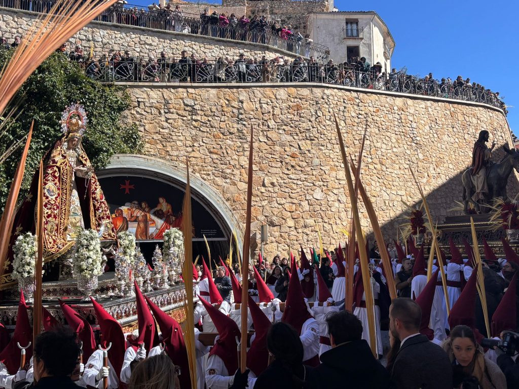 El obispo de Cuenca, José María Yanguas, pregonero de esta Semana Santa, mandó su bendición desde la escalinata antes de sumarse al cortejo procesional con una palma donada por San Juan Evangelista. Tras él desfilaban los miembros de la Corporación municipal y de la Junta de Cofradías, que en este día solo responden a la autoridad de este nazareno que demuestra que solo se pueden celebrar las victorias que llegan con la paz, no con las bombas.