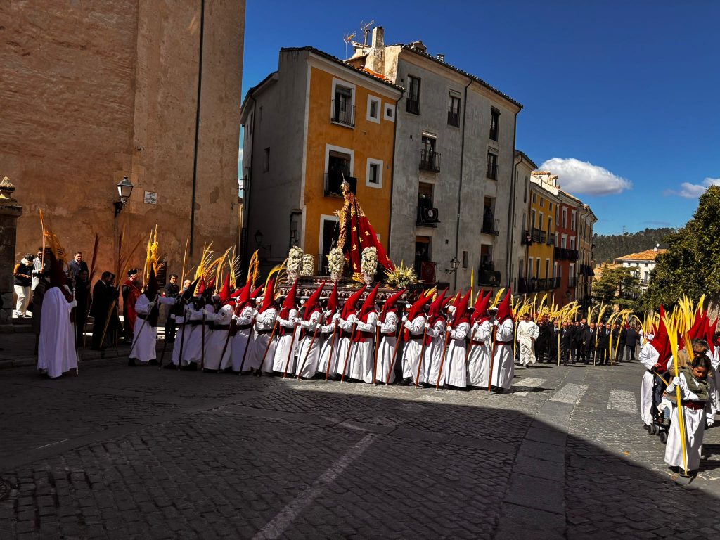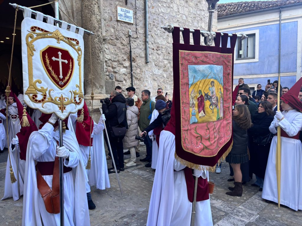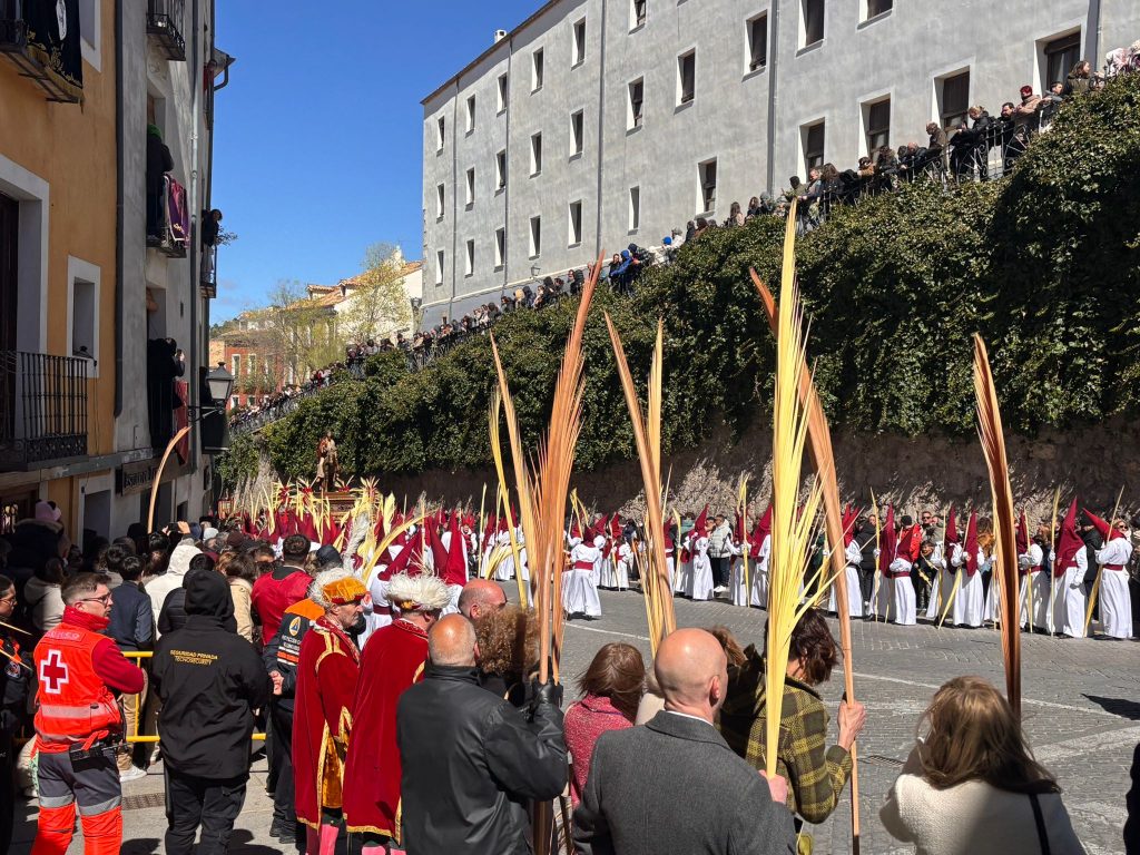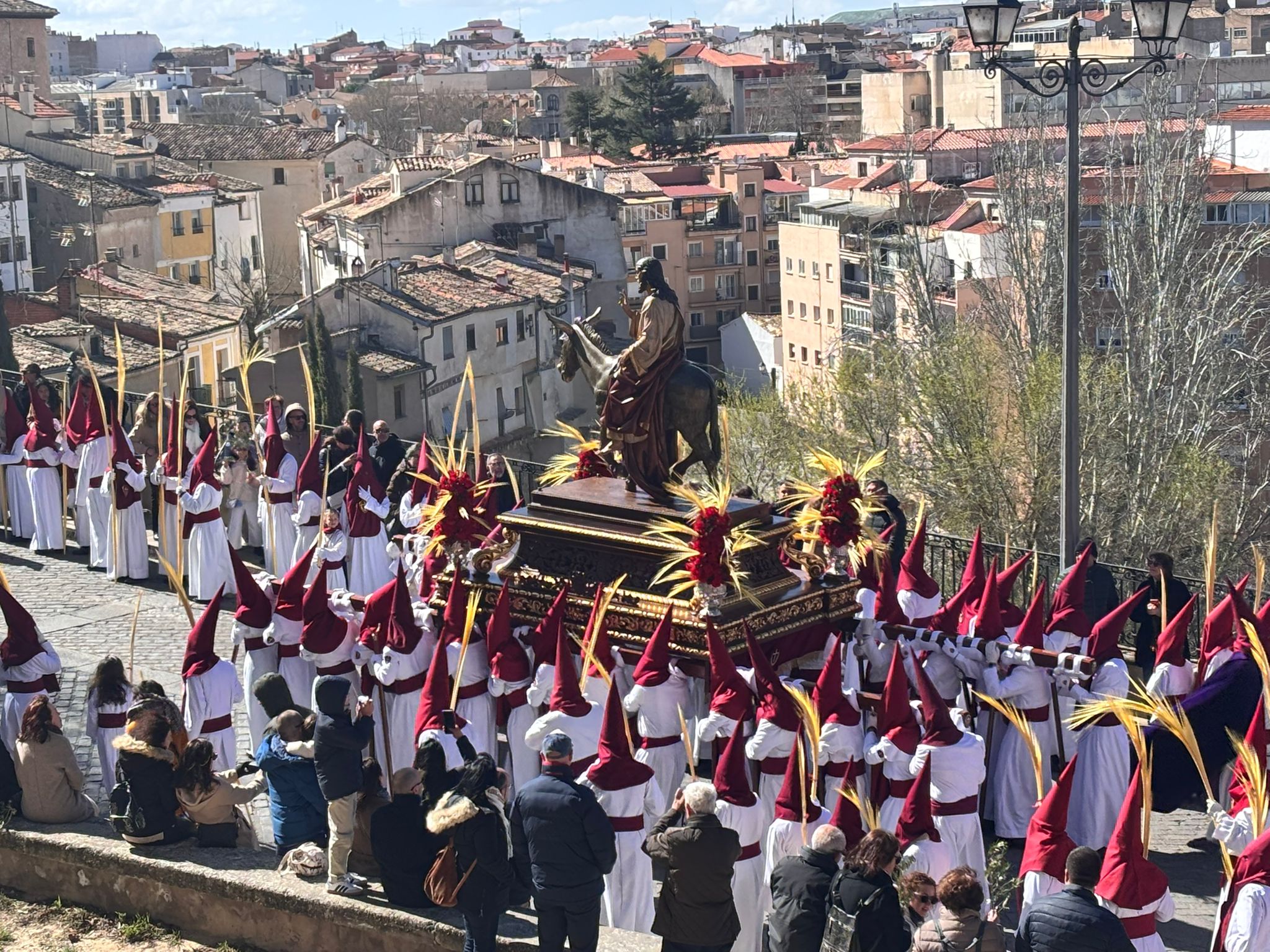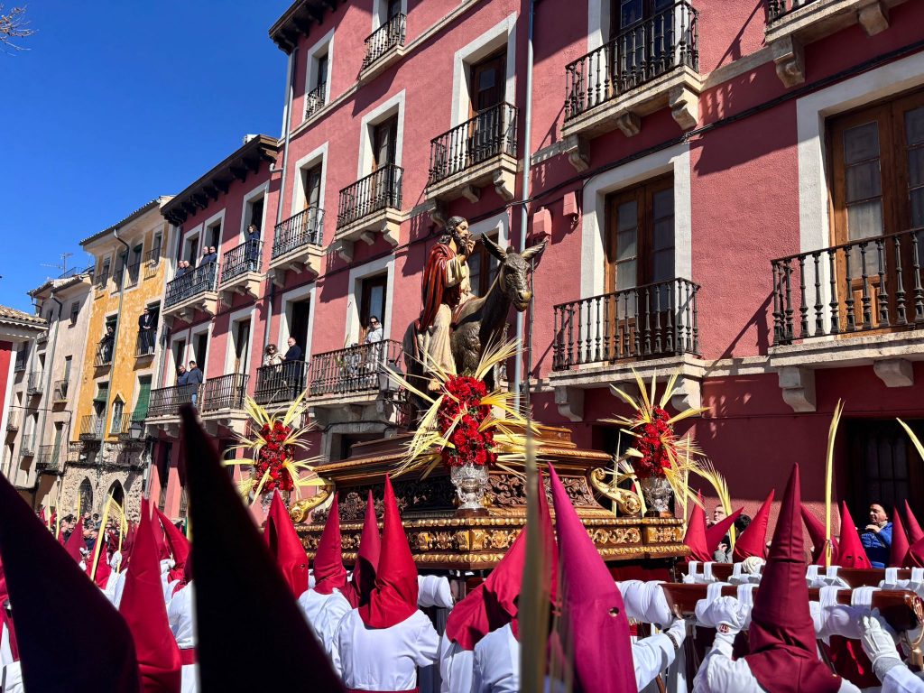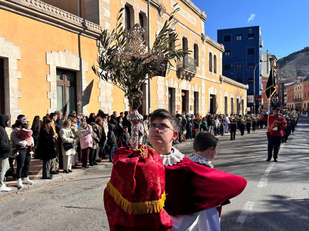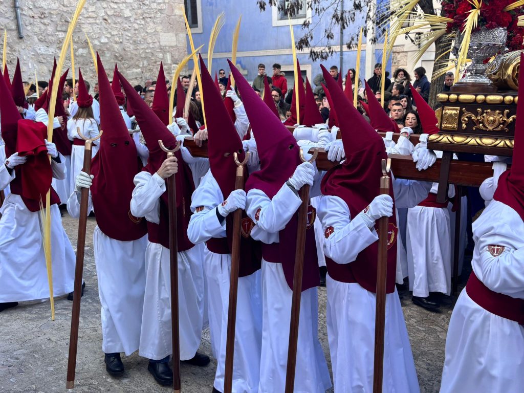 El obispo de Cuenca, José María Yanguas, pregonero de esta Semana Santa, mandó su bendición desde la escalinata antes de sumarse al cortejo procesional con una palma donada por San Juan Evangelista. Tras él desfilaban los miembros de la Corporación municipal y de la Junta de Cofradías, que en este día solo responden a la autoridad de este nazareno que demuestra que solo se pueden celebrar las victorias que llegan con la paz, no con las bombas.