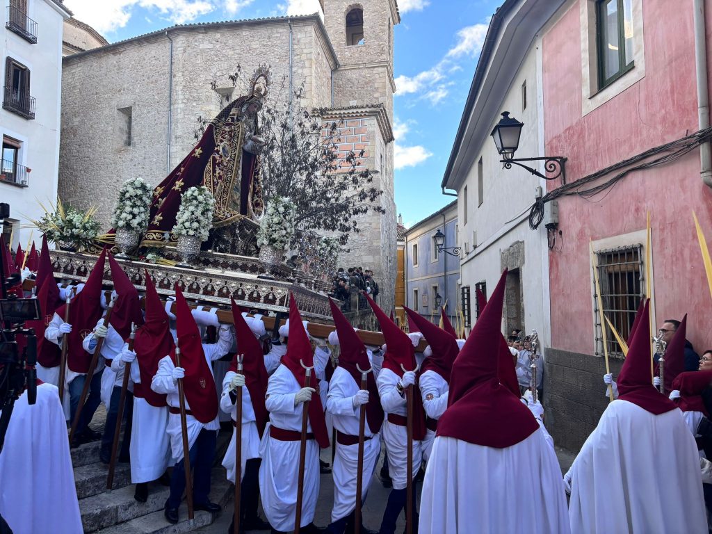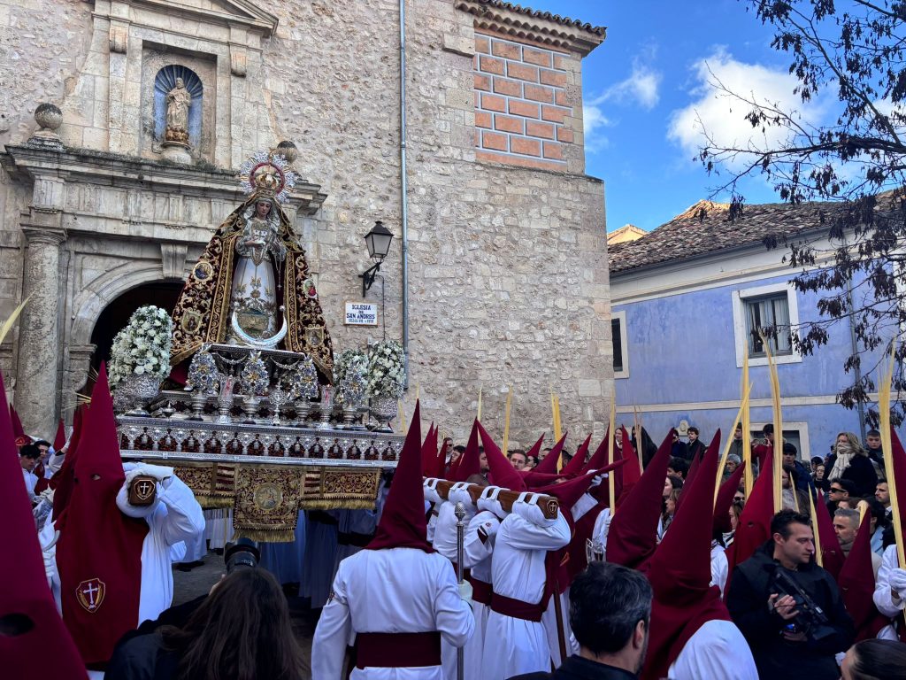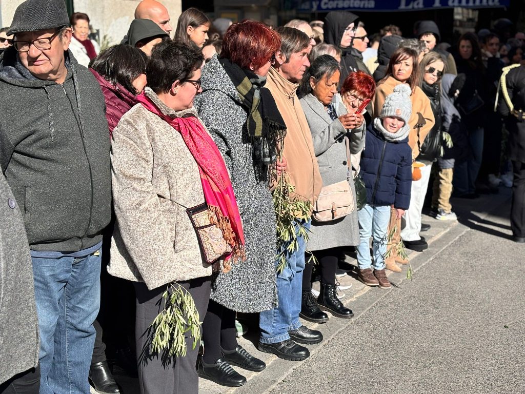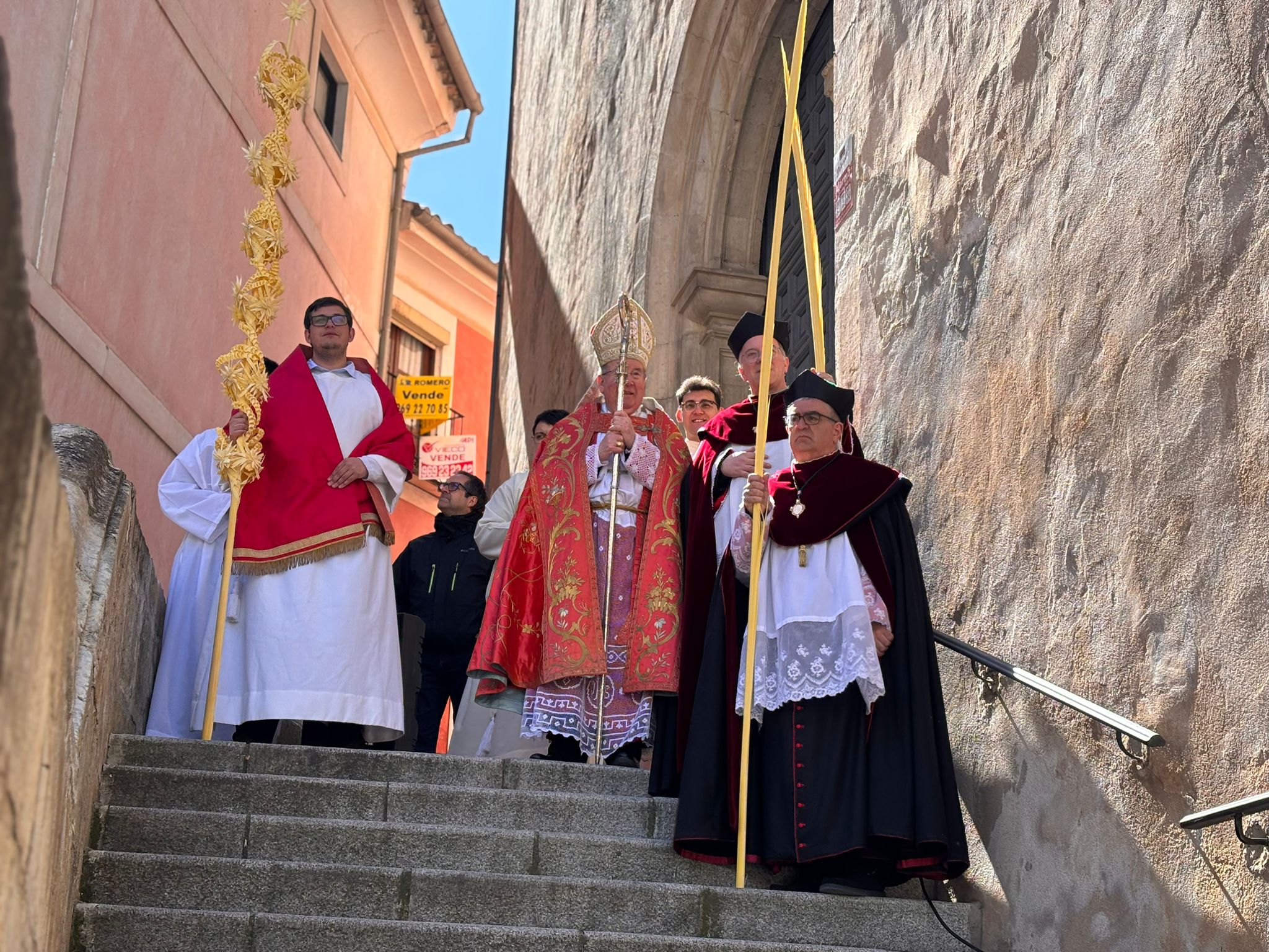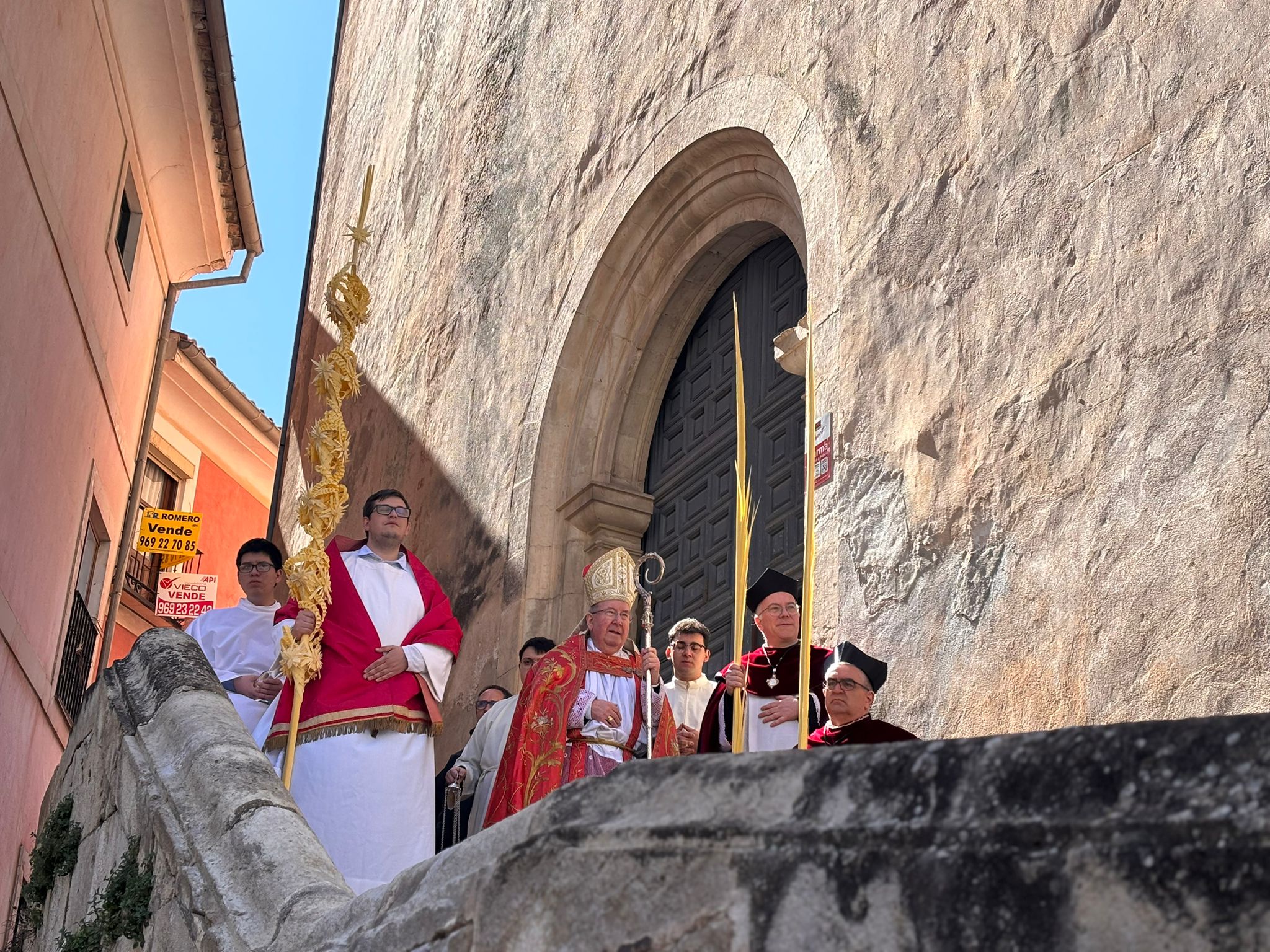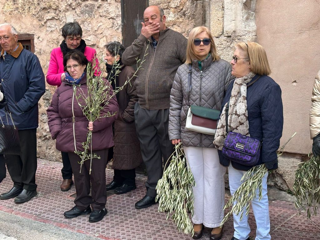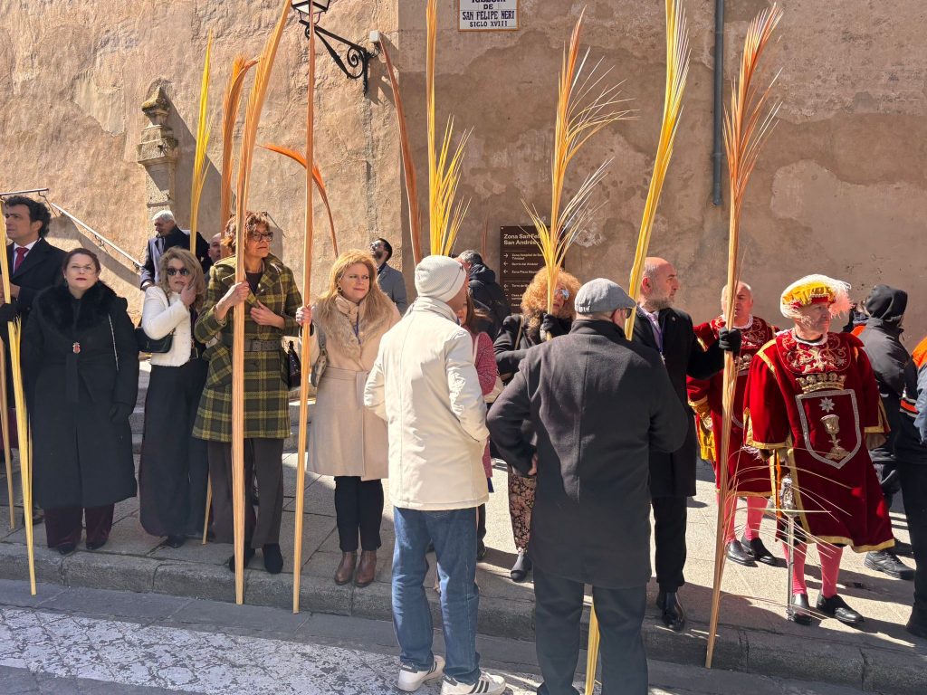 El obispo de Cuenca, José María Yanguas, pregonero de esta Semana Santa, mandó su bendición desde la escalinata antes de sumarse al cortejo procesional con una palma donada por San Juan Evangelista. Tras él desfilaban los miembros de la Corporación municipal y de la Junta de Cofradías, que en este día solo responden a la autoridad de este nazareno que demuestra que solo se pueden celebrar las victorias que llegan con la paz, no con las bombas.