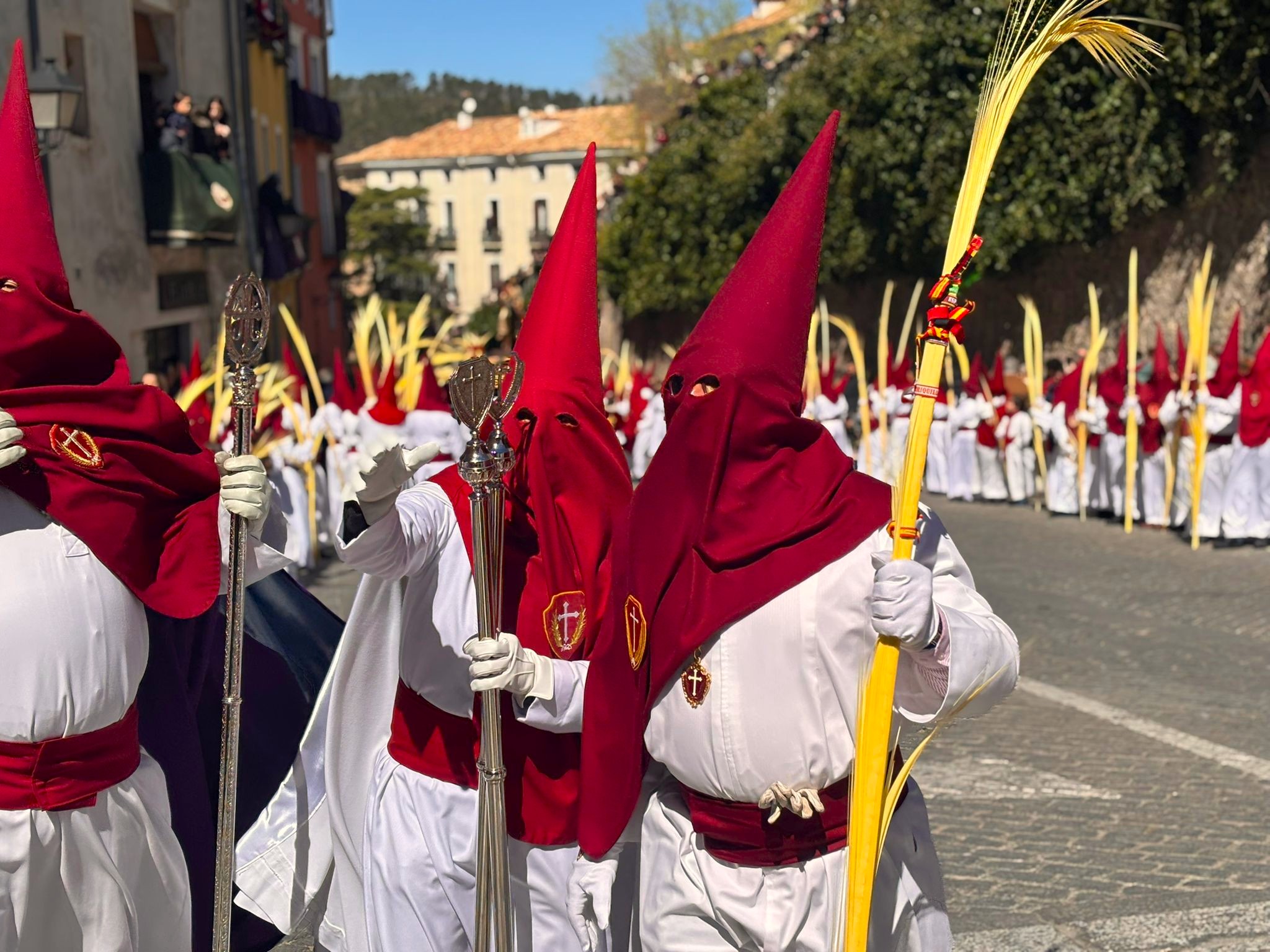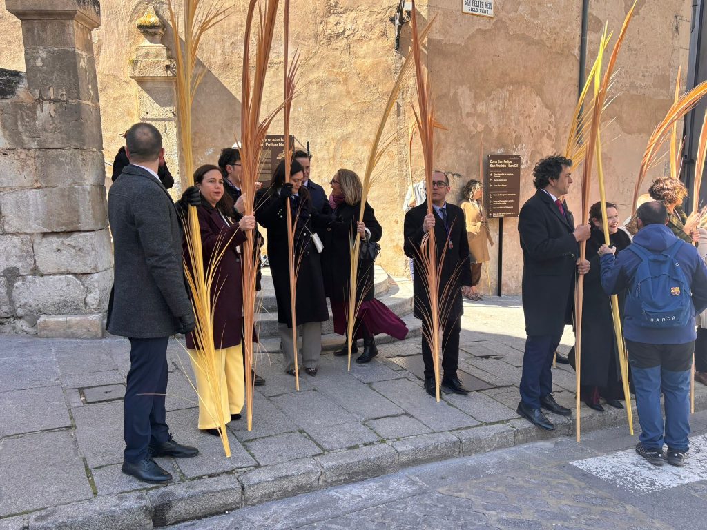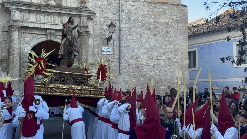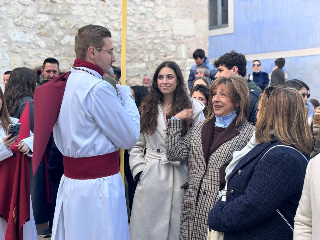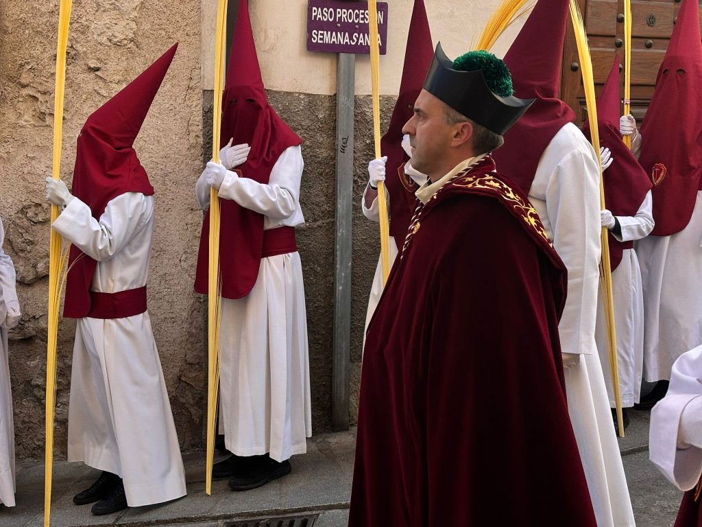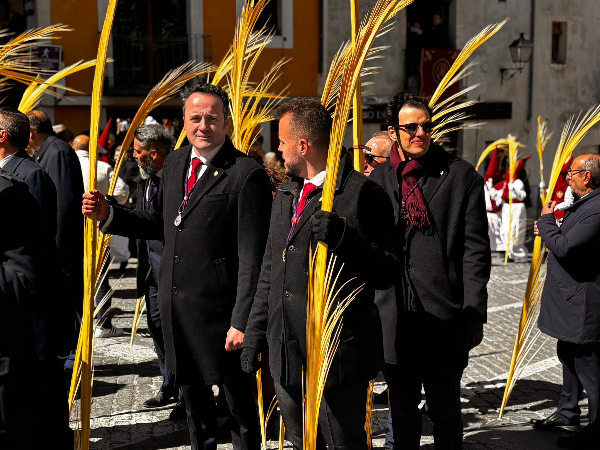 El obispo de Cuenca, José María Yanguas, pregonero de esta Semana Santa, mandó su bendición desde la escalinata antes de sumarse al cortejo procesional con una palma donada por San Juan Evangelista. Tras él desfilaban los miembros de la Corporación municipal y de la Junta de Cofradías, que en este día solo responden a la autoridad de este nazareno que demuestra que solo se pueden celebrar las victorias que llegan con la paz, no con las bombas.