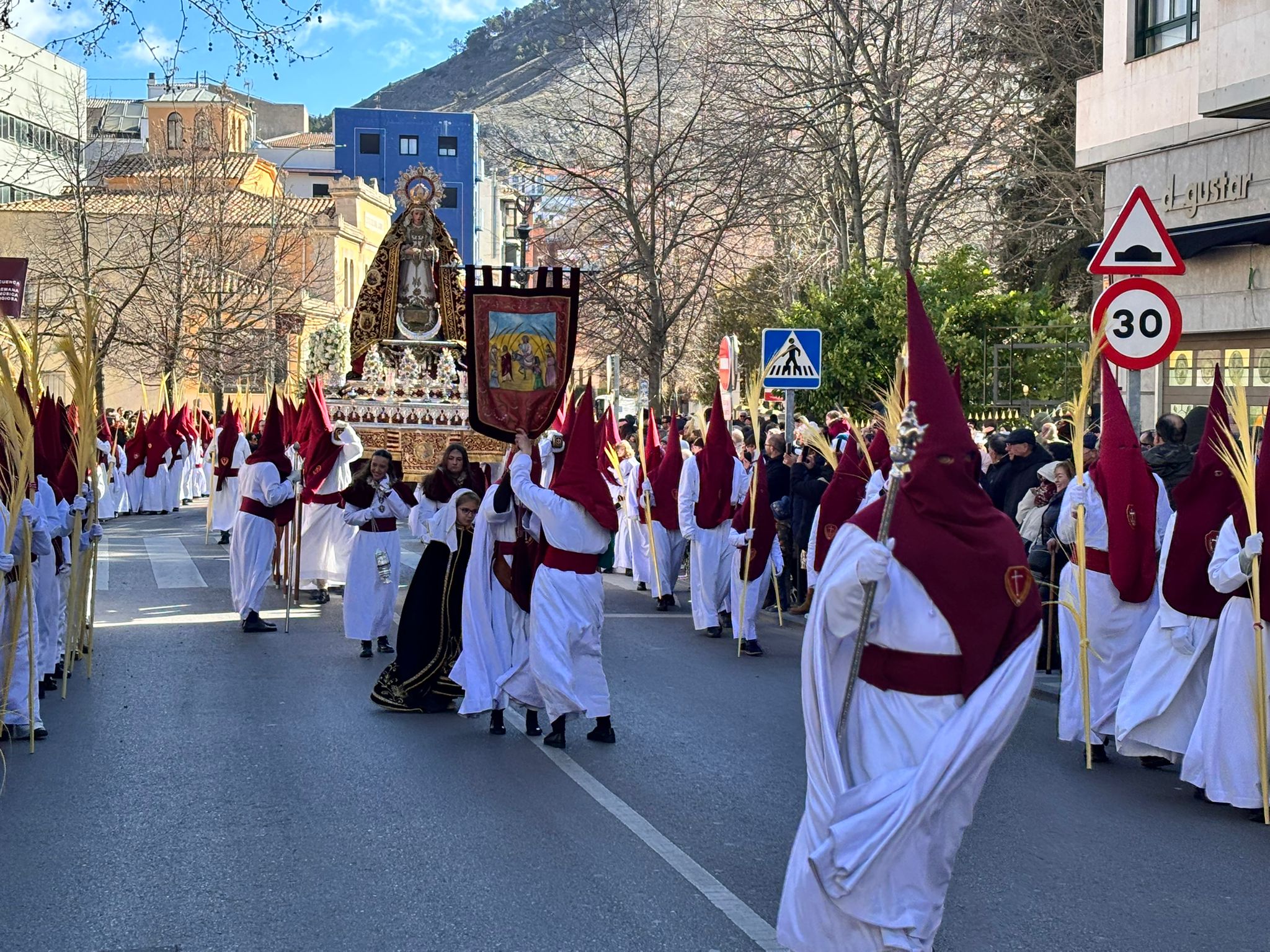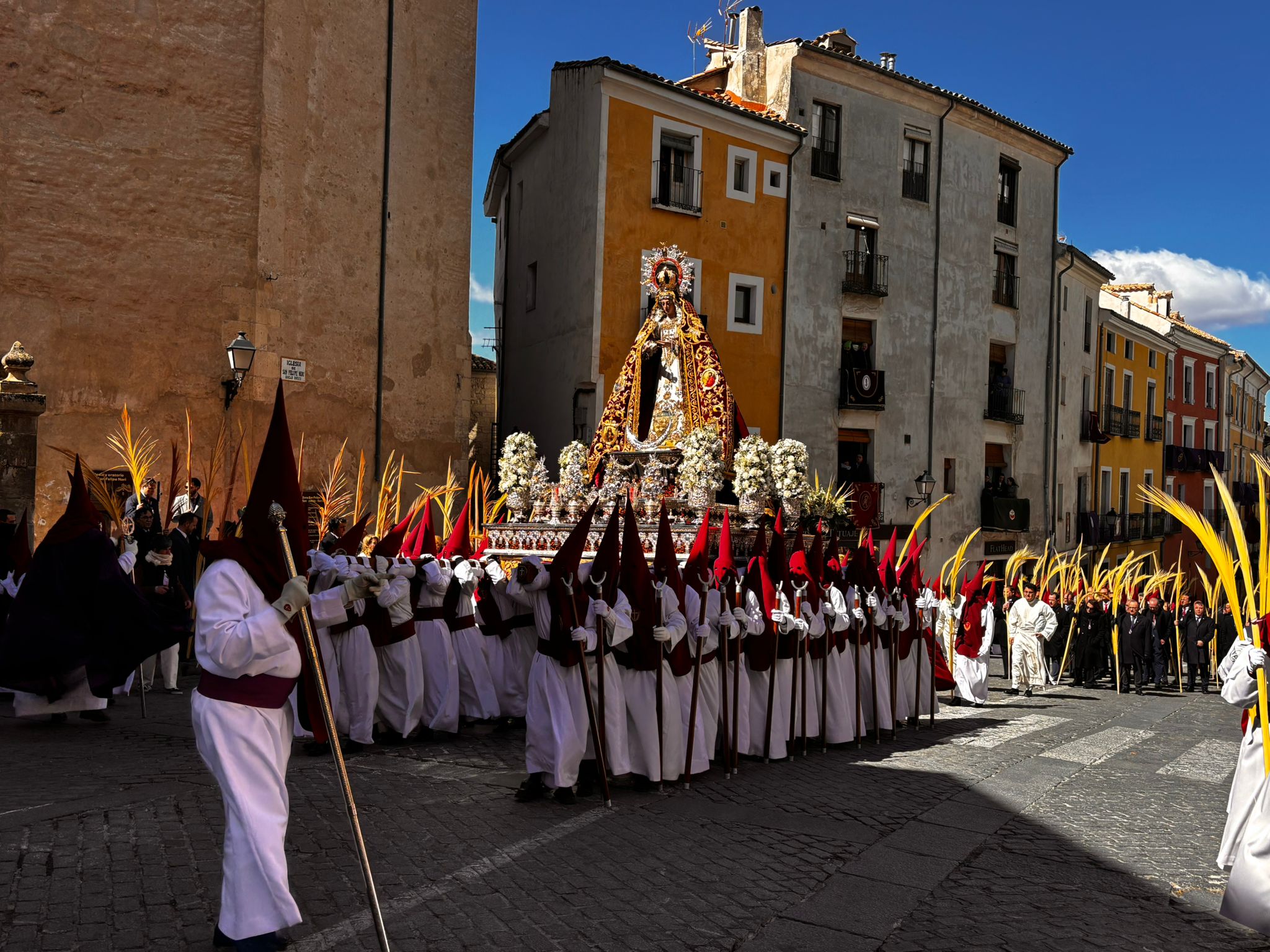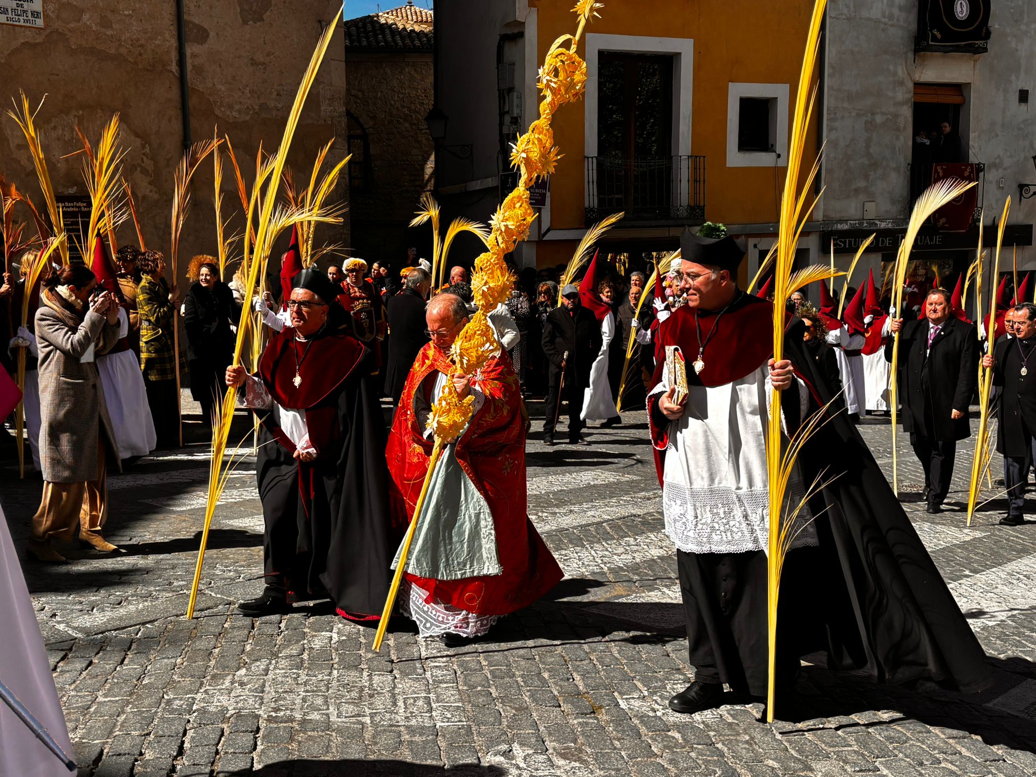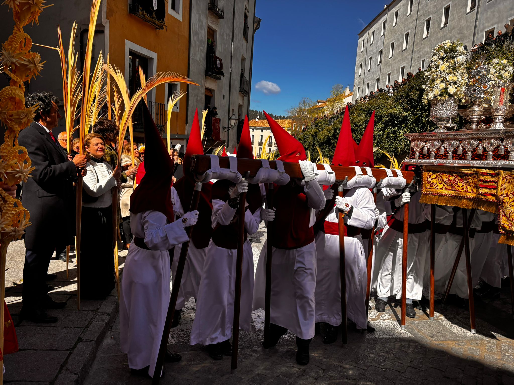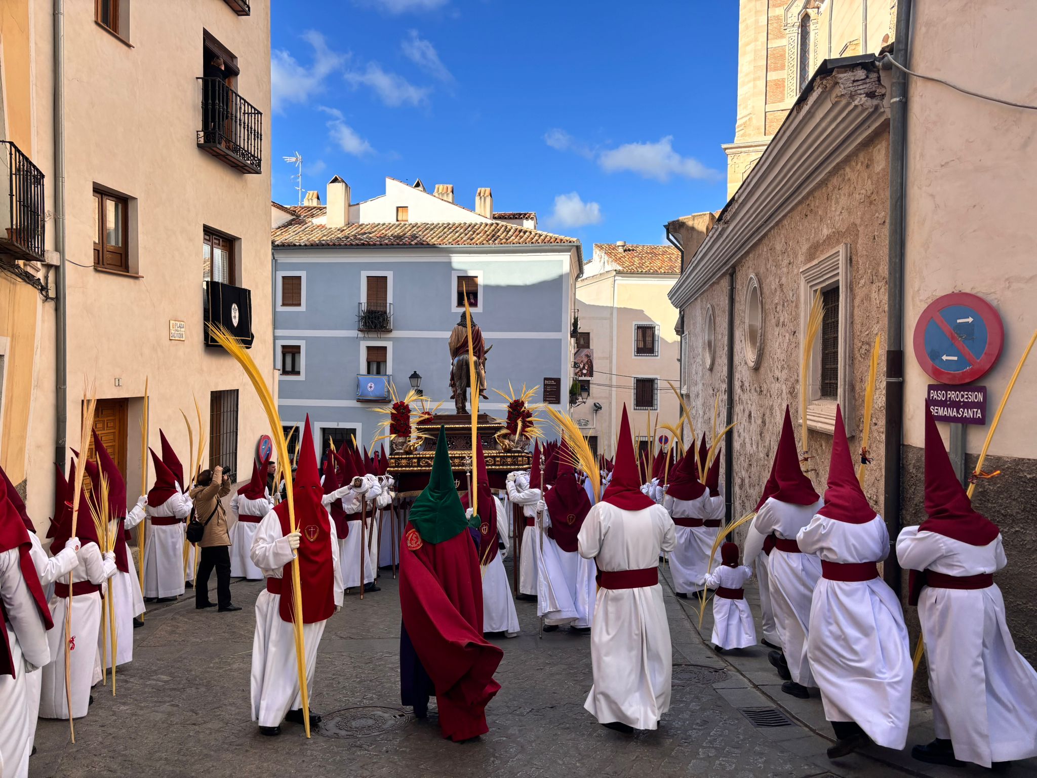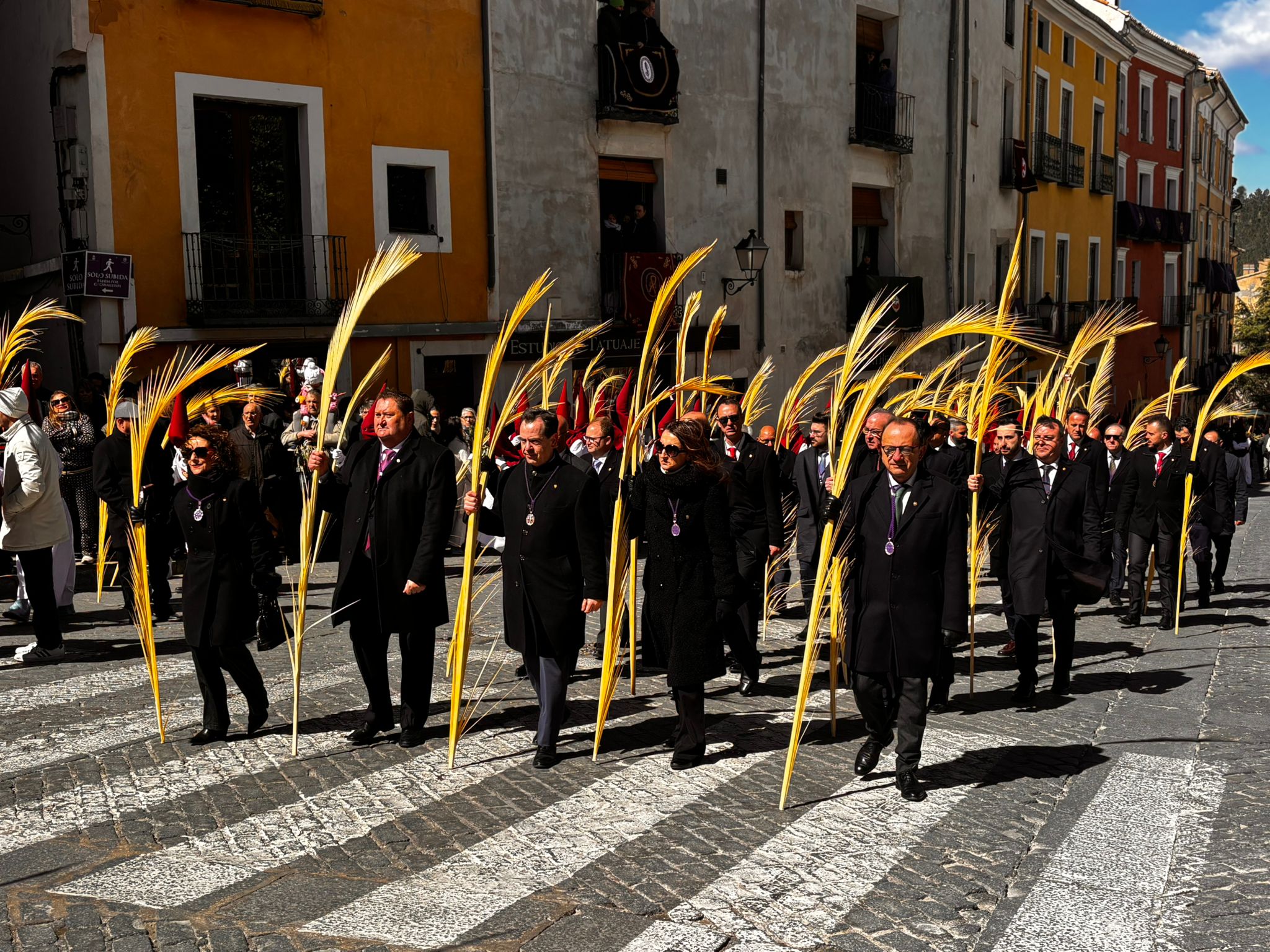 El obispo de Cuenca, José María Yanguas, pregonero de esta Semana Santa, mandó su bendición desde la escalinata antes de sumarse al cortejo procesional con una palma donada por San Juan Evangelista. Tras él desfilaban los miembros de la Corporación municipal y de la Junta de Cofradías, que en este día solo responden a la autoridad de este nazareno que demuestra que solo se pueden celebrar las victorias que llegan con la paz, no con las bombas.