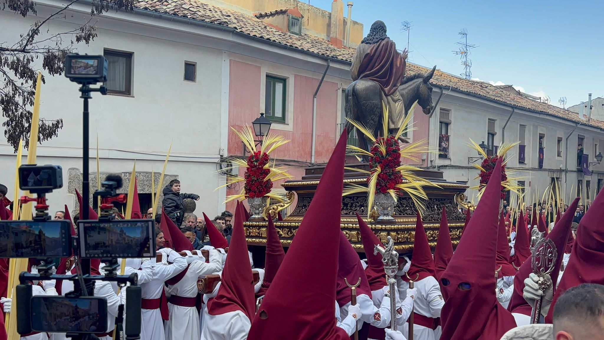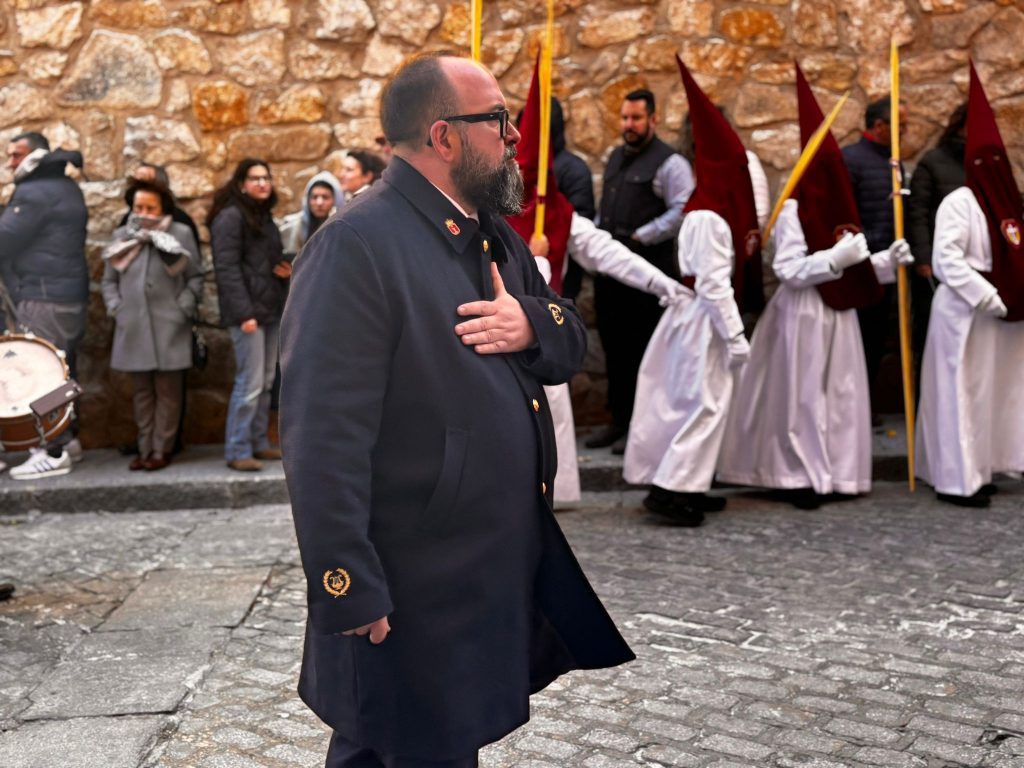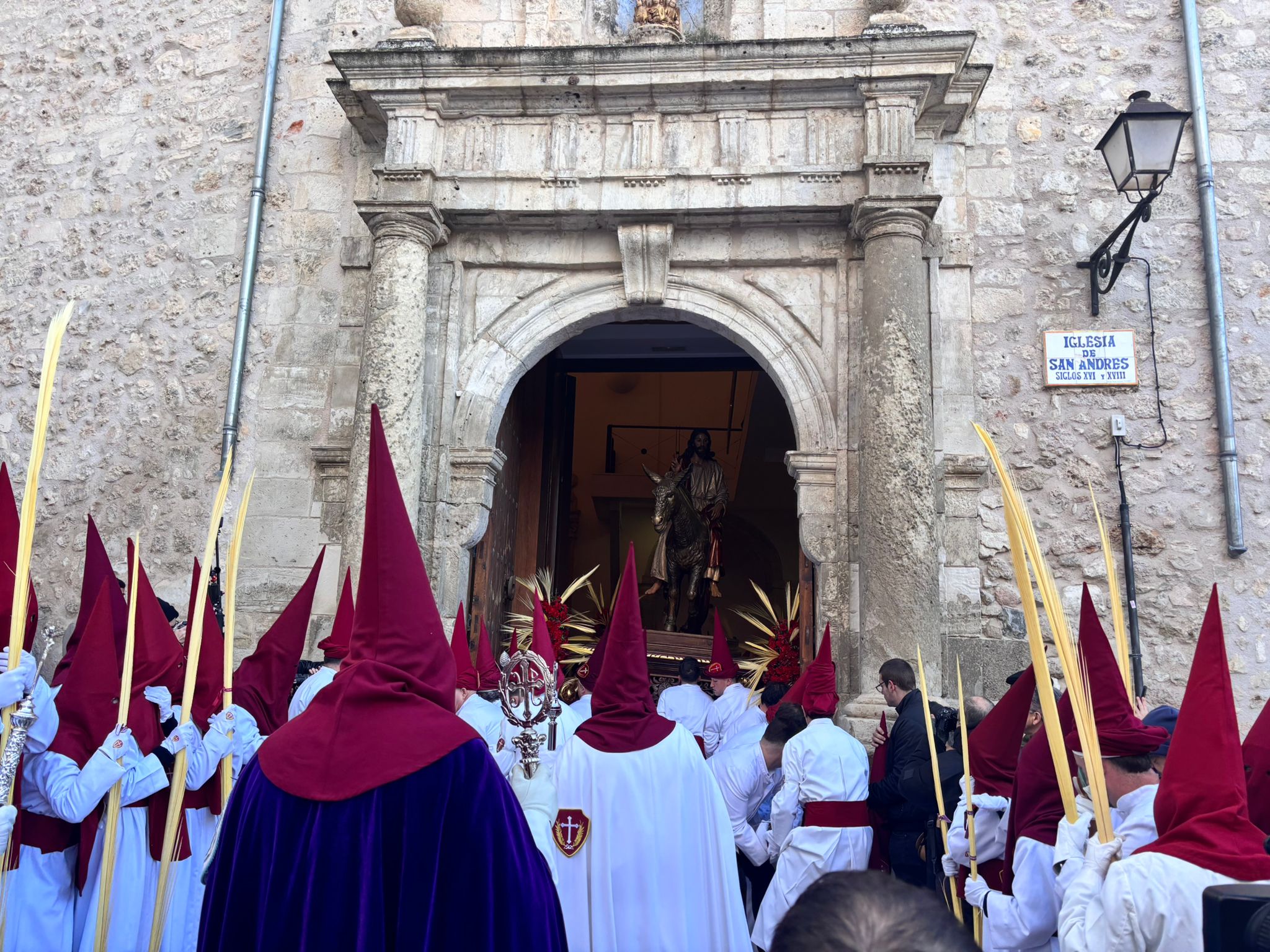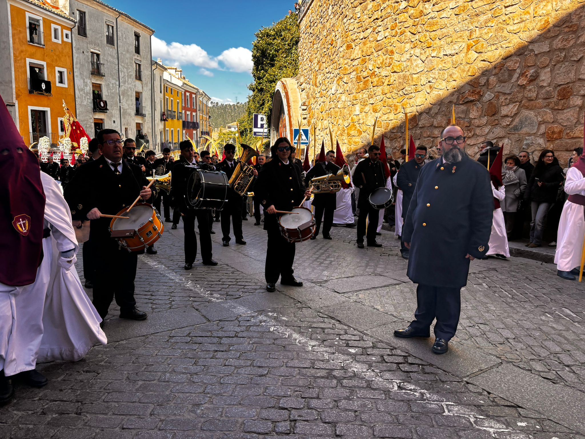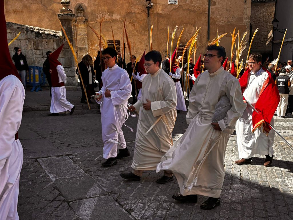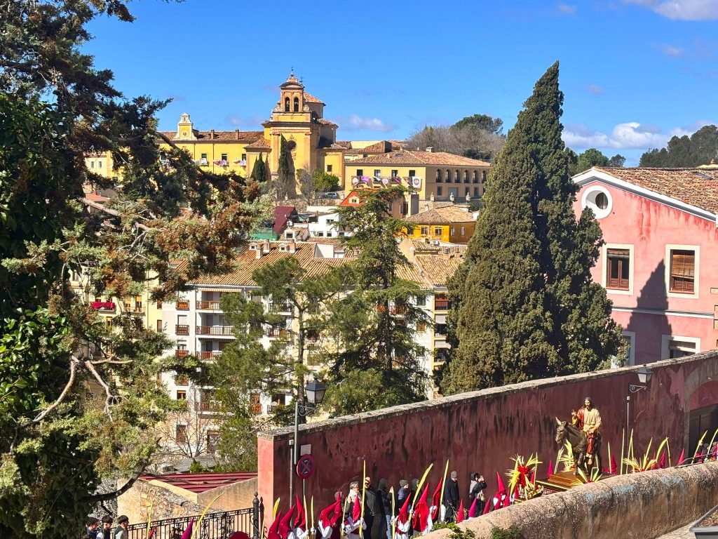El obispo de Cuenca, José María Yanguas, pregonero de esta Semana Santa, mandó su bendición desde la escalinata antes de sumarse al cortejo procesional con una palma donada por San Juan Evangelista. Tras él desfilaban los miembros de la Corporación municipal y de la Junta de Cofradías, que en este día solo responden a la autoridad de este nazareno que demuestra que solo se pueden celebrar las victorias que llegan con la paz, no con las bombas.