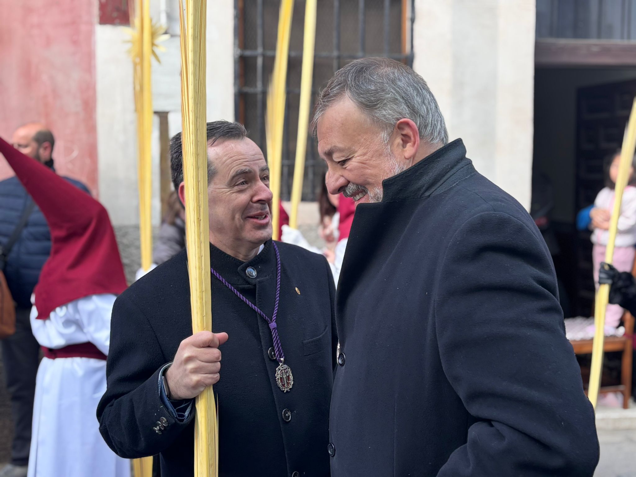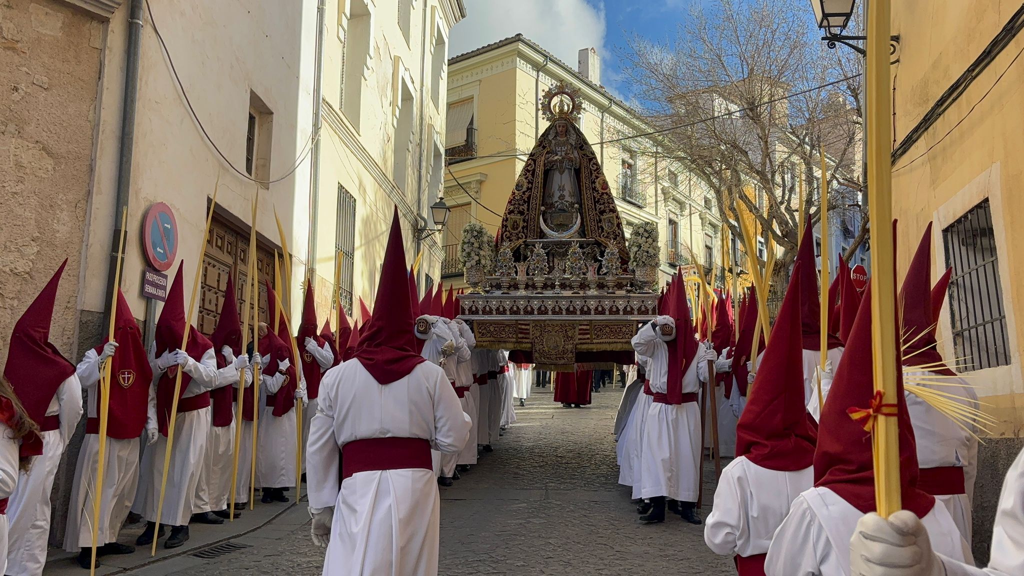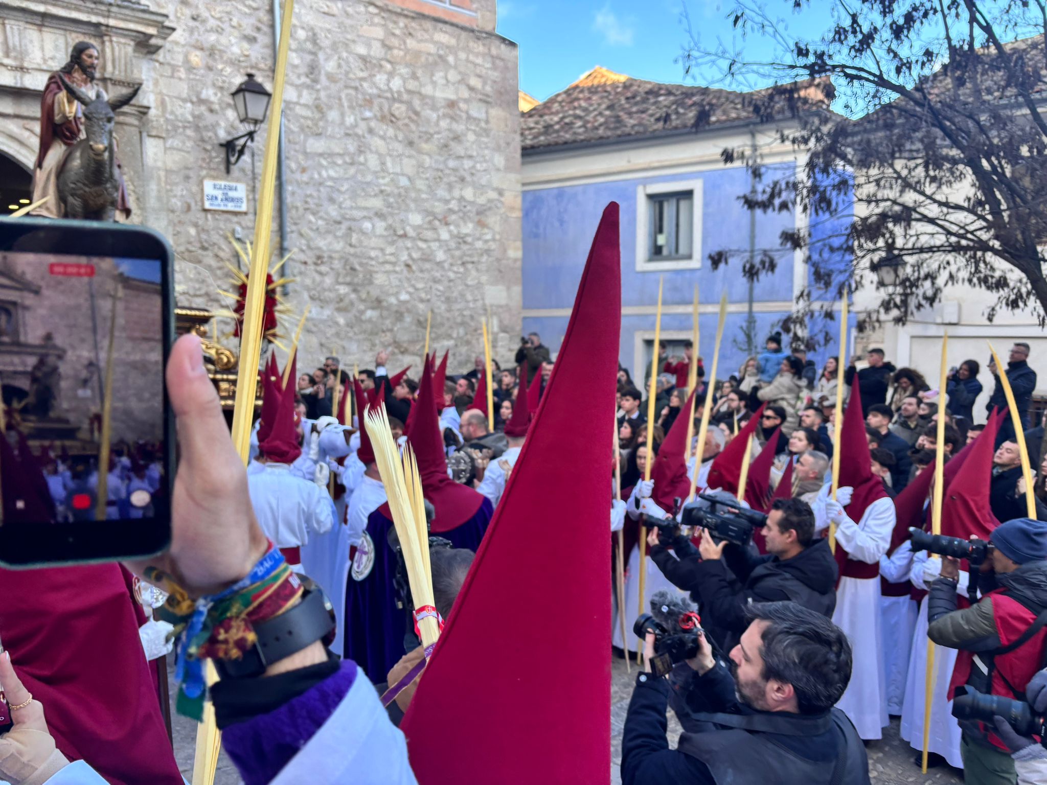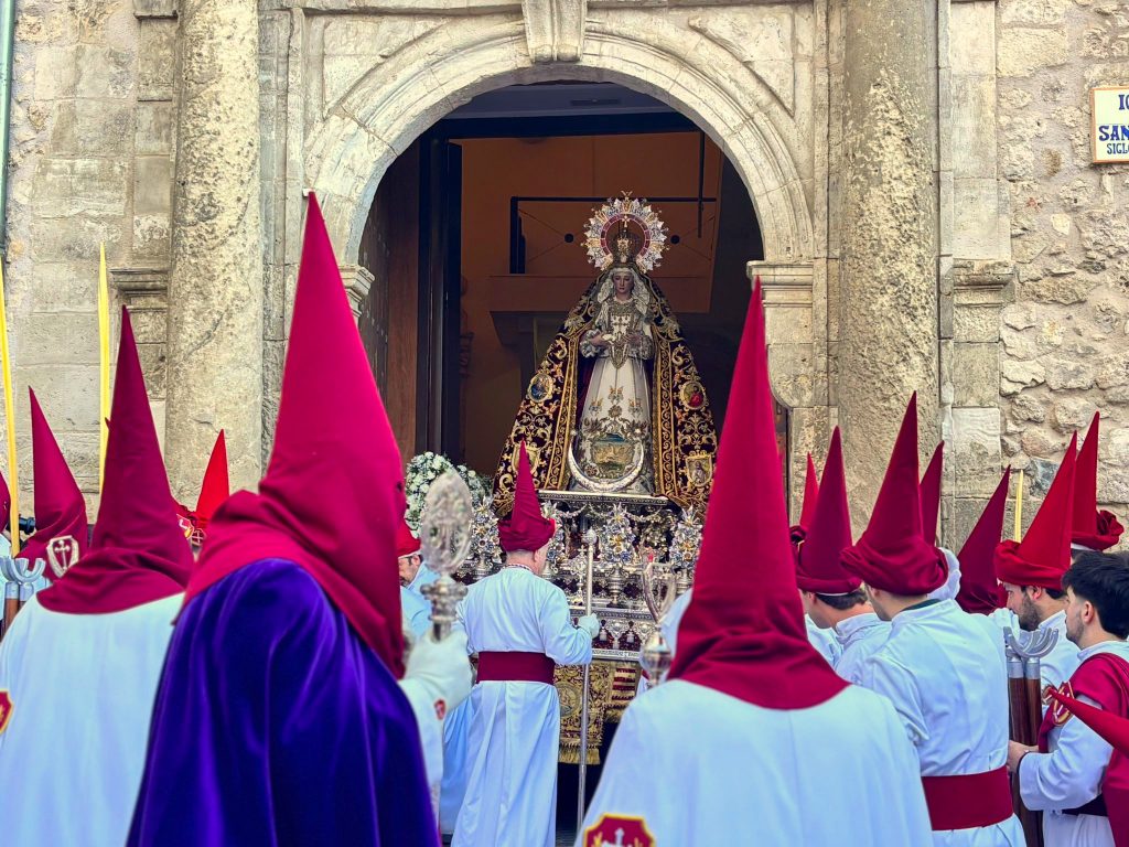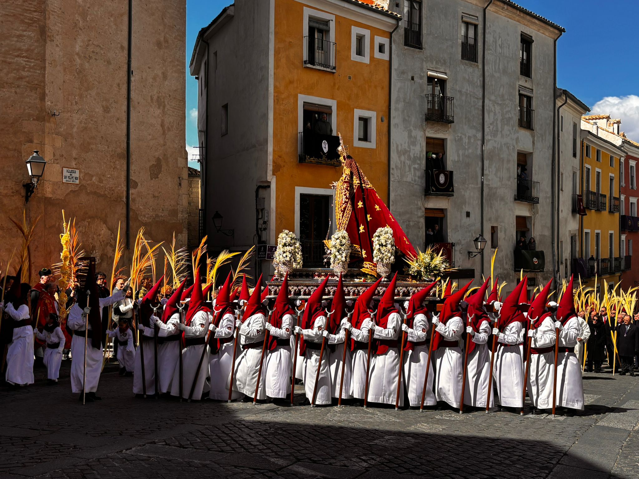 El obispo de Cuenca, José María Yanguas, pregonero de esta Semana Santa, mandó su bendición desde la escalinata antes de sumarse al cortejo procesional con una palma donada por San Juan Evangelista. Tras él desfilaban los miembros de la Corporación municipal y de la Junta de Cofradías, que en este día solo responden a la autoridad de este nazareno que demuestra que solo se pueden celebrar las victorias que llegan con la paz, no con las bombas.