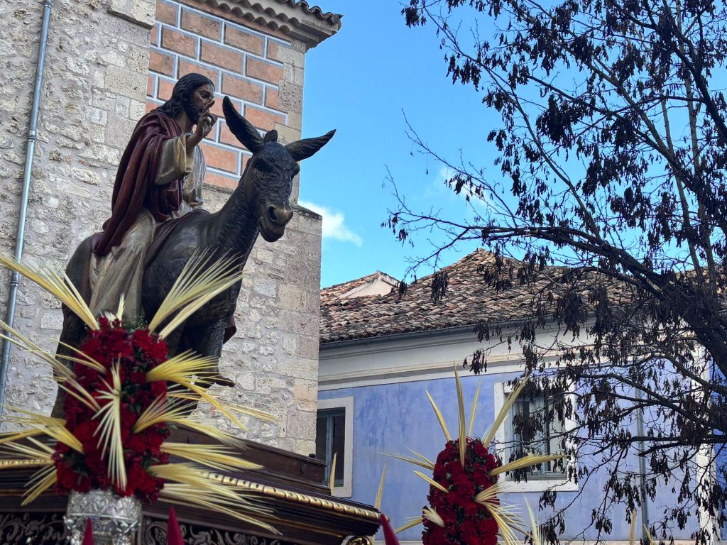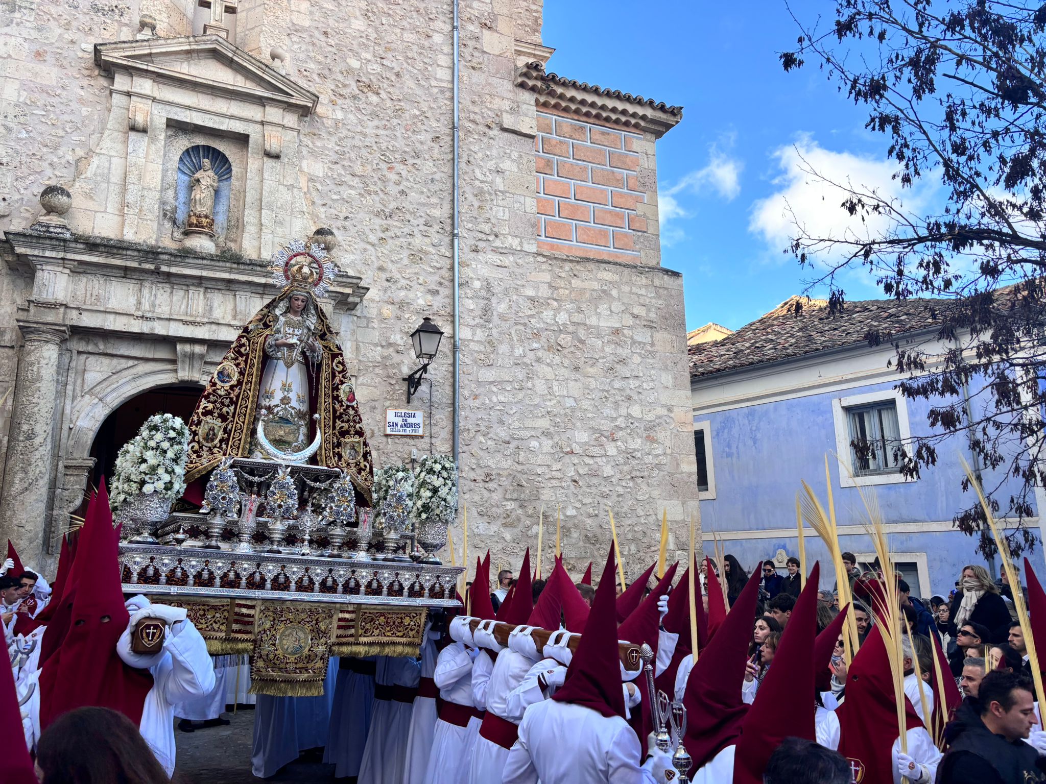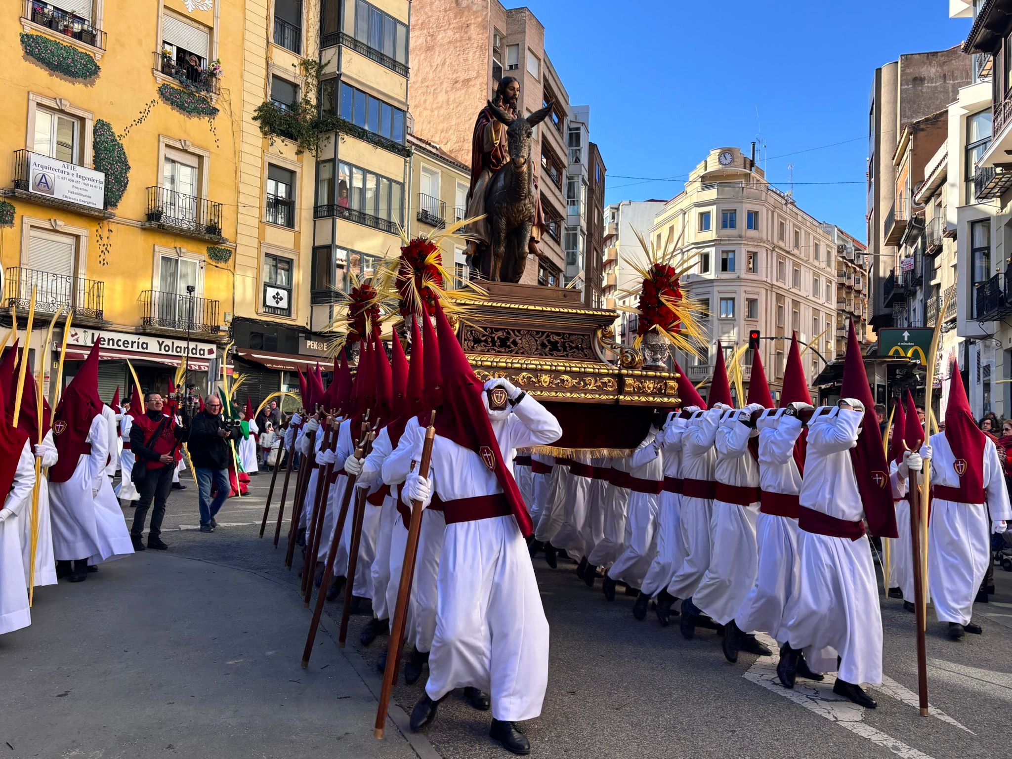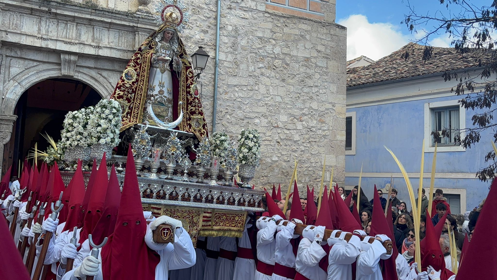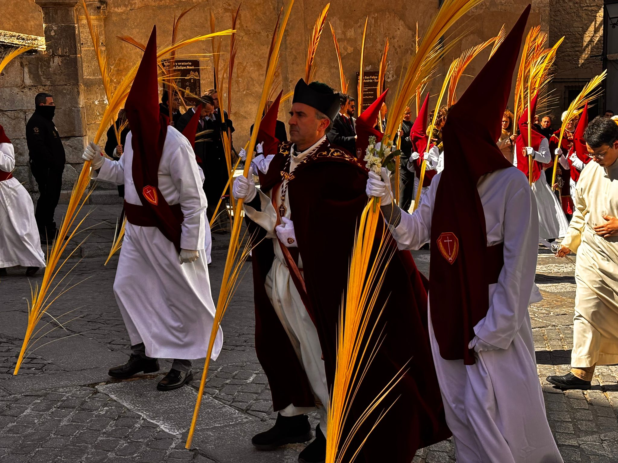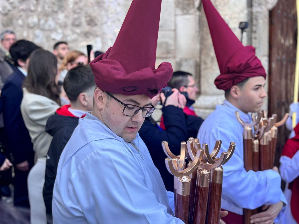 El obispo de Cuenca, José María Yanguas, pregonero de esta Semana Santa, mandó su bendición desde la escalinata antes de sumarse al cortejo procesional con una palma donada por San Juan Evangelista. Tras él desfilaban los miembros de la Corporación municipal y de la Junta de Cofradías, que en este día solo responden a la autoridad de este nazareno que demuestra que solo se pueden celebrar las victorias que llegan con la paz, no con las bombas.