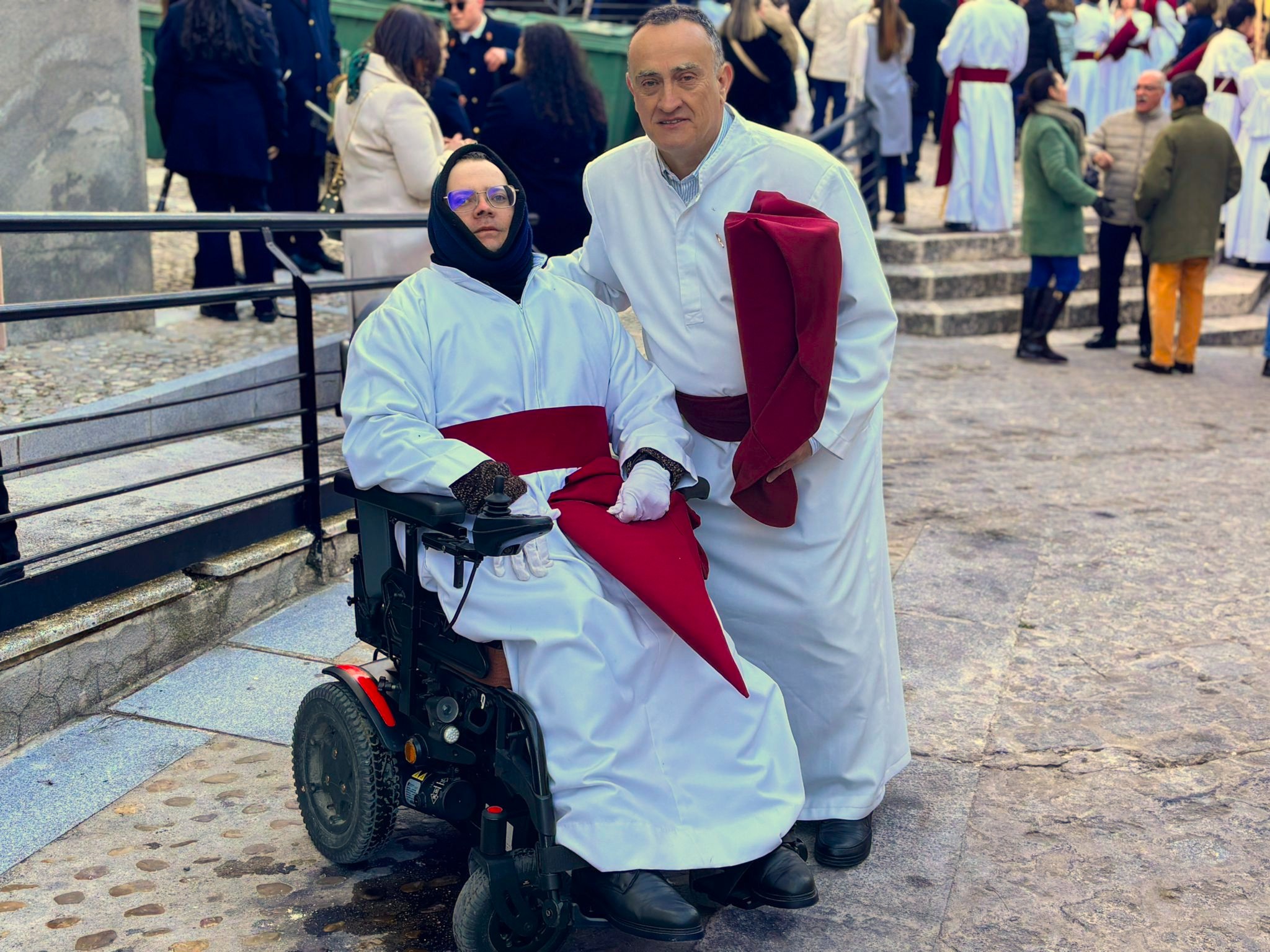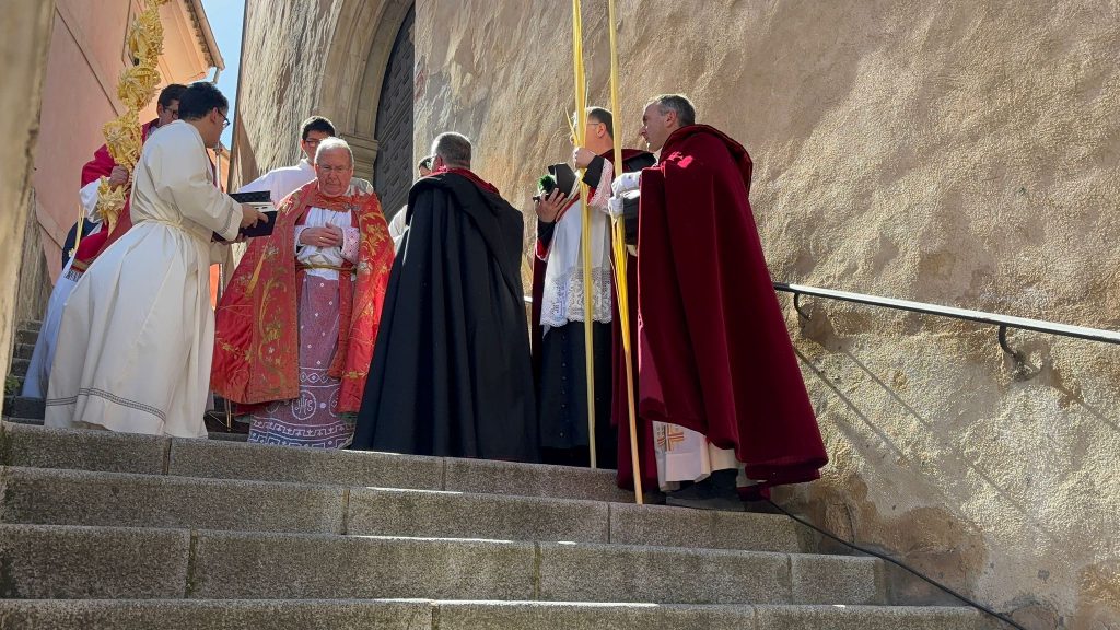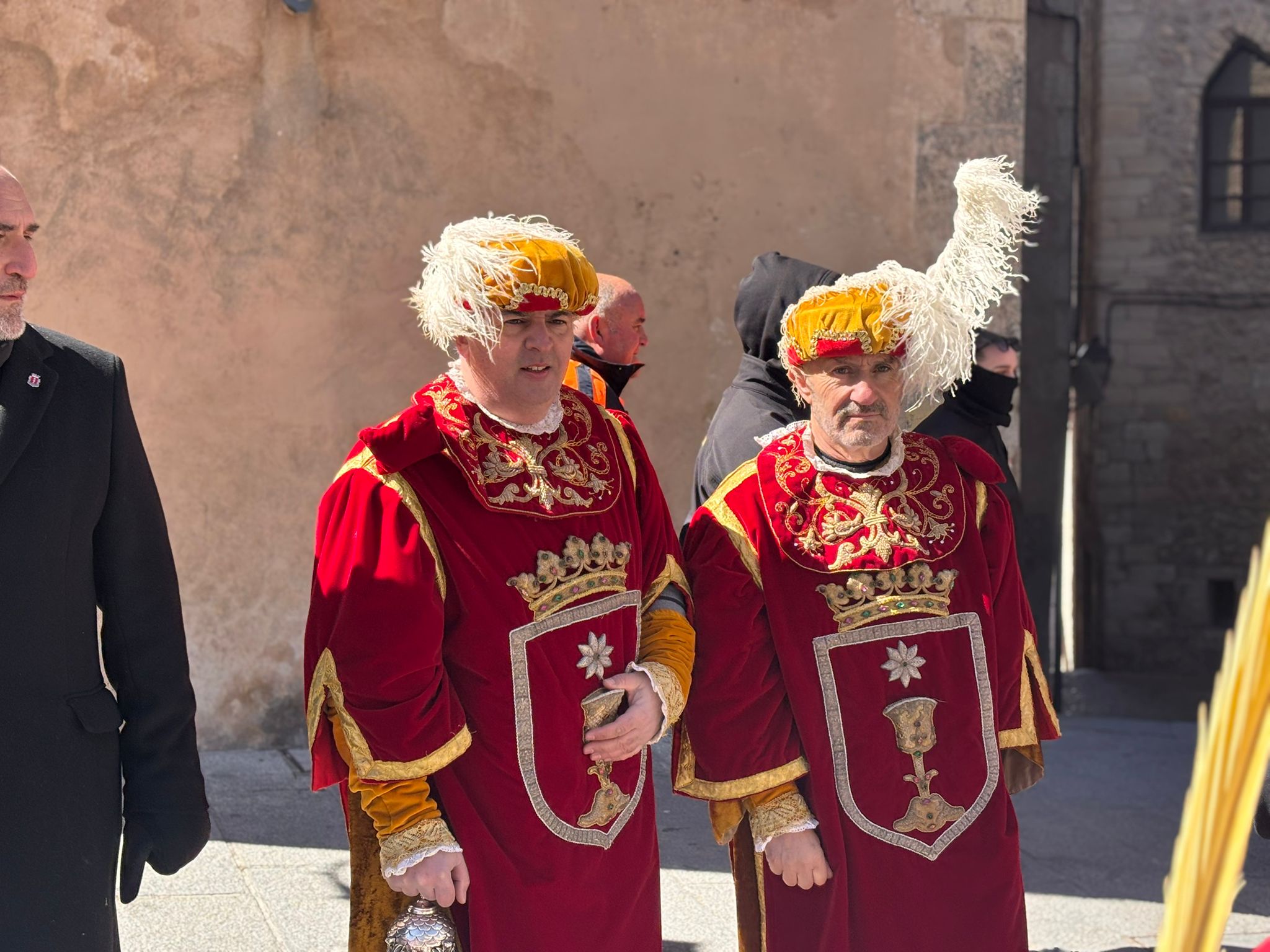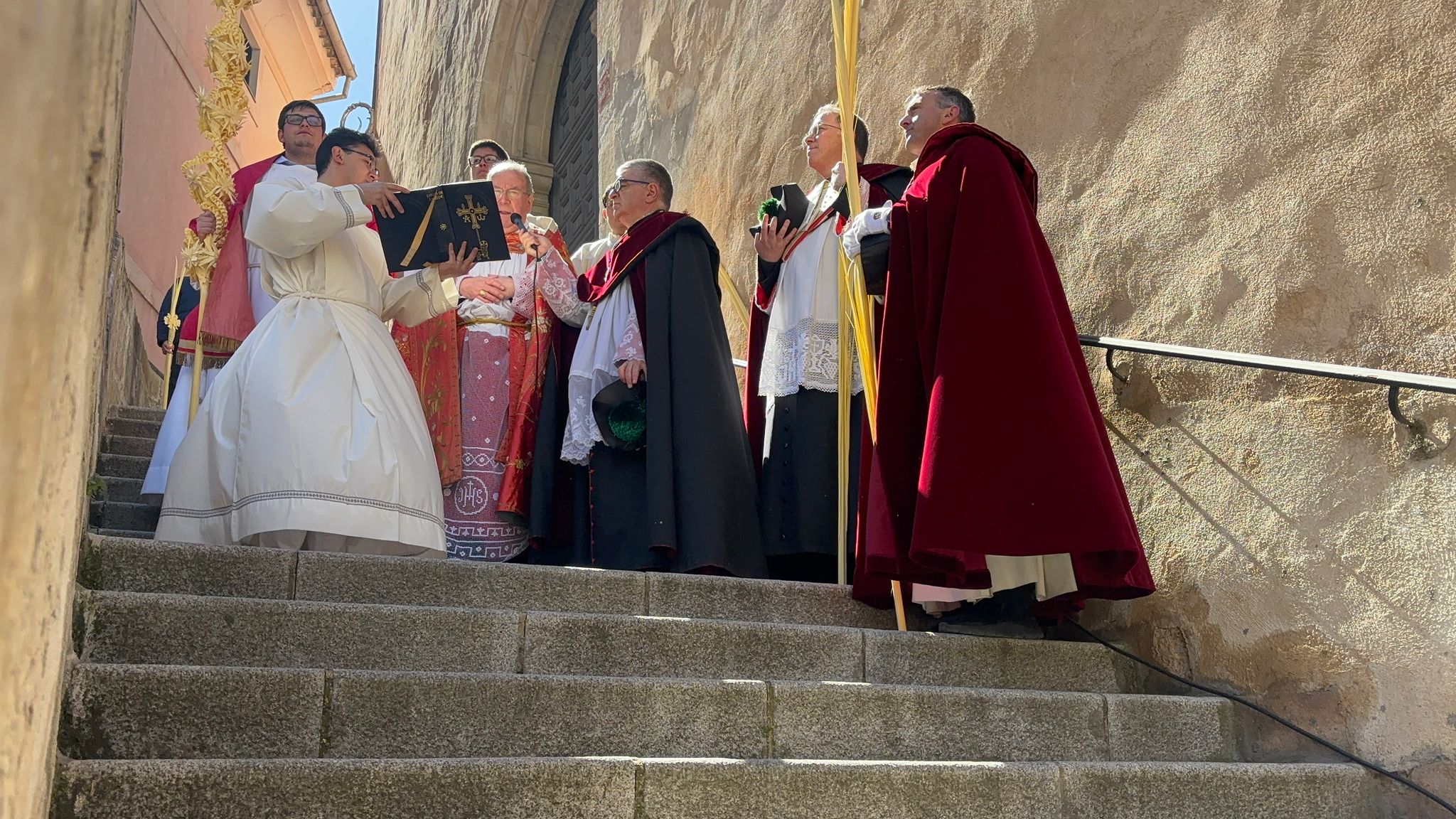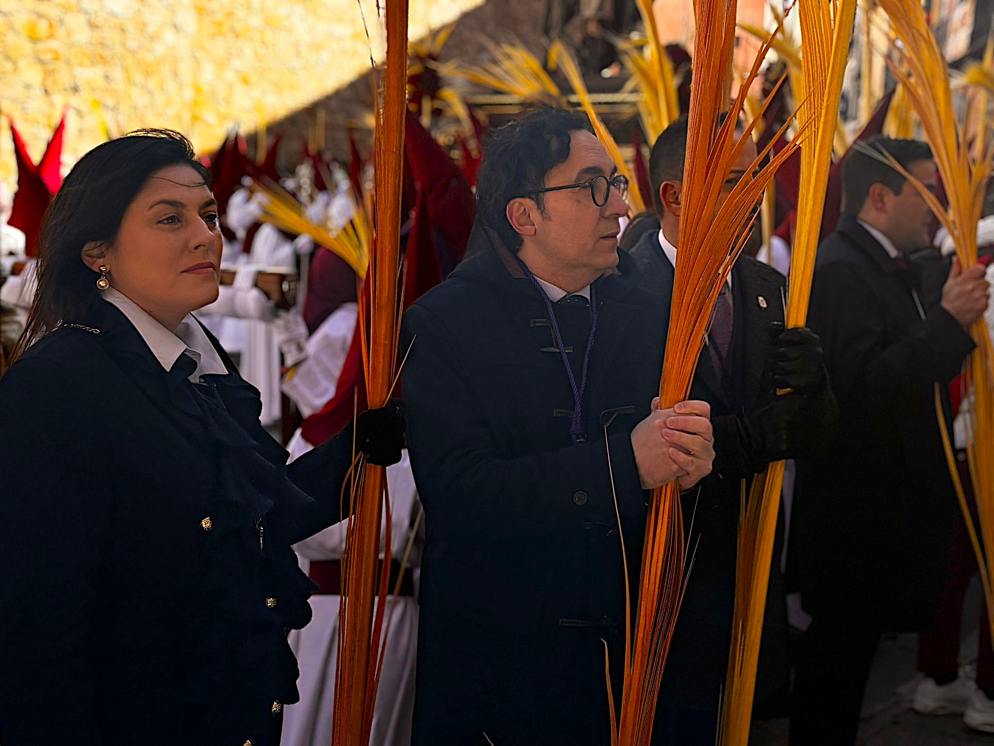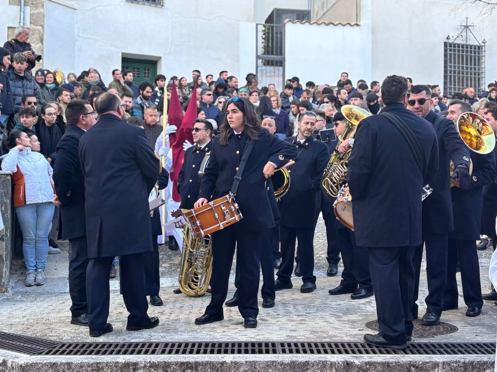 El obispo de Cuenca, José María Yanguas, pregonero de esta Semana Santa, mandó su bendición desde la escalinata antes de sumarse al cortejo procesional con una palma donada por San Juan Evangelista. Tras él desfilaban los miembros de la Corporación municipal y de la Junta de Cofradías, que en este día solo responden a la autoridad de este nazareno que demuestra que solo se pueden celebrar las victorias que llegan con la paz, no con las bombas.