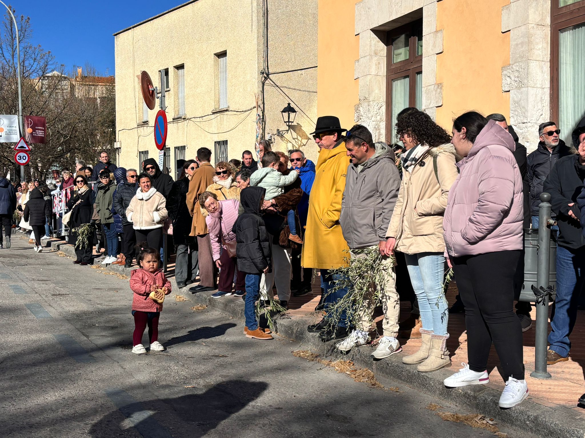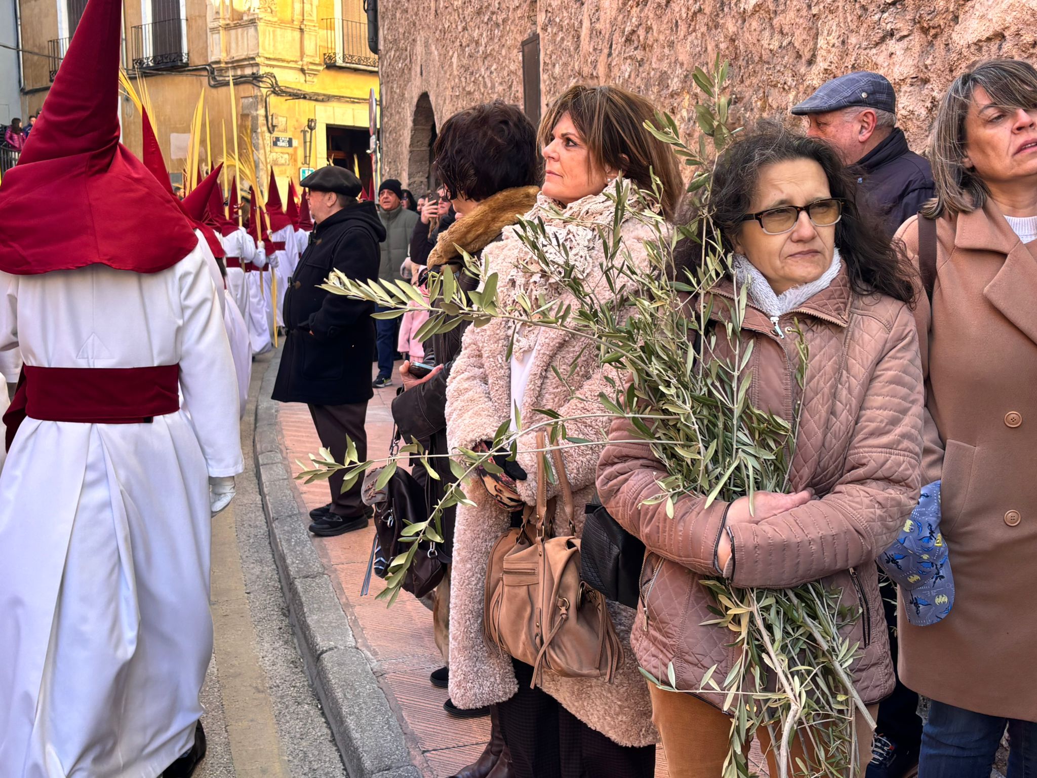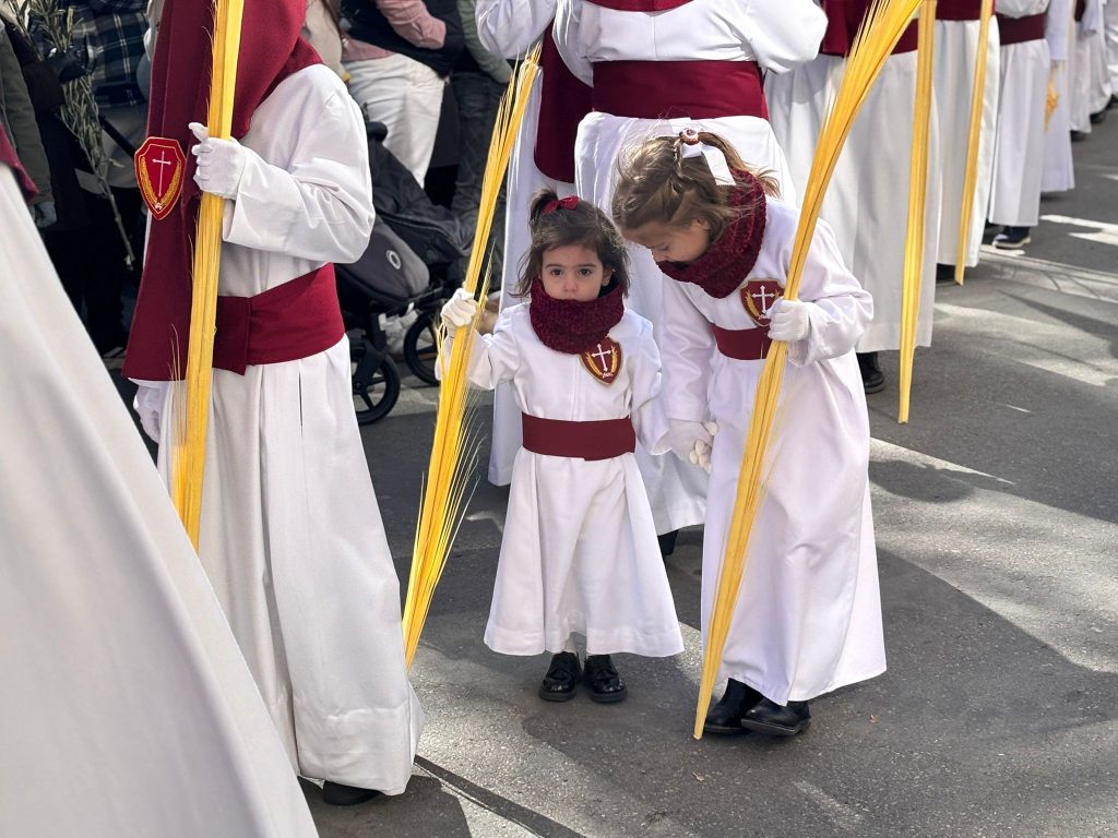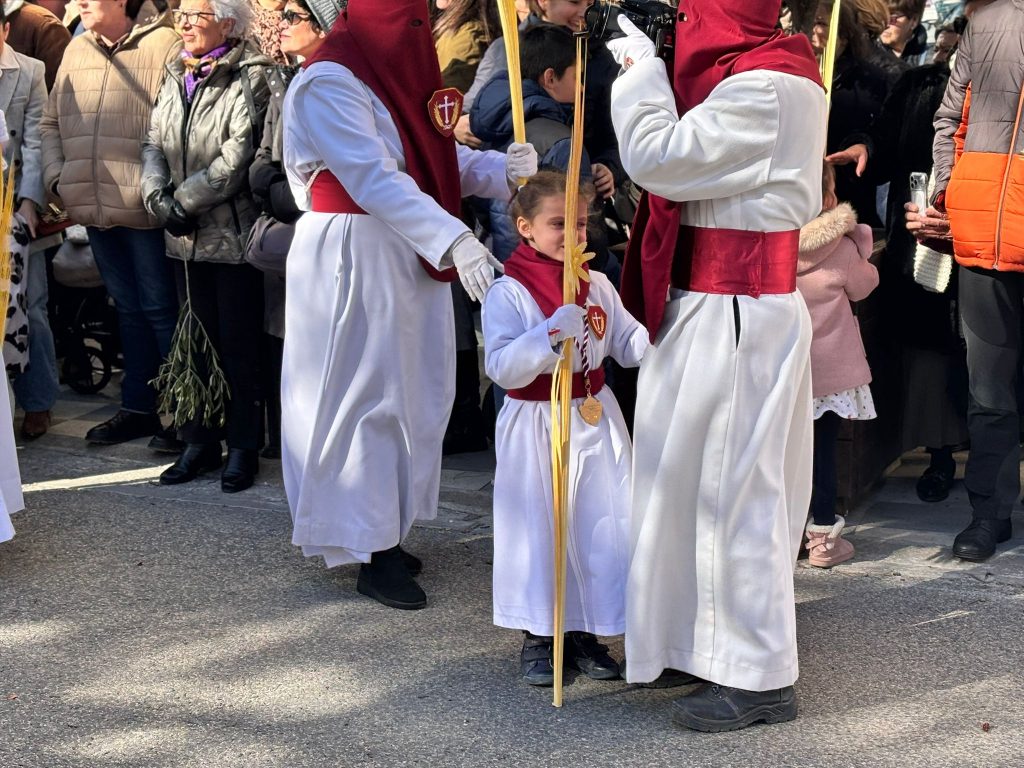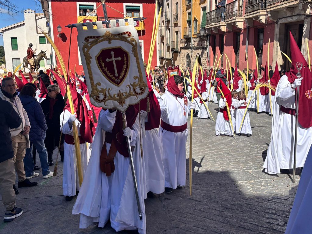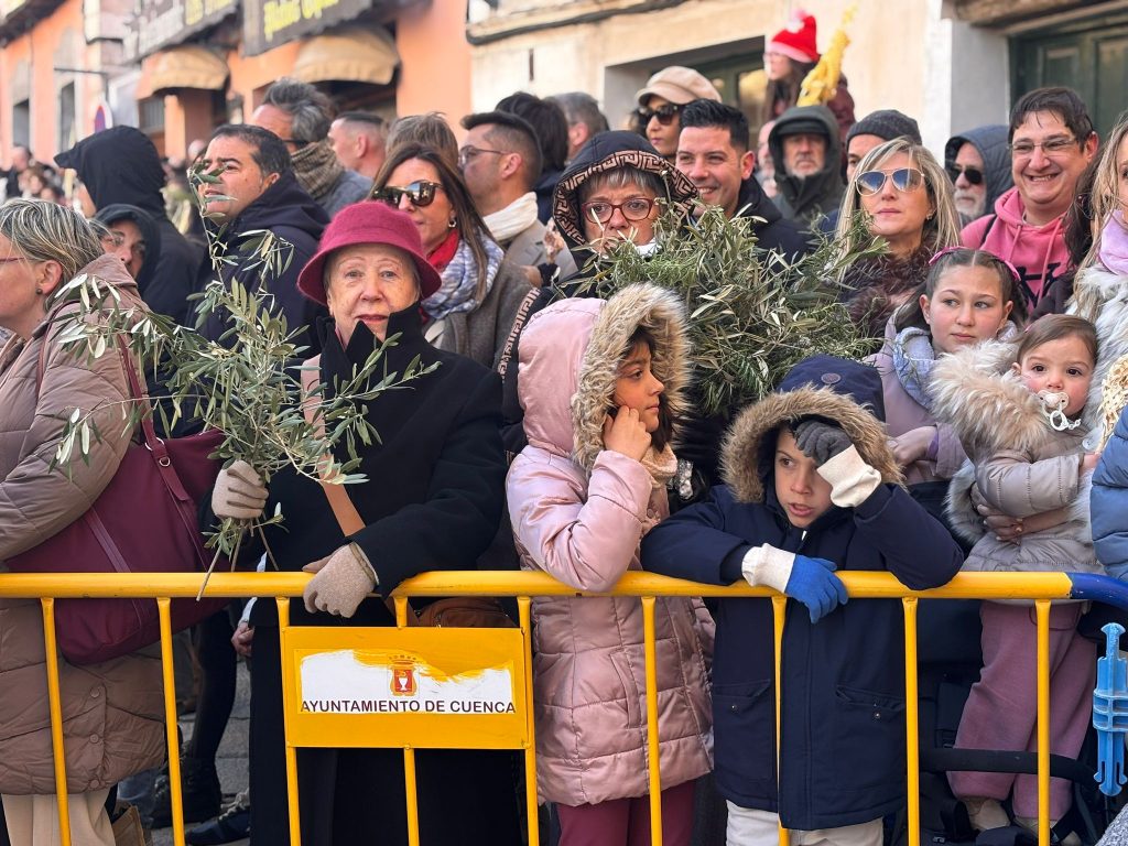 El sello de identidad del Domingo de Ramos de Cuenca son sus niños y niñas, este año bien abrigaditos para hacer frente a un frío que conspiraba con la fatiga. Los comentarios por la temperatura se multiplicaban en las aceras, pobladas pese a todo, porque la gente de esta tierra, como su ciudad, es impertérrita y hace falta algo más que un bravucón viento de componente norte para que un conquense se pierda la procesión del Hosanna.