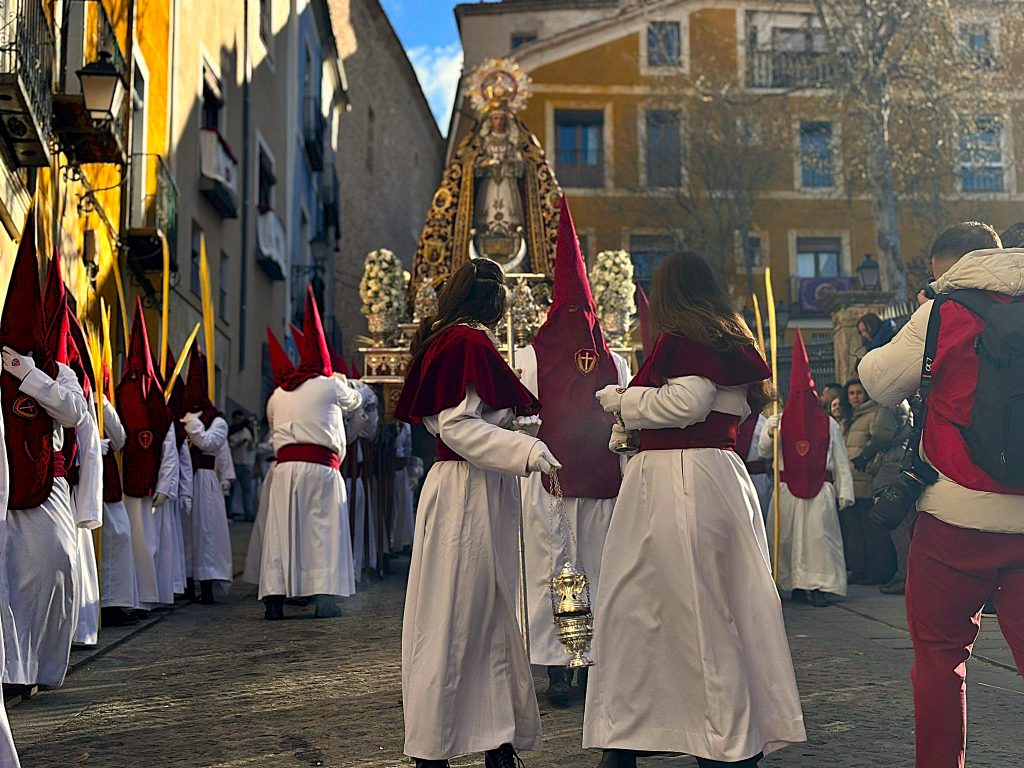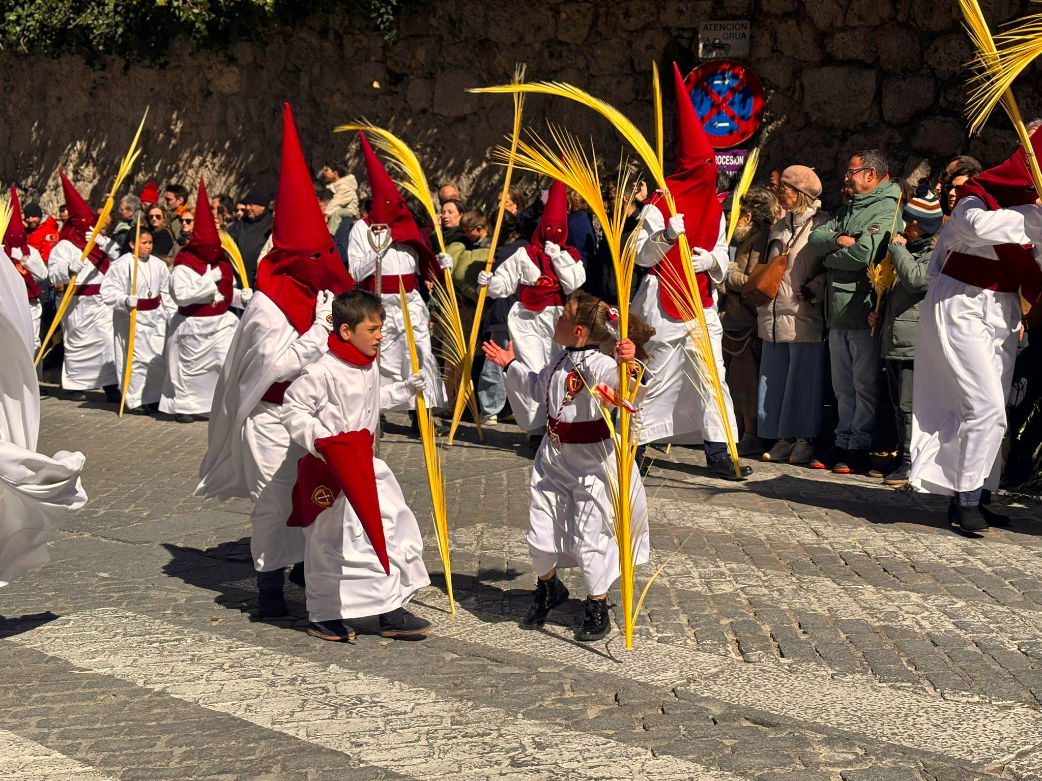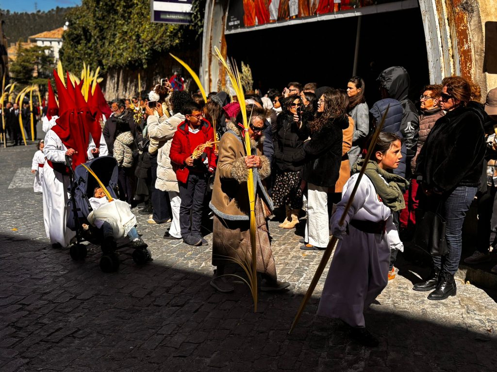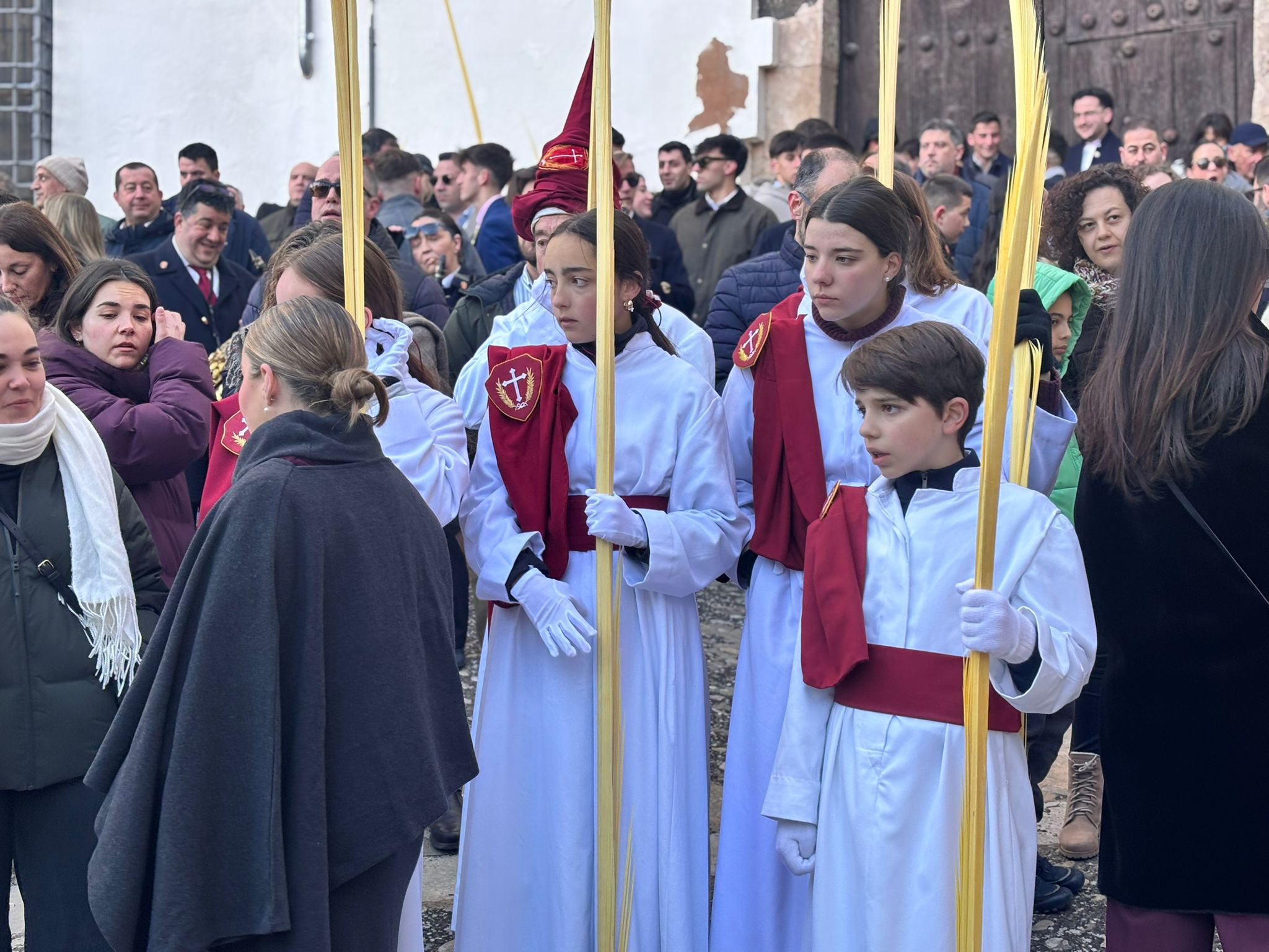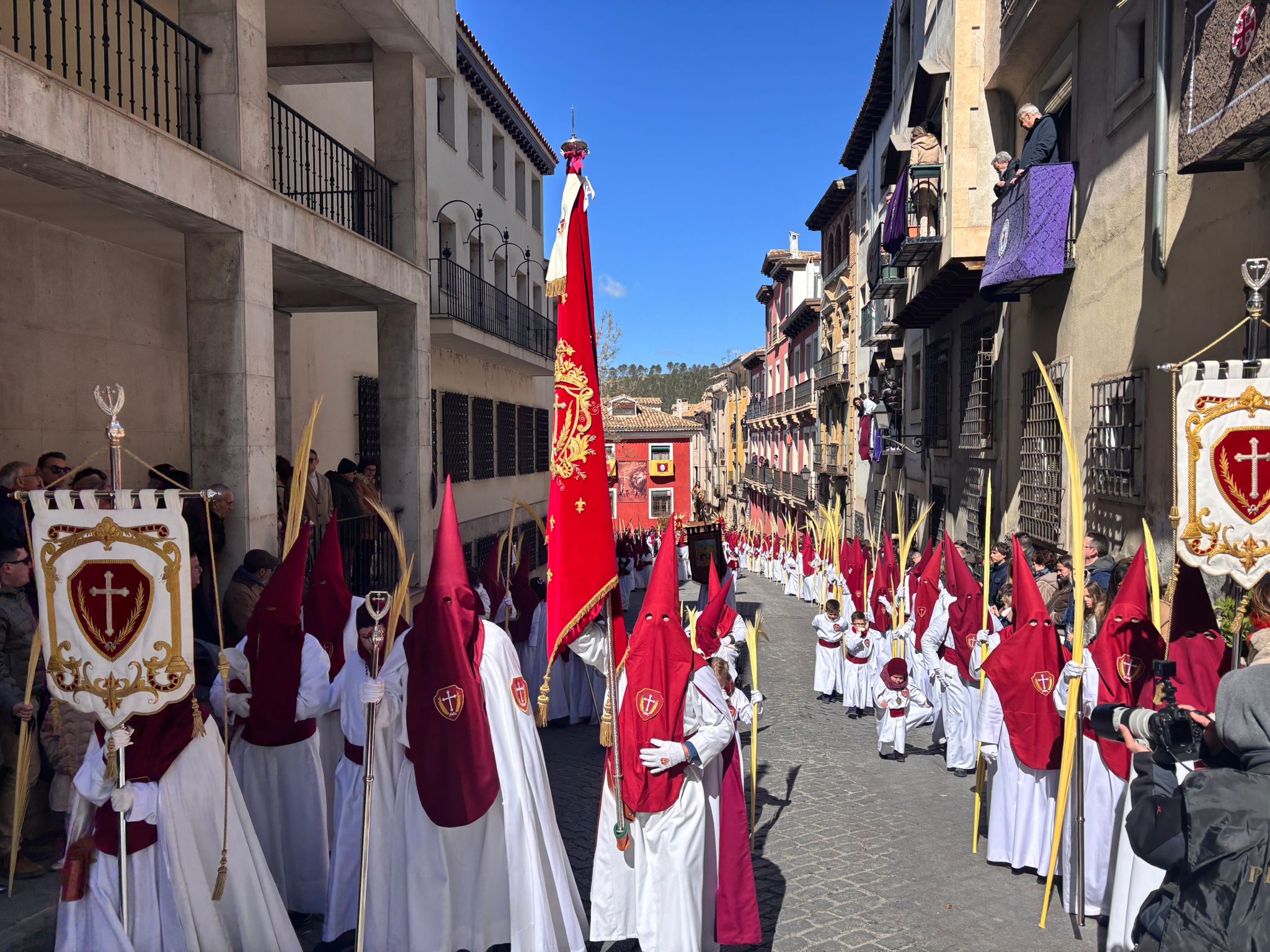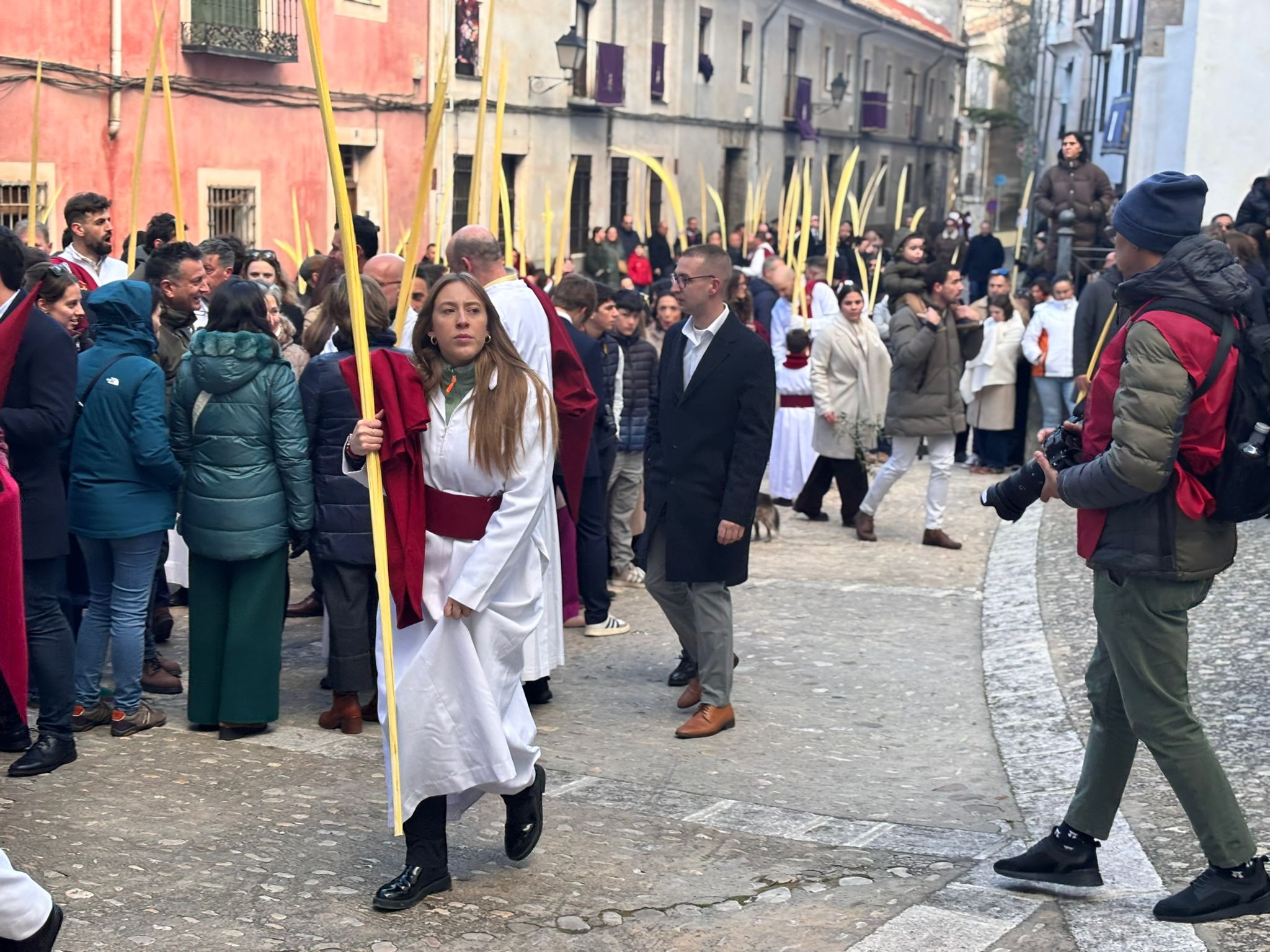 El sello de identidad del Domingo de Ramos de Cuenca son sus niños y niñas, este año bien abrigaditos para hacer frente a un frío que conspiraba con la fatiga. Los comentarios por la temperatura se multiplicaban en las aceras, pobladas pese a todo, porque la gente de esta tierra, como su ciudad, es impertérrita y hace falta algo más que un bravucón viento de componente norte para que un conquense se pierda la procesión del Hosanna.