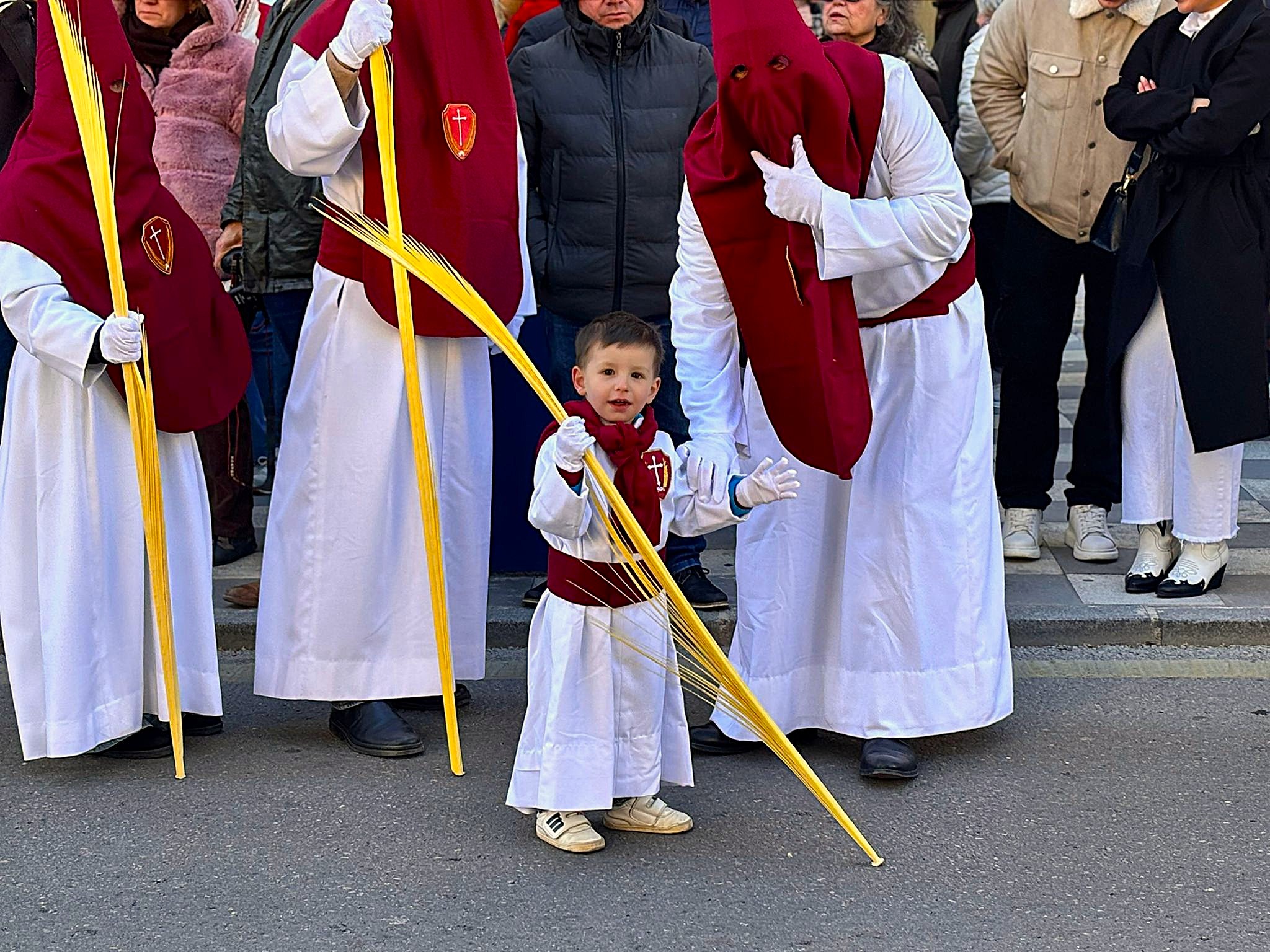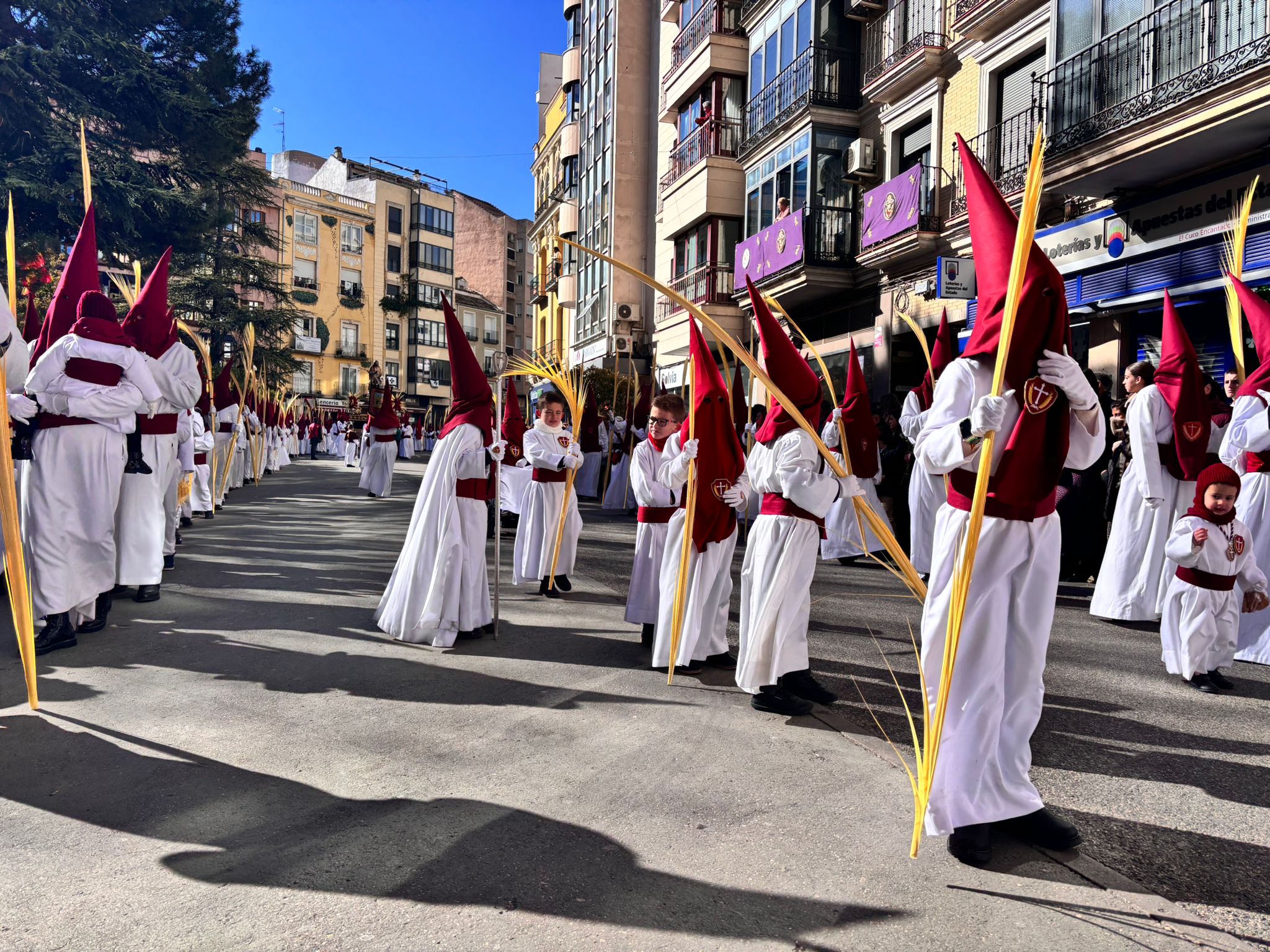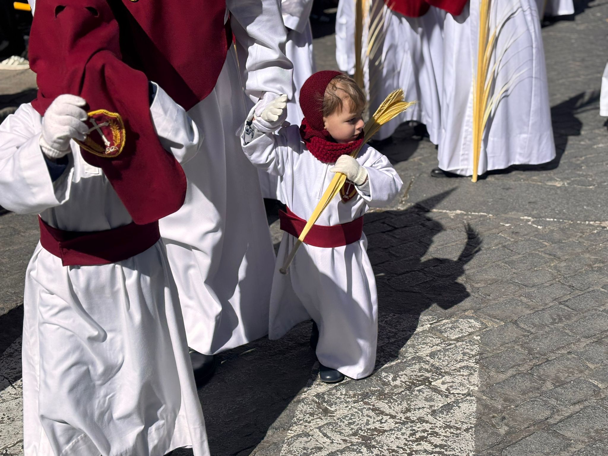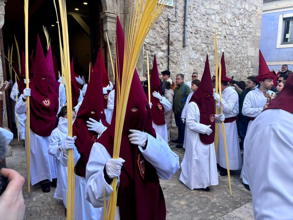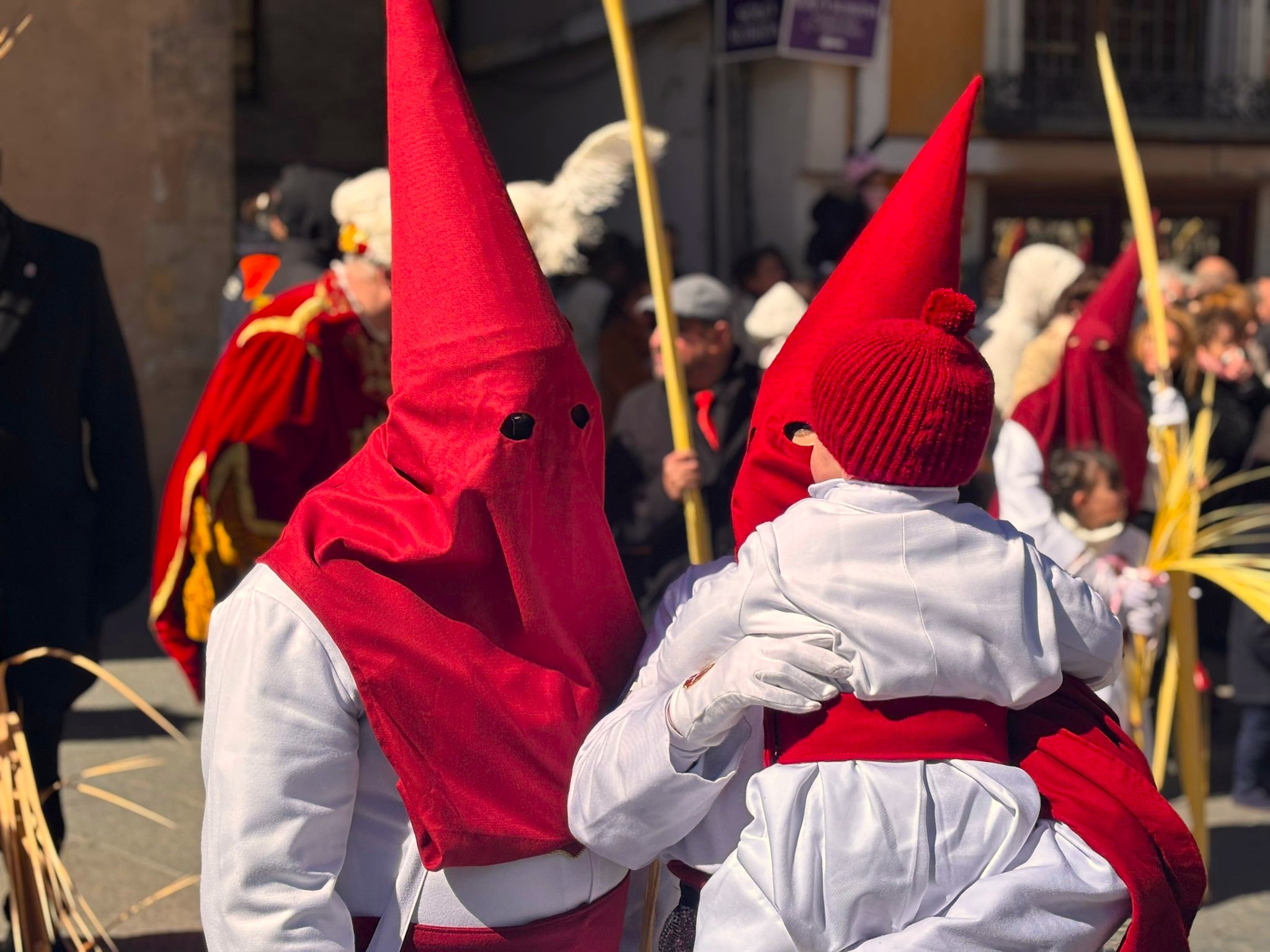 El sello de identidad del Domingo de Ramos de Cuenca son sus niños y niñas, este año bien abrigaditos para hacer frente a un frío que conspiraba con la fatiga. Los comentarios por la temperatura se multiplicaban en las aceras, pobladas pese a todo, porque la gente de esta tierra, como su ciudad, es impertérrita y hace falta algo más que un bravucón viento de componente norte para que un conquense se pierda la procesión del Hosanna.