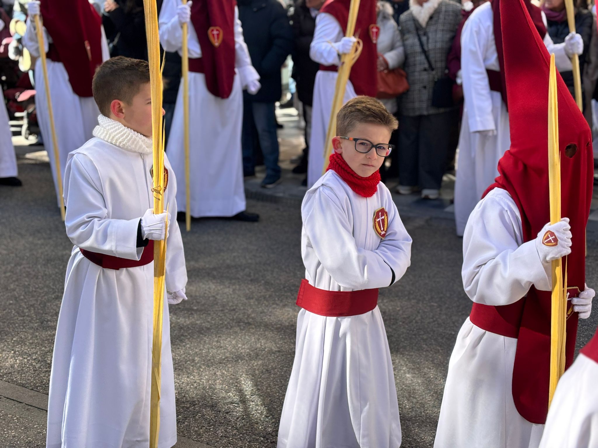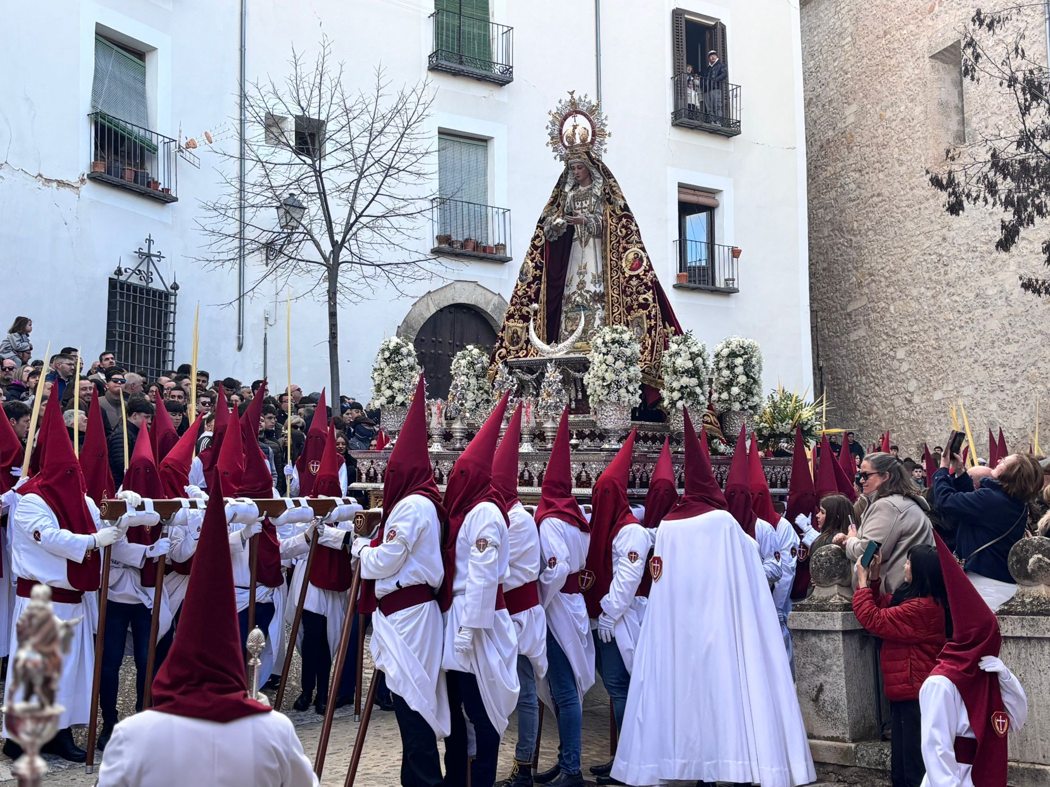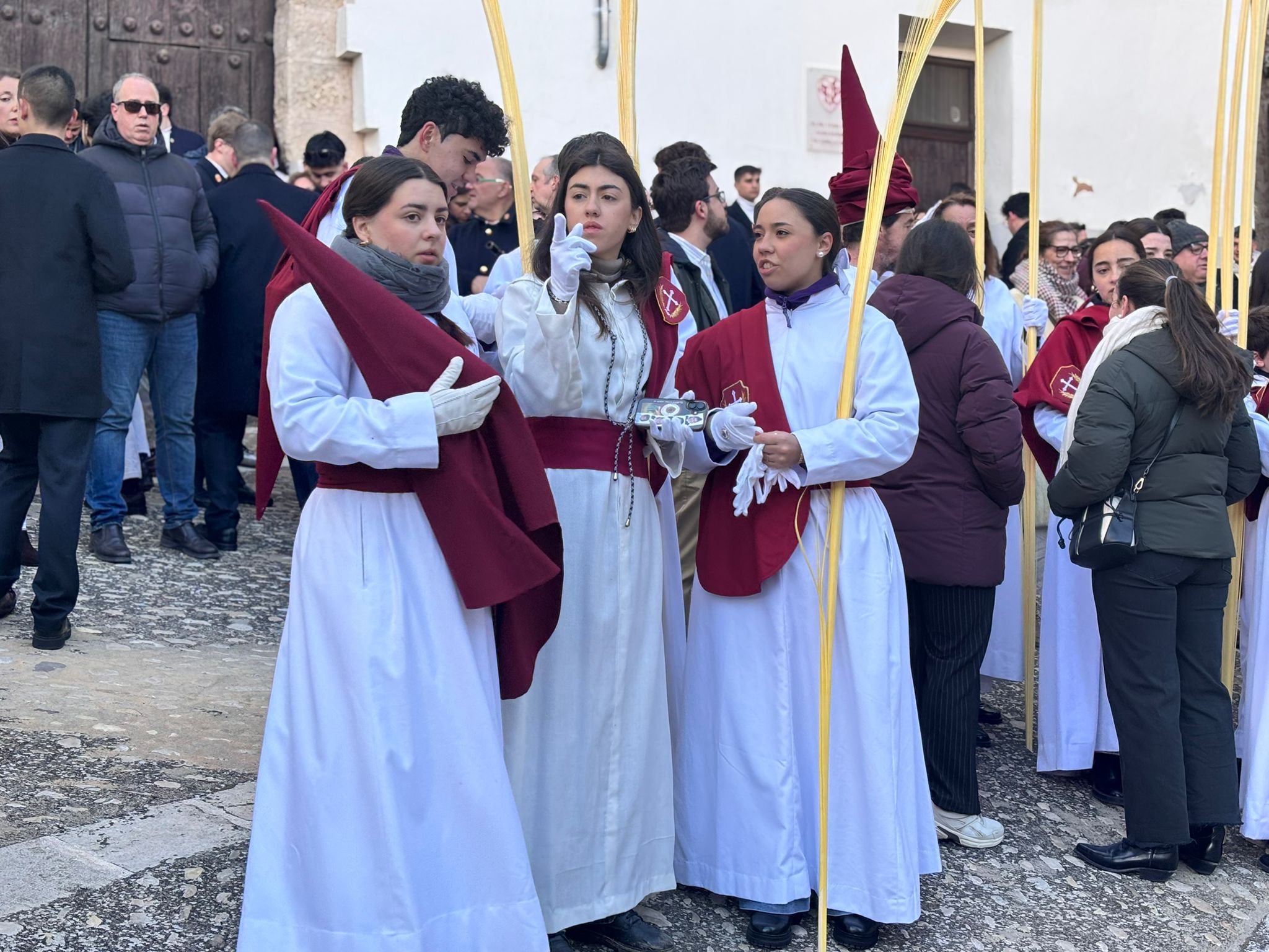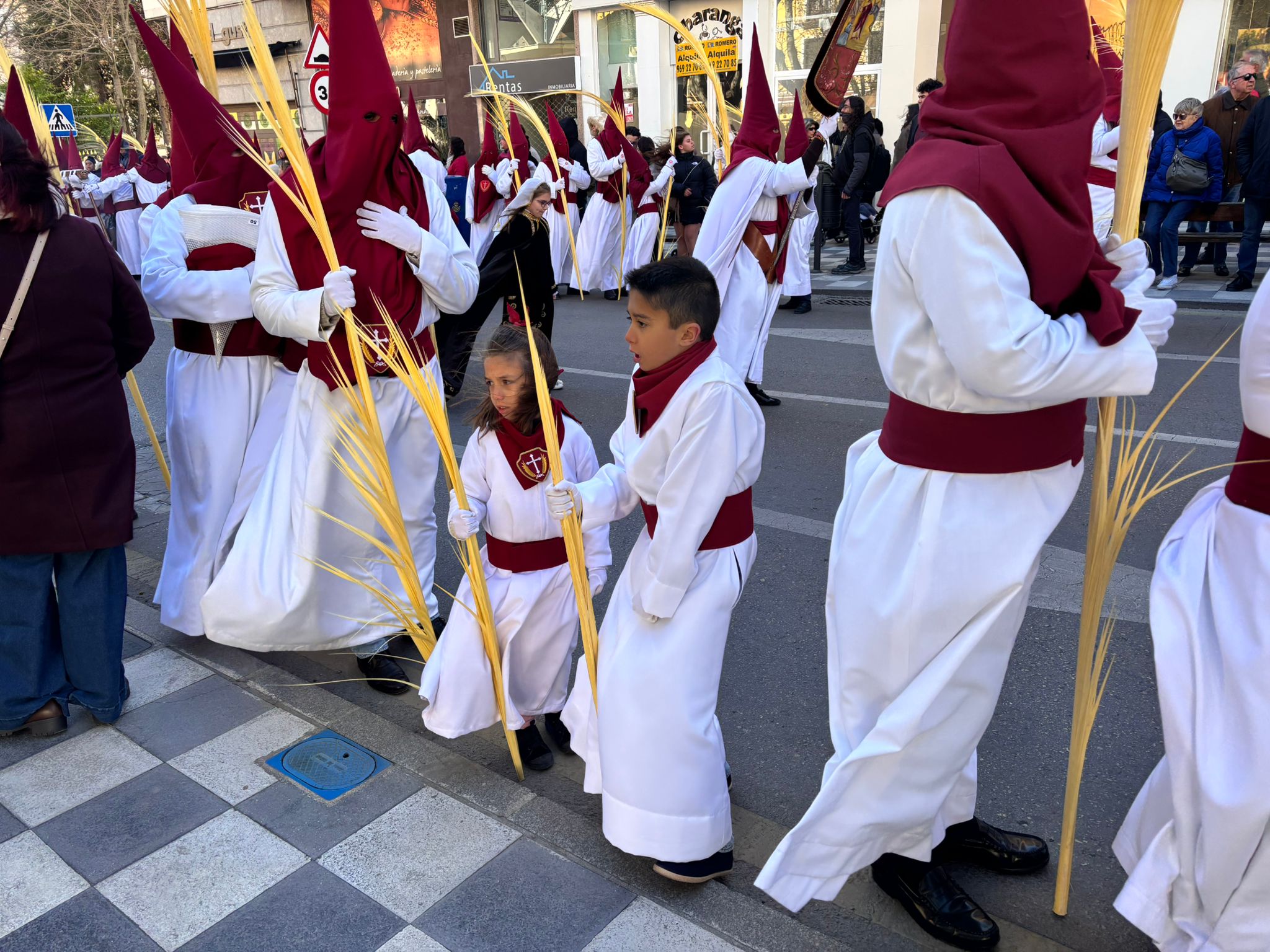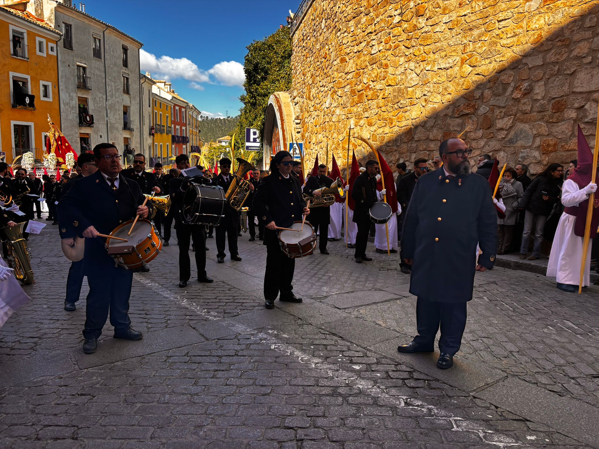 El sello de identidad del Domingo de Ramos de Cuenca son sus niños y niñas, este año bien abrigaditos para hacer frente a un frío que conspiraba con la fatiga. Los comentarios por la temperatura se multiplicaban en las aceras, pobladas pese a todo, porque la gente de esta tierra, como su ciudad, es impertérrita y hace falta algo más que un bravucón viento de componente norte para que un conquense se pierda la procesión del Hosanna.