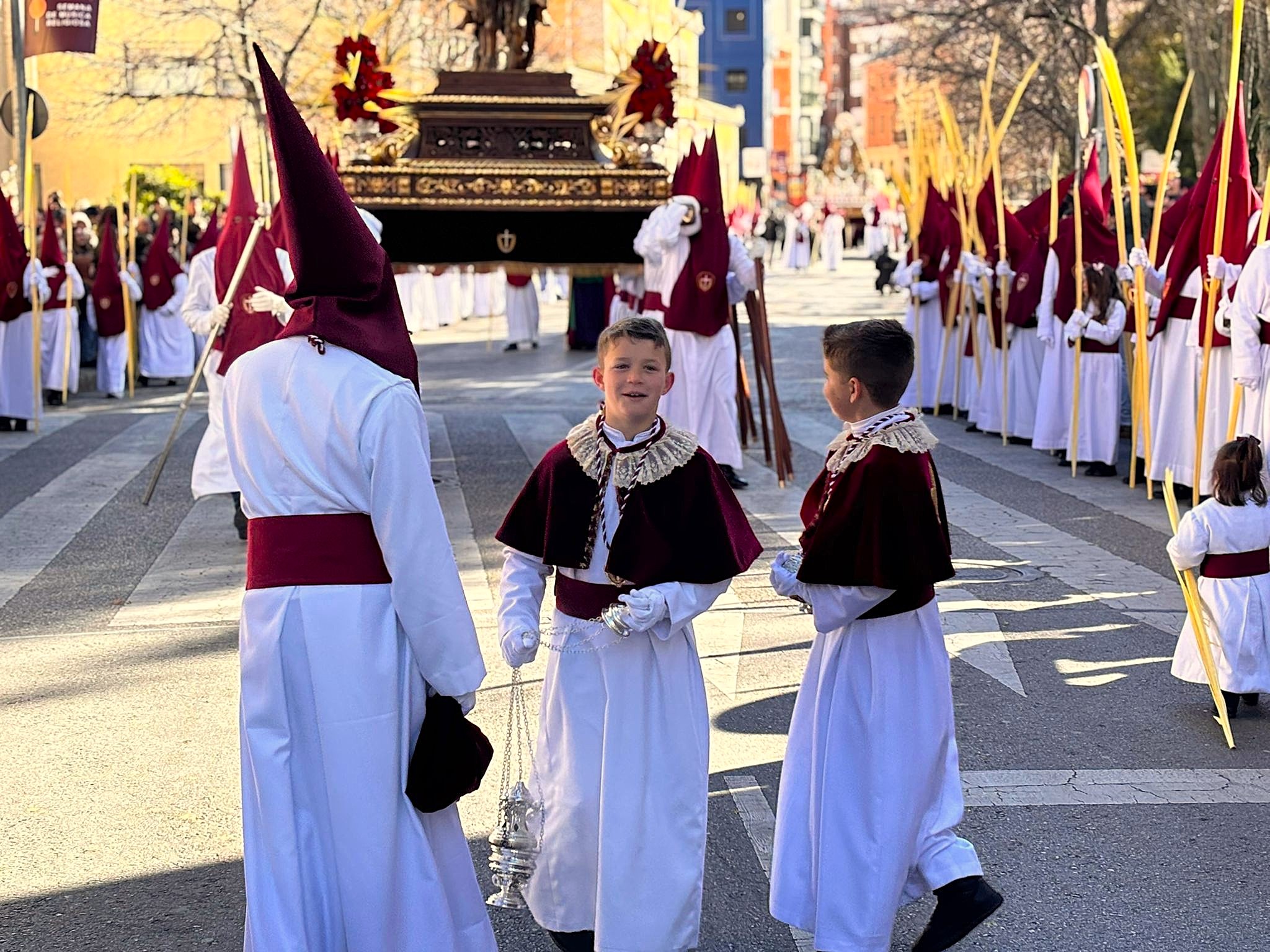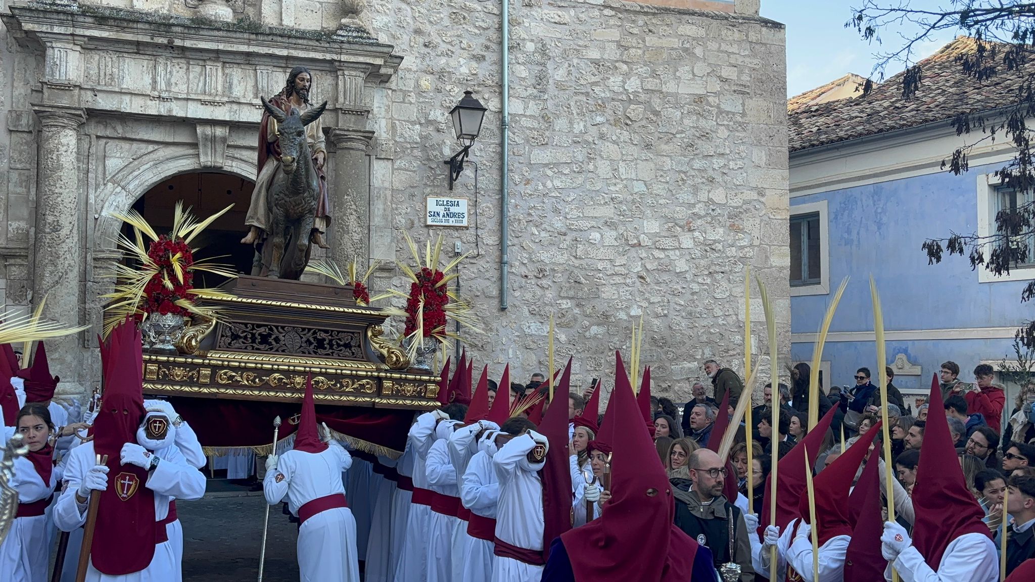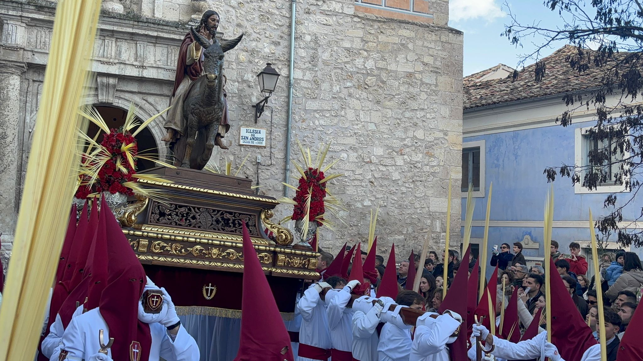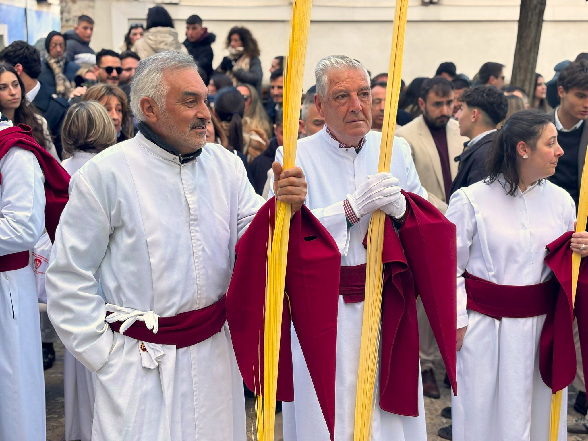 Sin embargo, a medida que el cortejo ascendía hacia la Plaza Mayor, el aire se volvía más insolente, hasta el punto que costaba avanzar con los pesados estandartes en alto. En cambio, las palmas filtraban estas furiosas corrientes de para transformarlas en regocijo cuando Jesús y La Virgen alcanzaban la iglesia de San Felipe Neri.