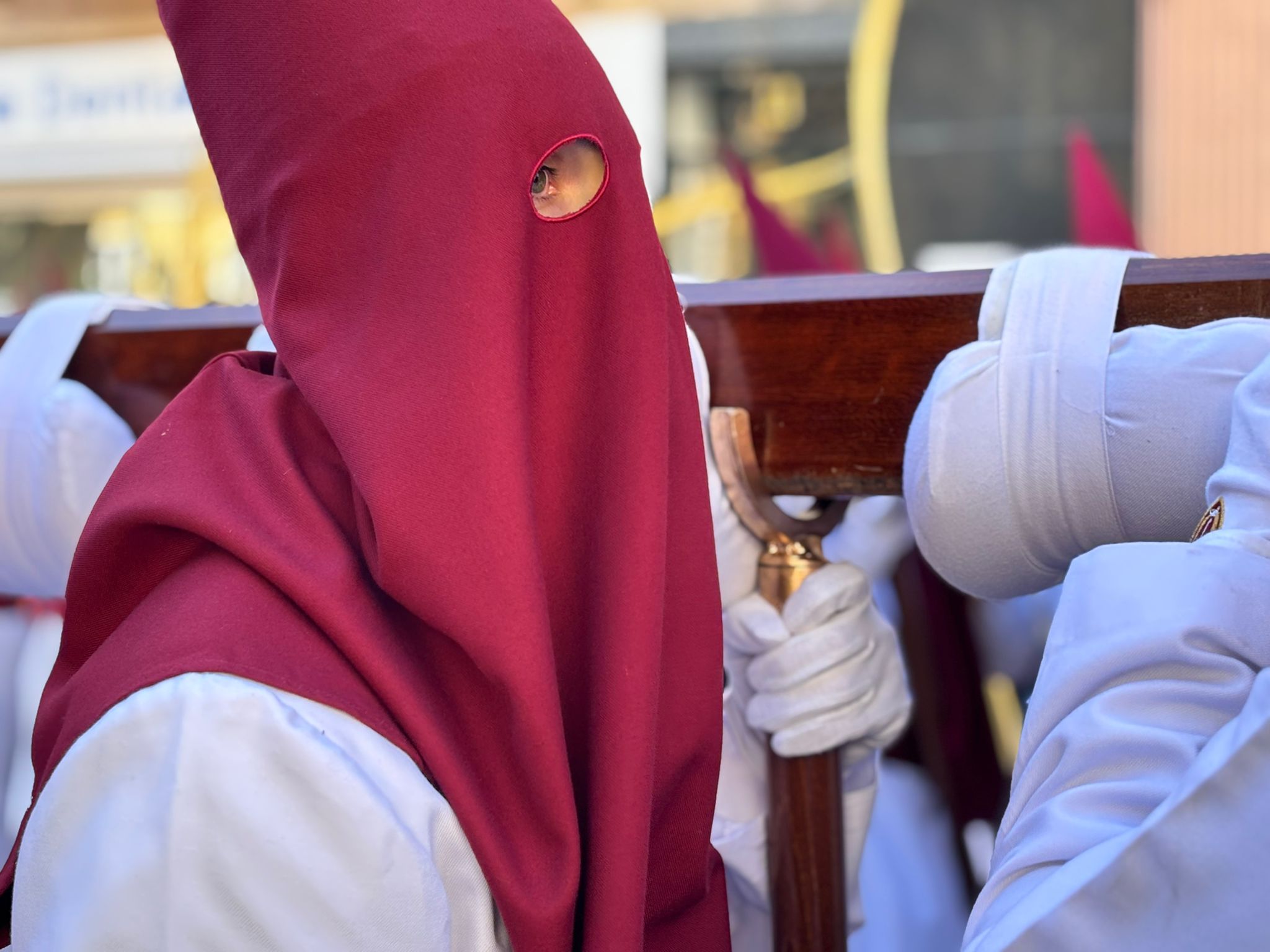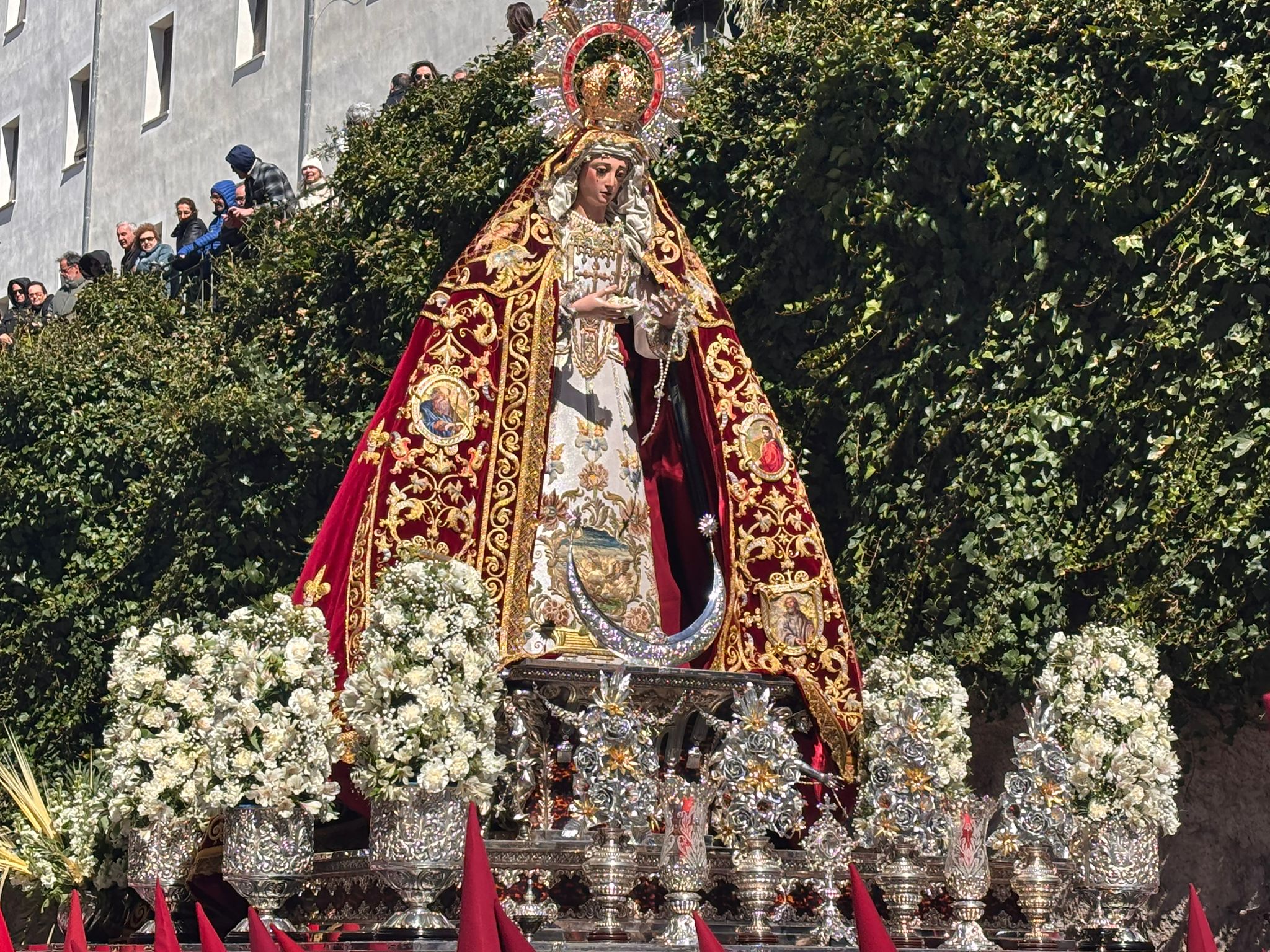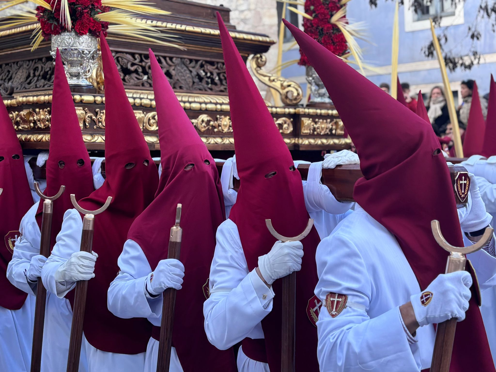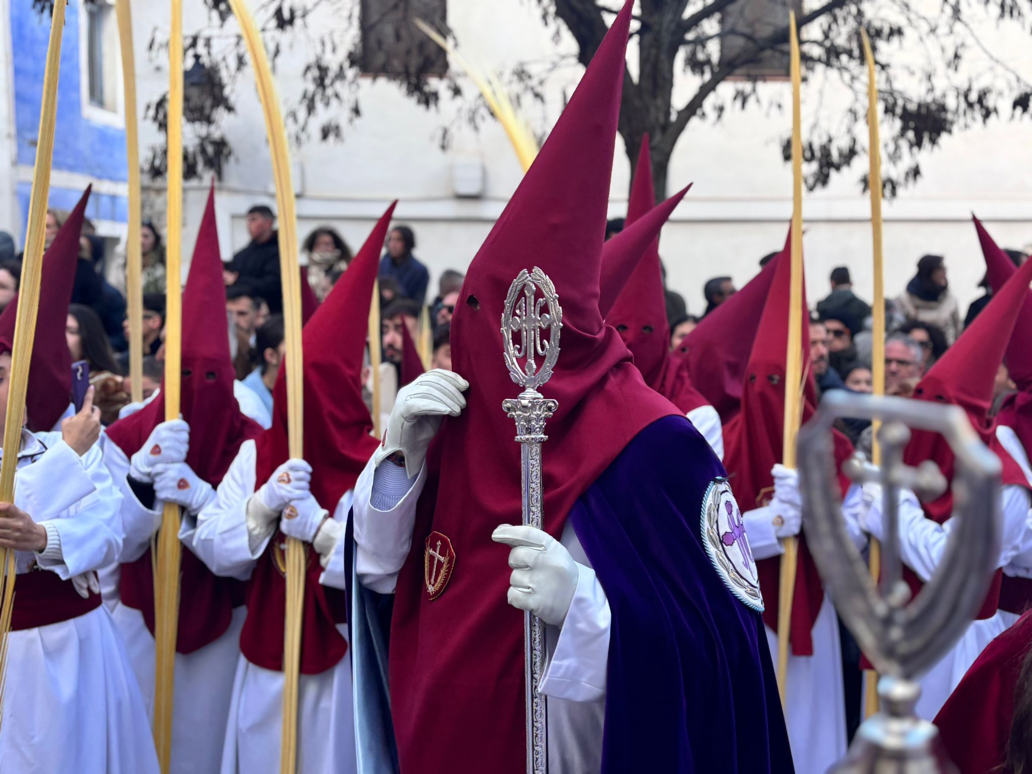 Sin embargo, a medida que el cortejo ascendía hacia la Plaza Mayor, el aire se volvía más insolente, hasta el punto que costaba avanzar con los pesados estandartes en alto. En cambio, las palmas filtraban estas furiosas corrientes de para transformarlas en regocijo cuando Jesús y La Virgen alcanzaban la iglesia de San Felipe Neri.