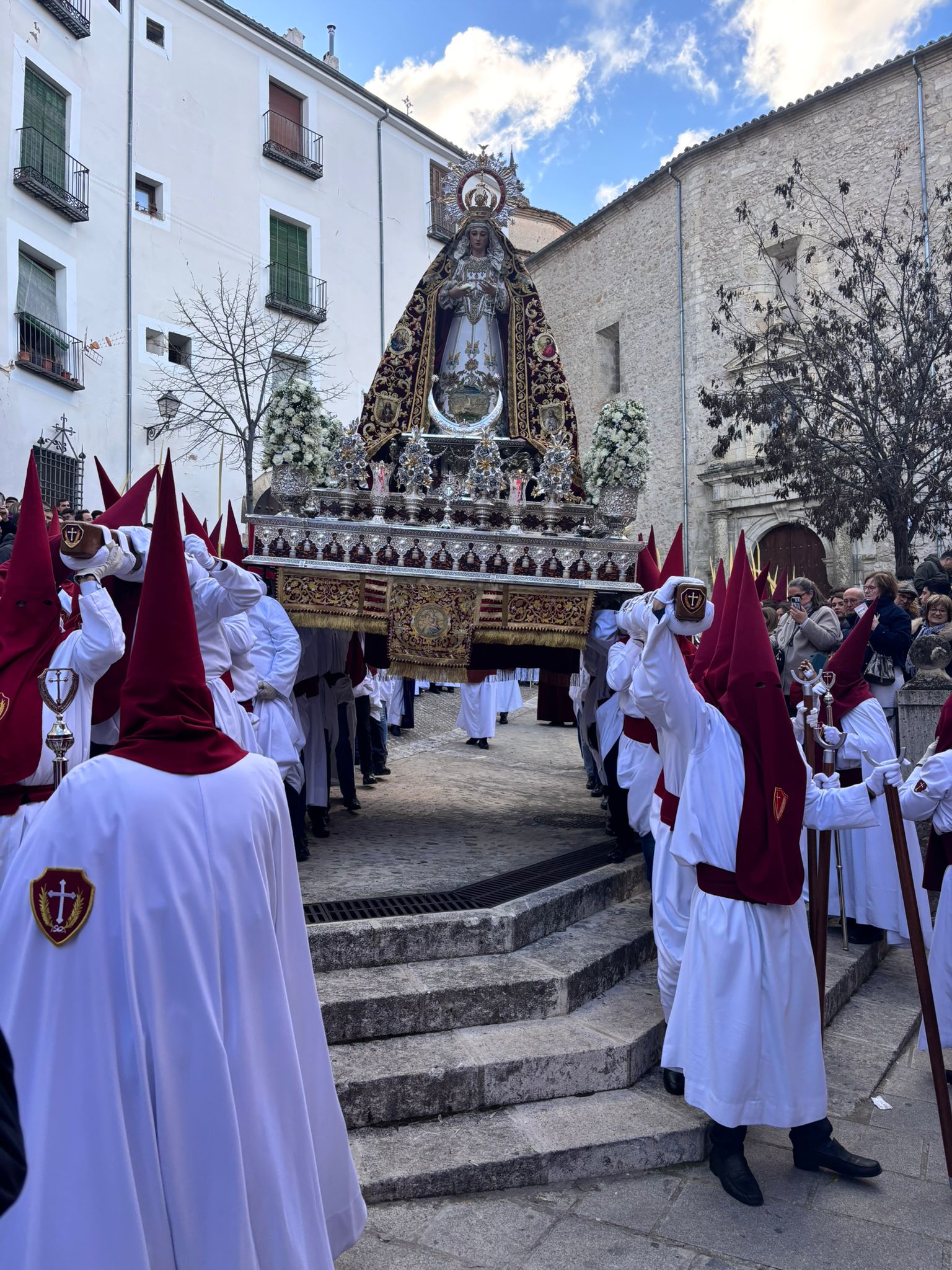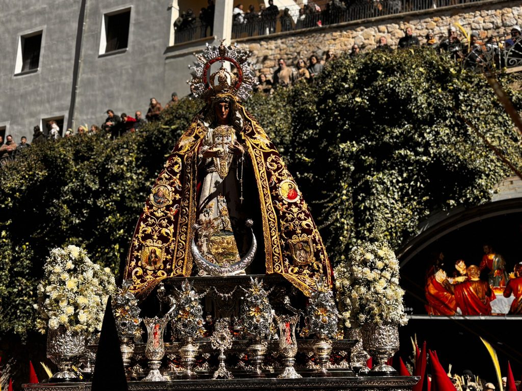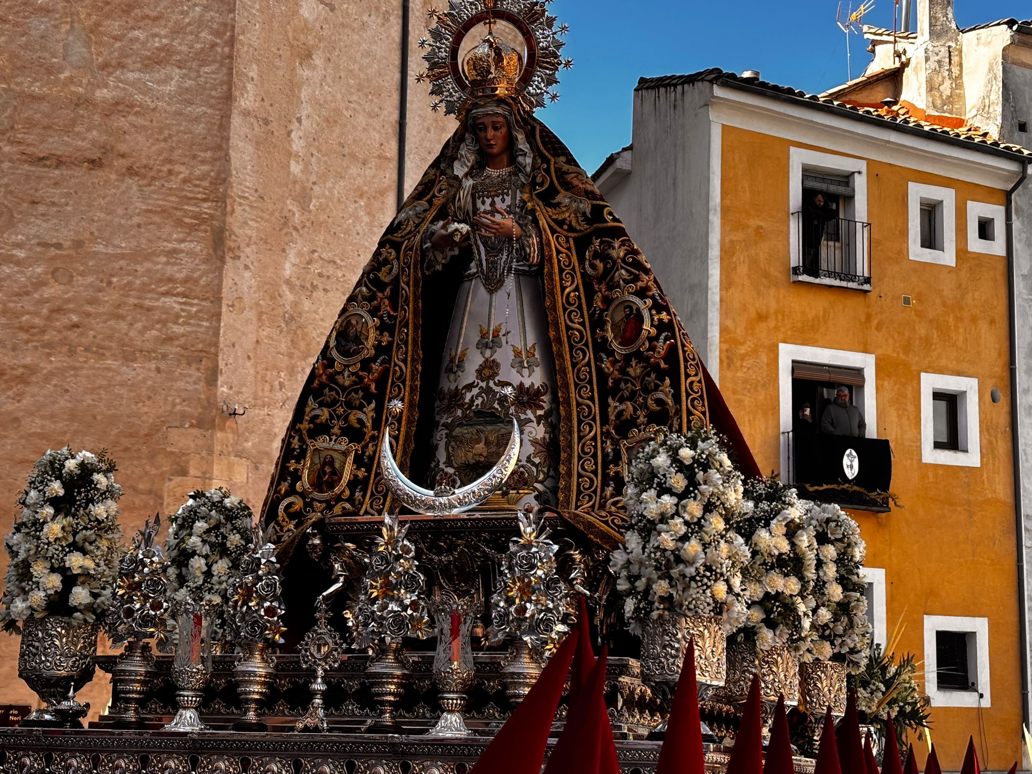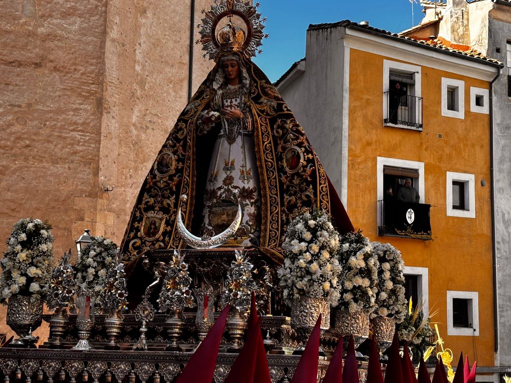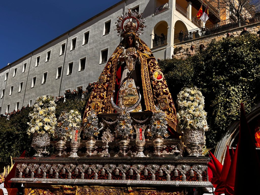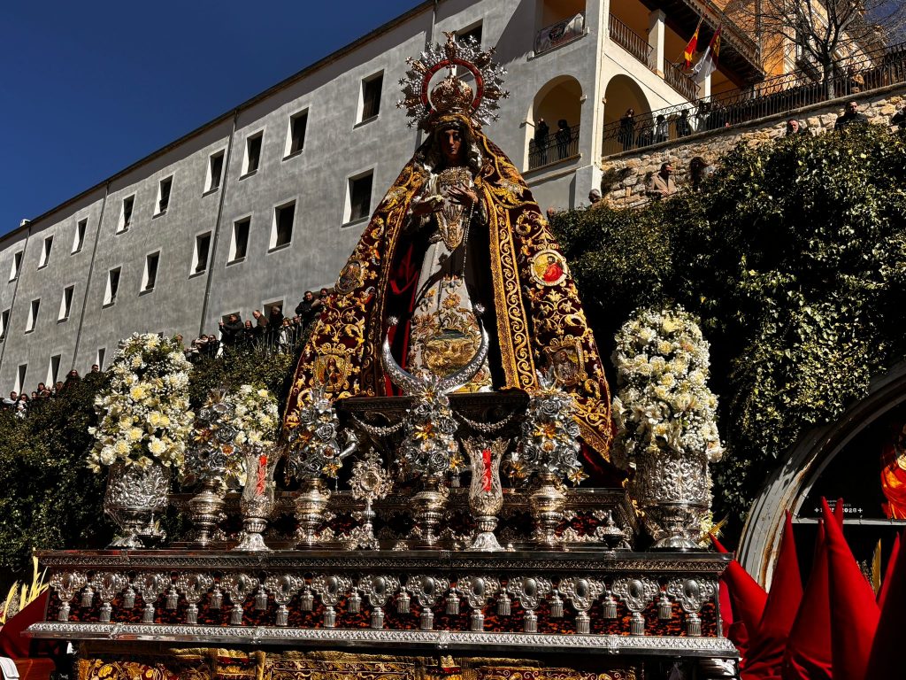 Tras la imagen de Marco Pérez ha salido a la calle la Virgen de la Esperanza, que este año ha recorrido la ciudad a hombros de 32 banceros, dos más que en su último recorrido por Cuenca. Juntos el Hijo y la Madre, se han dejado acariciar por el viento y la música en la Plaza de San Andrés antes de ponerse en marcha.