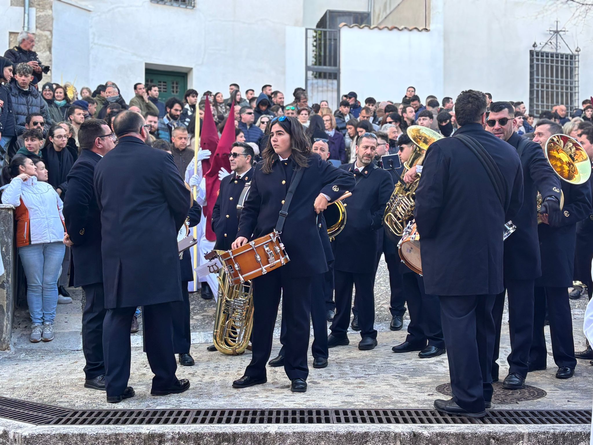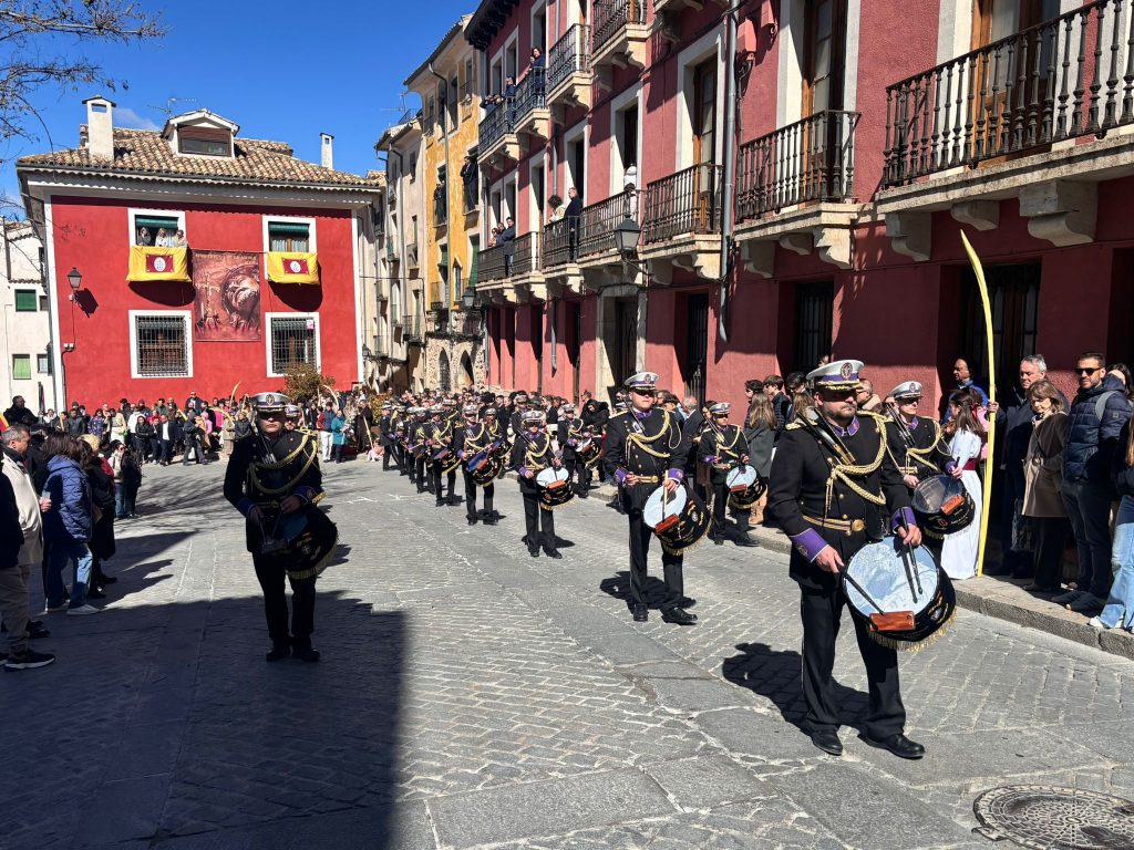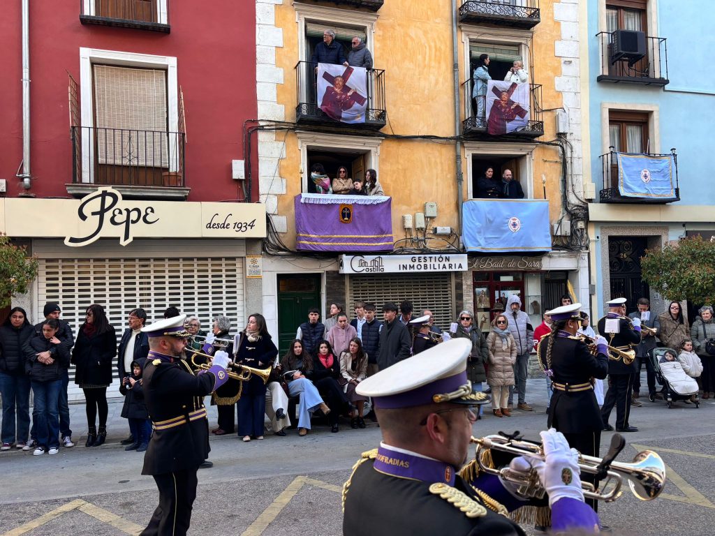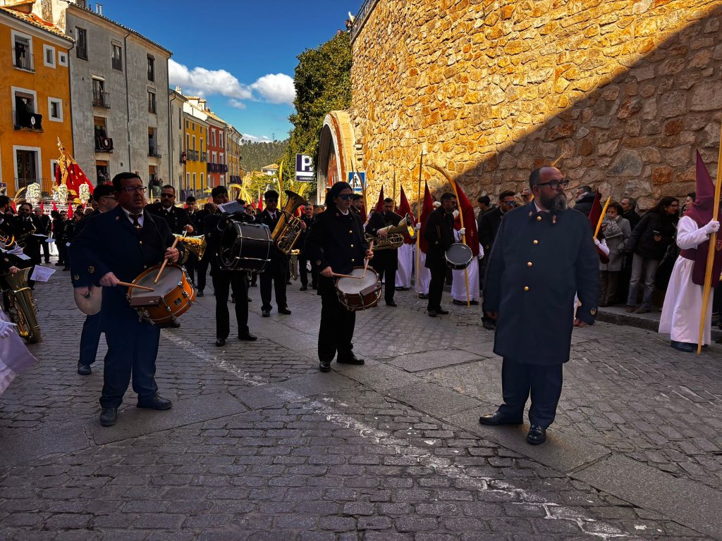 En la parte de atrás de la procesión, las marchas de la Banda de Música de Cuenca eran el combustible de un desfile que se mueve por la fe, pero siempre agradece que una melodía le acompañe en el camino.