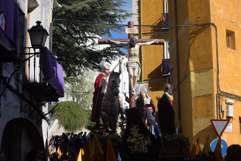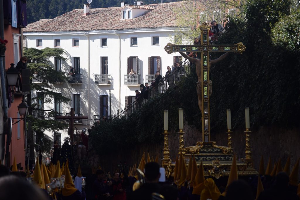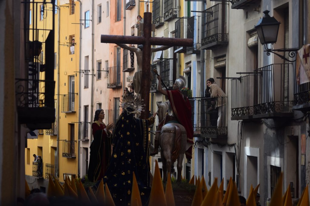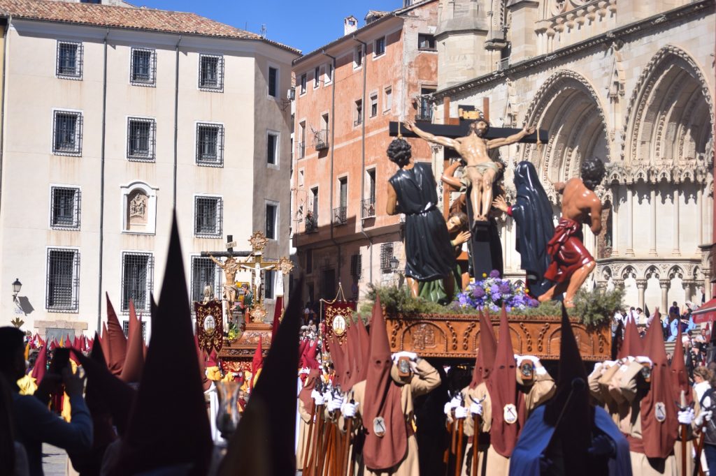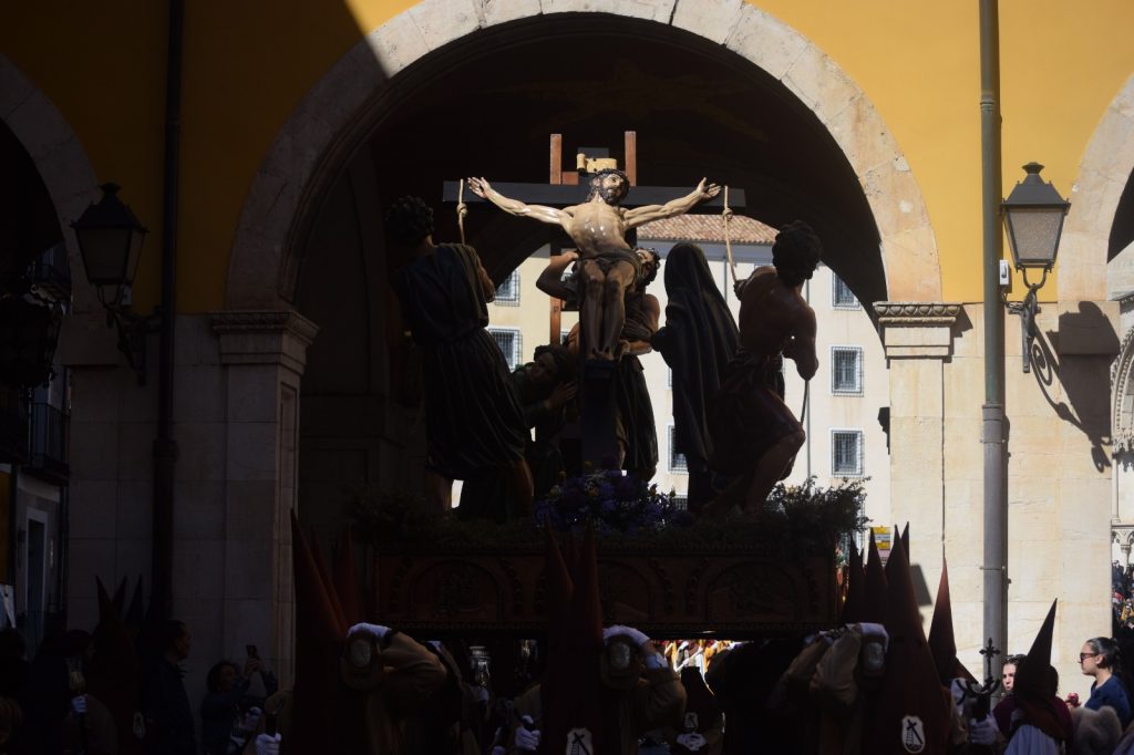 Tras una subida ágil, la procesión En El Calvario llega a una Plaza de Mayor que ya no está tan abarrotada como unas horas antes, lo que permite a los espectadores disfrutar sin apretujones de la llegada de estos pasos al son de las bandas de Cuenca, Villarejo de Fuentes, Almonacid del Marquesado, Las Mesas y Morata de Tajuña.