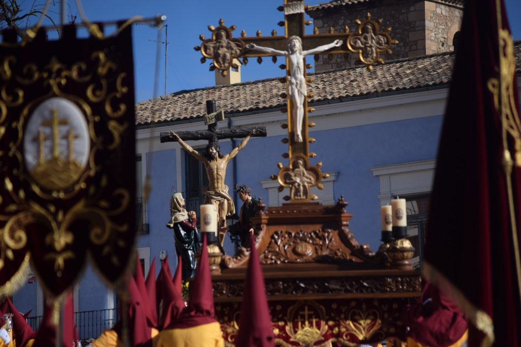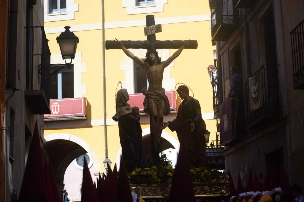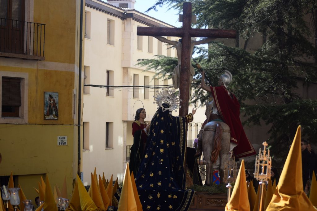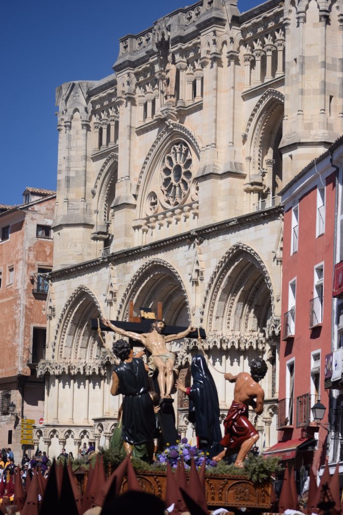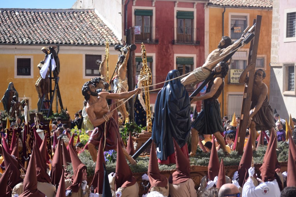 Tras una subida ágil, la procesión En El Calvario llega a una Plaza de Mayor que ya no está tan abarrotada como unas horas antes, lo que permite a los espectadores disfrutar sin apretujones de la llegada de estos pasos al son de las bandas de Cuenca, Villarejo de Fuentes, Almonacid del Marquesado, Las Mesas y Morata de Tajuña.