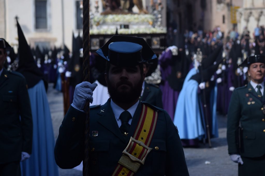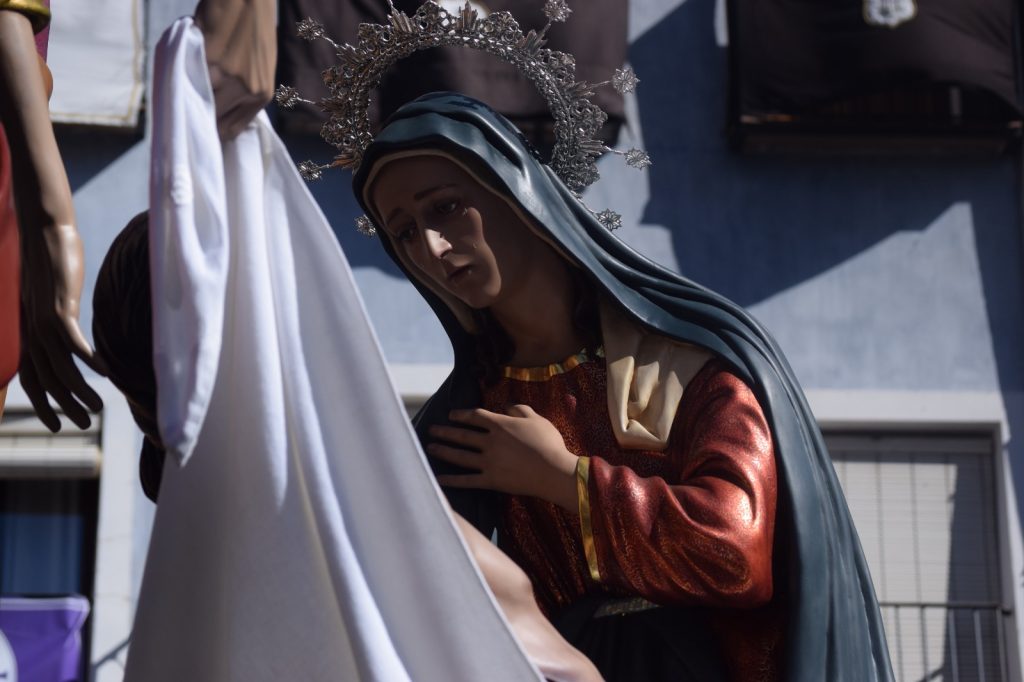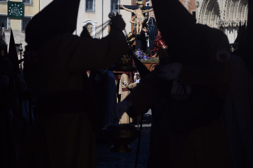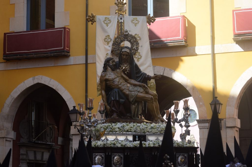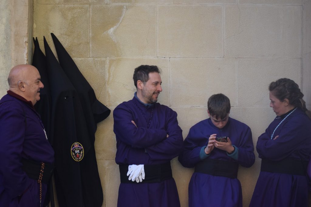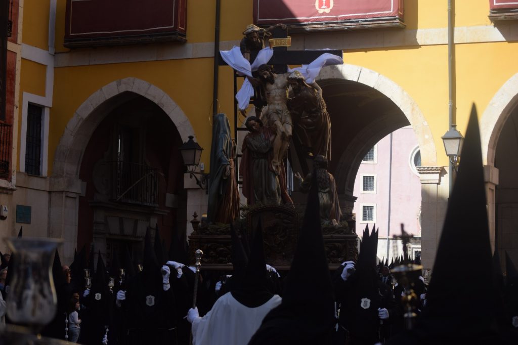 Con la comitiva ya en marcha, la Virgen de las Angustias ultimaba los detalles de su salida en el convento de las Concepcionistas de la Puerta de Valencia. Los banceros acunaban al Cristo Descendido mientras dejaban paso a la hermandad que encabezaba la procesión. Después han iniciado su camino, con esa serenidad que tanto cuesta conservar en la tragedia.