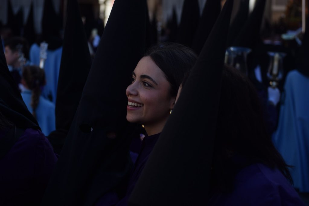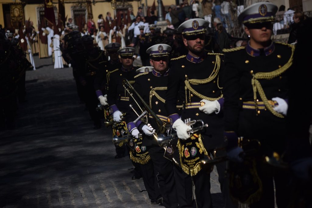 Tras el receso, la procesión ha iniciado su descenso bajo un calor al que le ha costado hacer acto de presencia en esta Semana Santa. Al frente del desfile, nuevamente, la Exaltación, que es la primera hermandad que recibe el Miserere del Coro del Conservatorio en San Felipe Neri. Estas voces entonaron también el Jesu Christe de Van Berchem para los dos pasos del Cristo de la Agonía y el Stabat Mater a la Virgen.