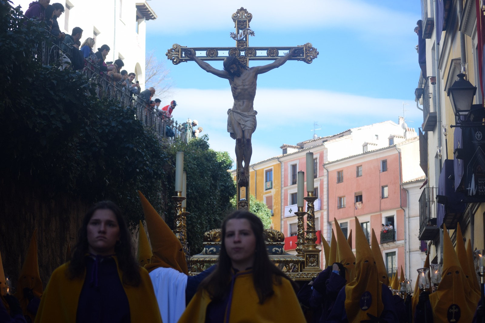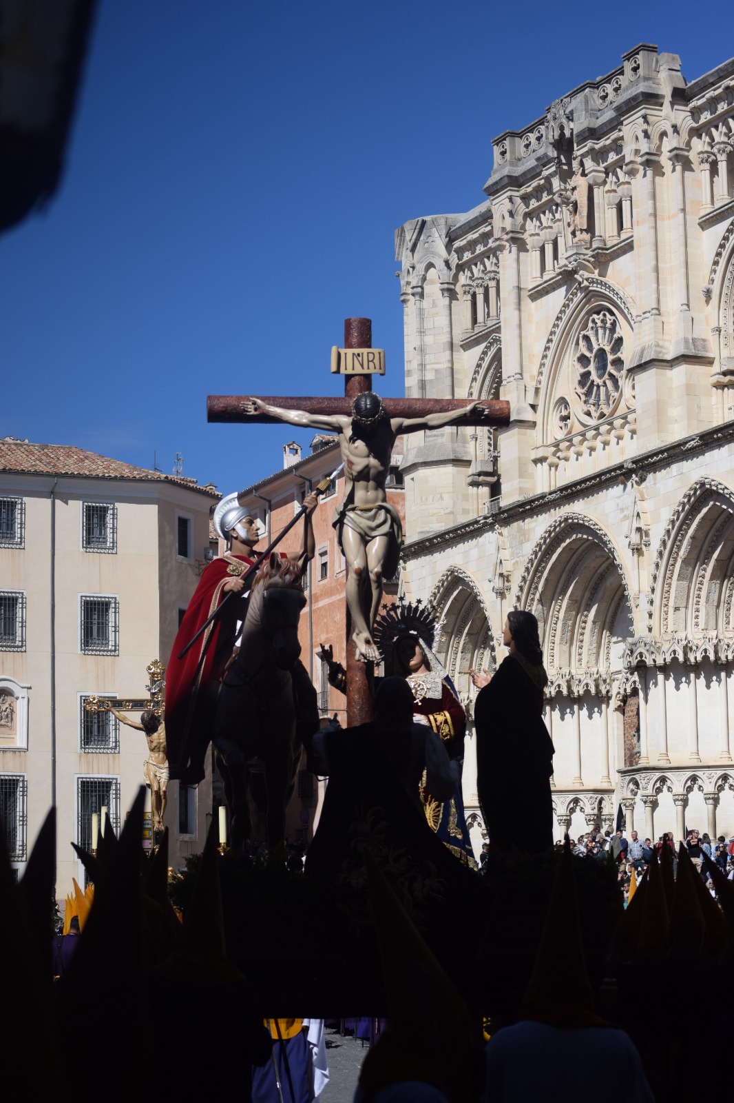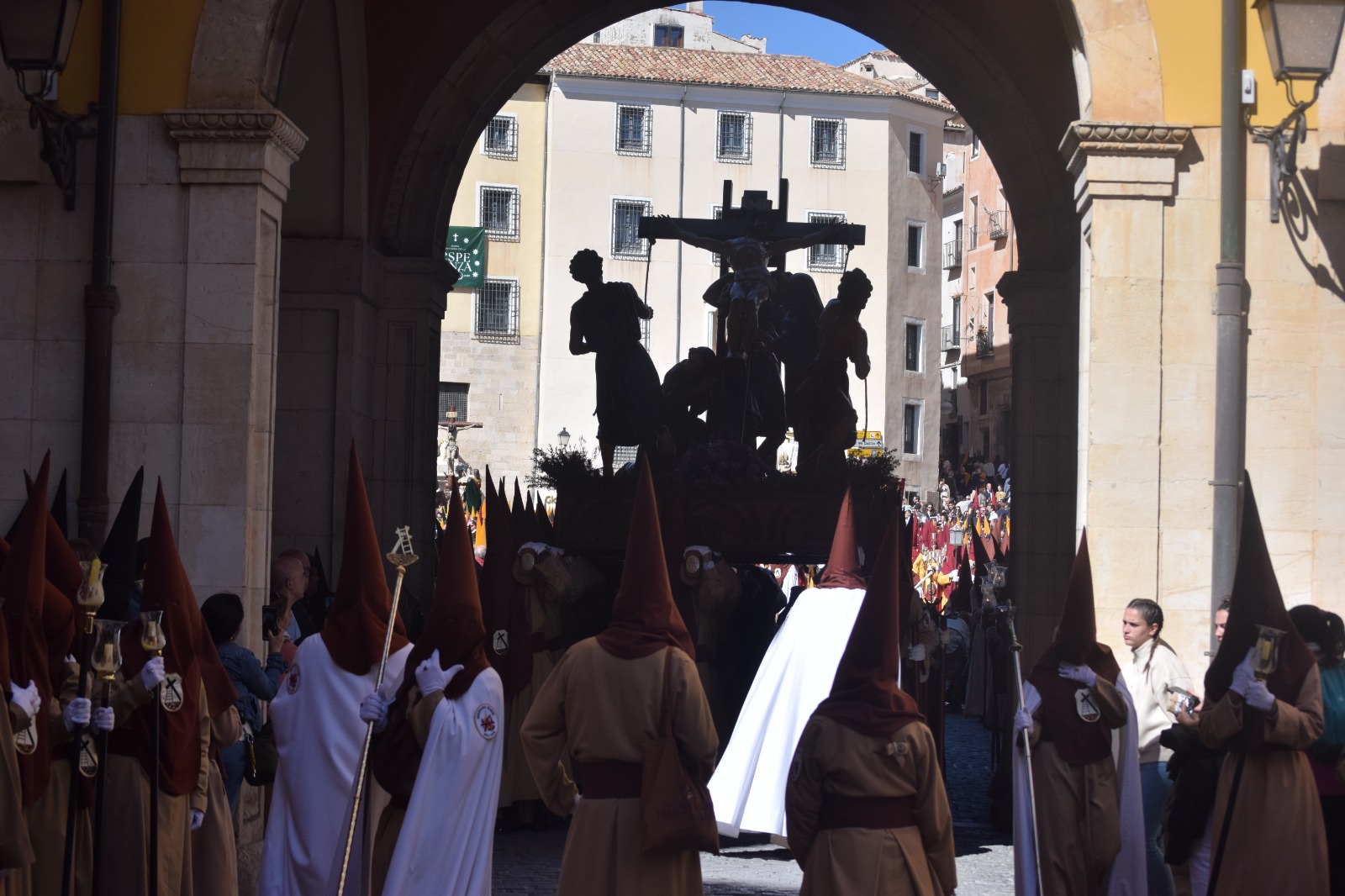 El Viernes Santo conquense, antes de ponerse el luto, viste hábitos de colores para que en Calvario, el Cristo que la ciudad ve perecer pueda marcharse con una última luz al otro lado.