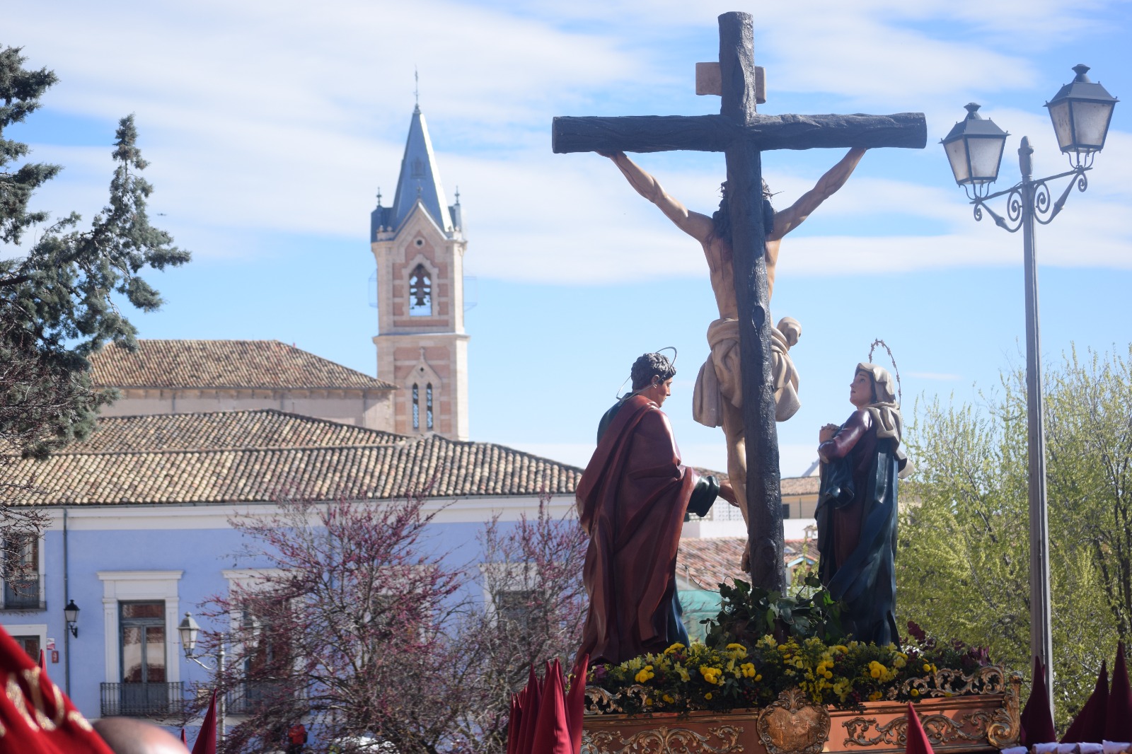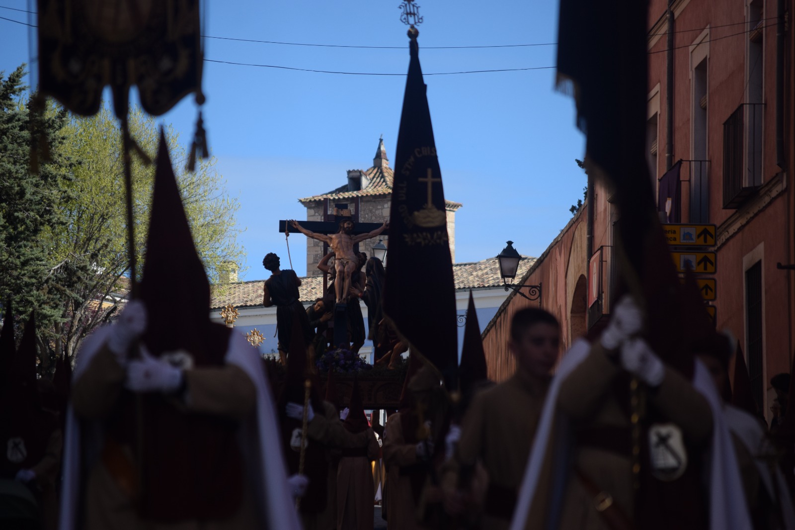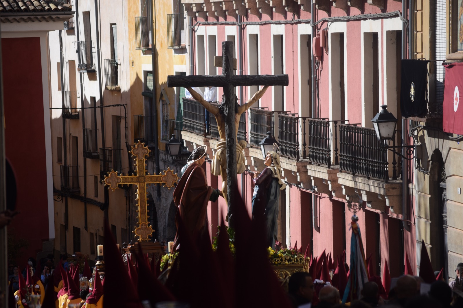 Tras una subida ágil, la procesión En El Calvario llega a una Plaza de Mayor que ya no está tan abarrotada como unas horas antes, lo que permite a los espectadores disfrutar sin apretujones de la llegada de estos pasos al son de las bandas de Cuenca, Villarejo de Fuentes, Almonacid del Marquesado, Las Mesas y Morata de Tajuña.