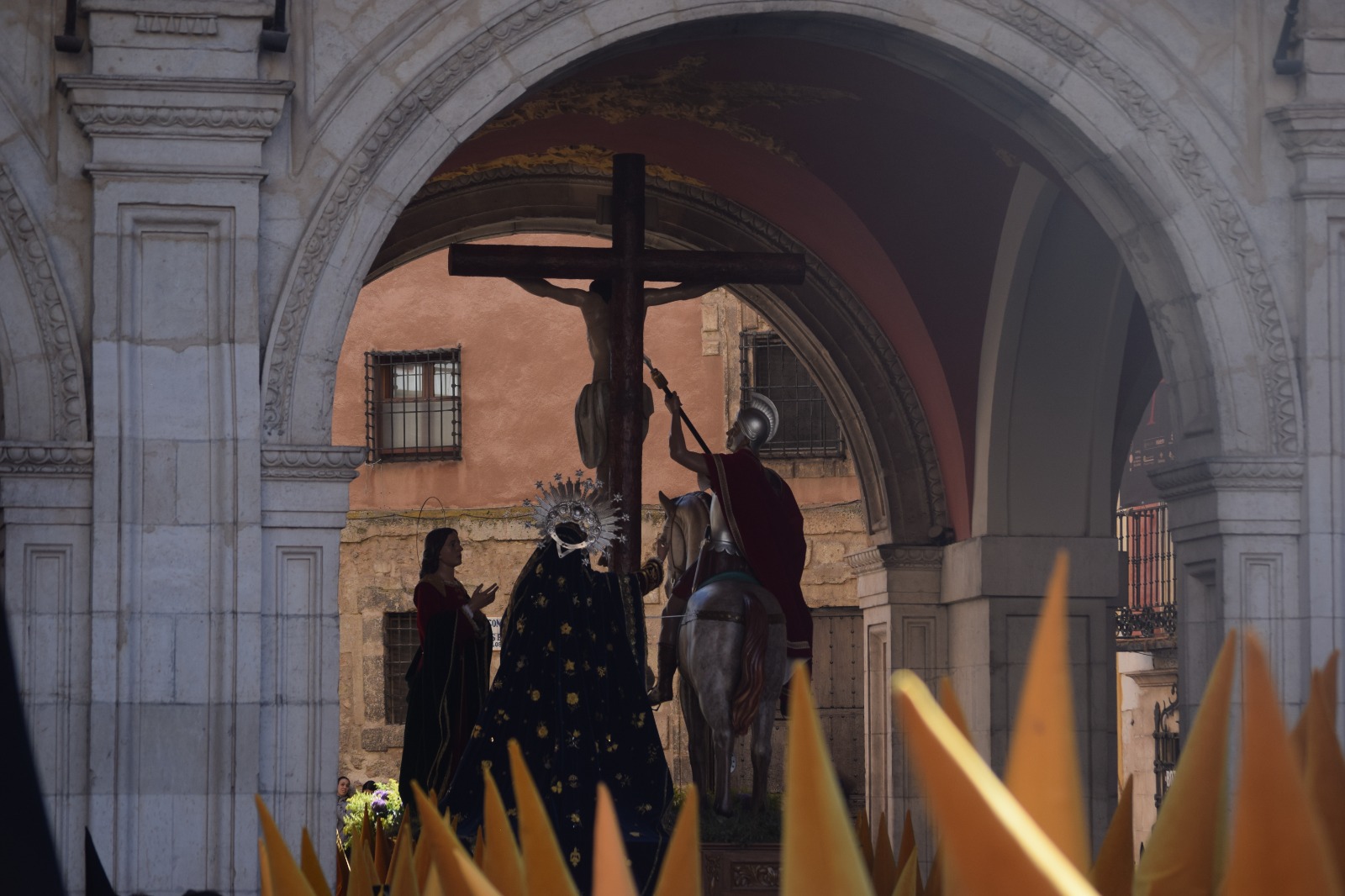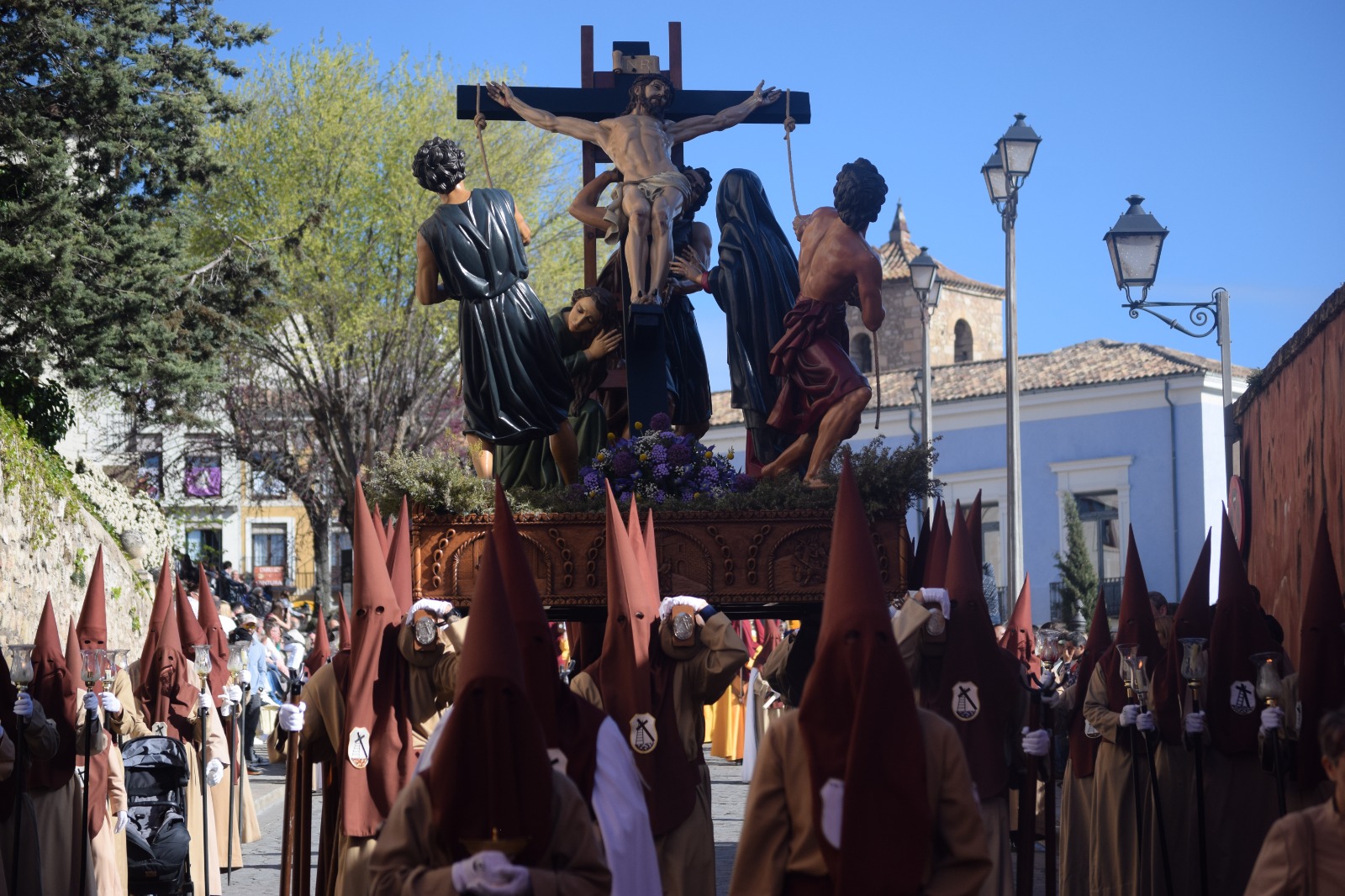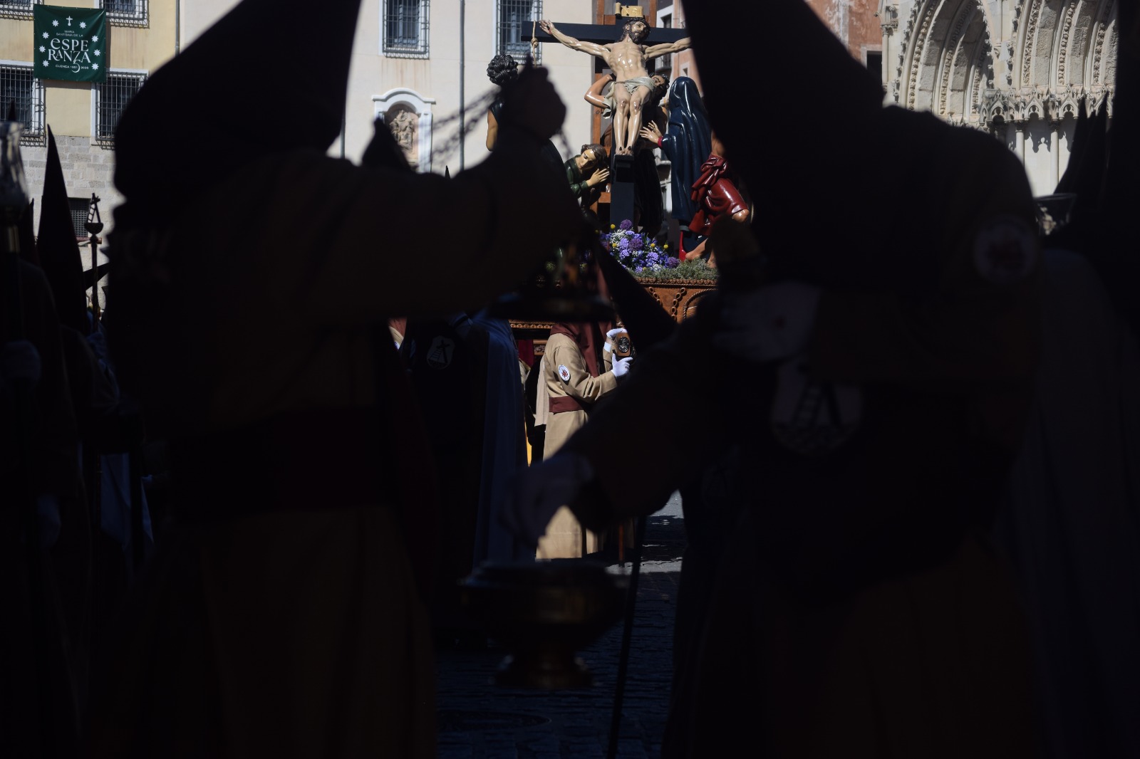 Tras una subida ágil, la procesión En El Calvario llega a una Plaza de Mayor que ya no está tan abarrotada como unas horas antes, lo que permite a los espectadores disfrutar sin apretujones de la llegada de estos pasos al son de las bandas de Cuenca, Villarejo de Fuentes, Almonacid del Marquesado, Las Mesas y Morata de Tajuña.