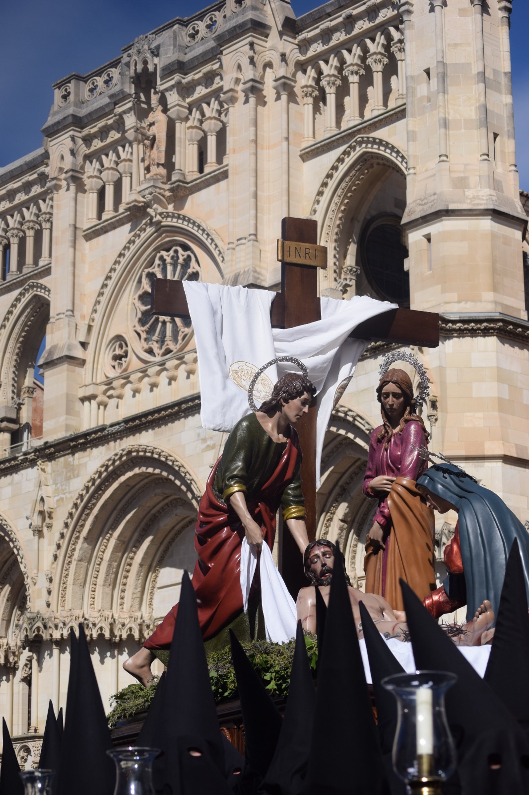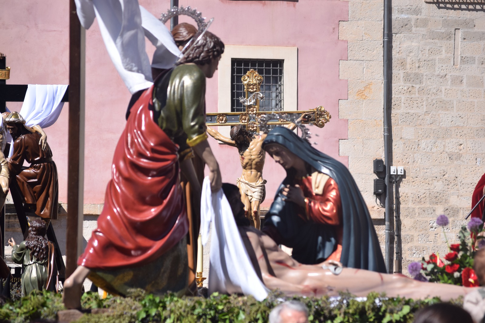 A continuación, sale del templo de la Plaza de la Hispanidad el segundo paso de la hermandad del Santísimo Cristo del Perdón, el Descendimiento, con un nuevo sudario tendido en la cruz.