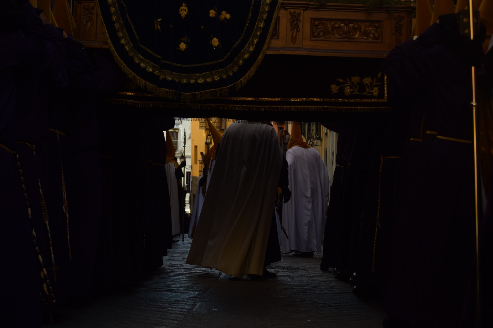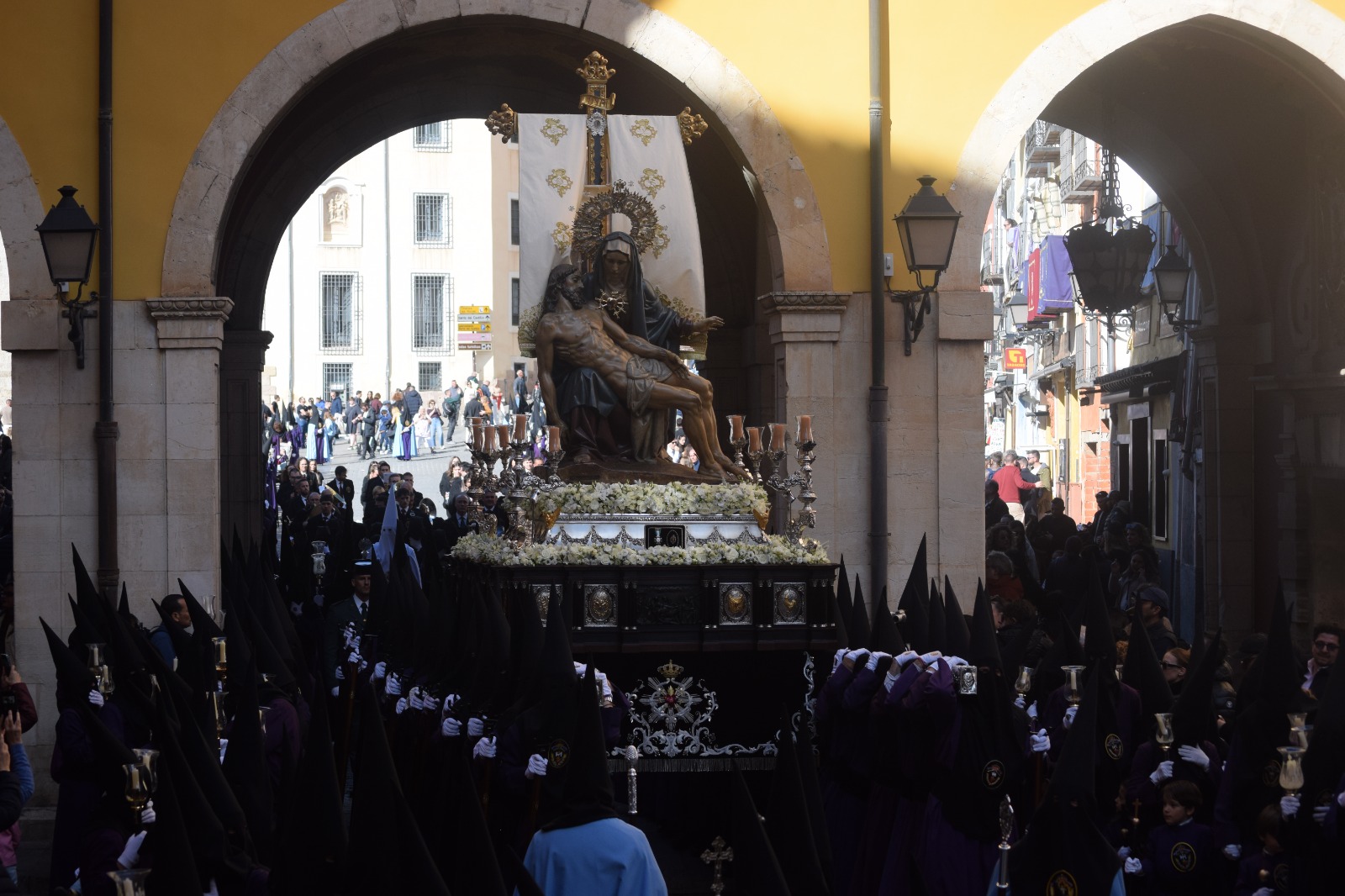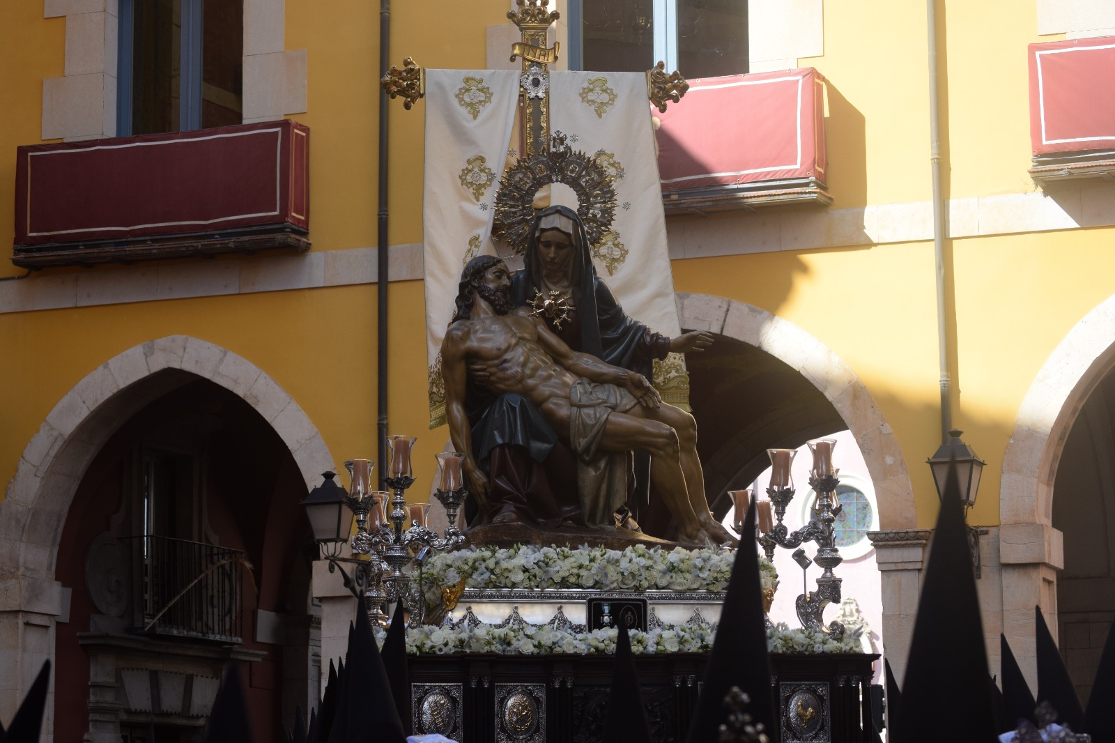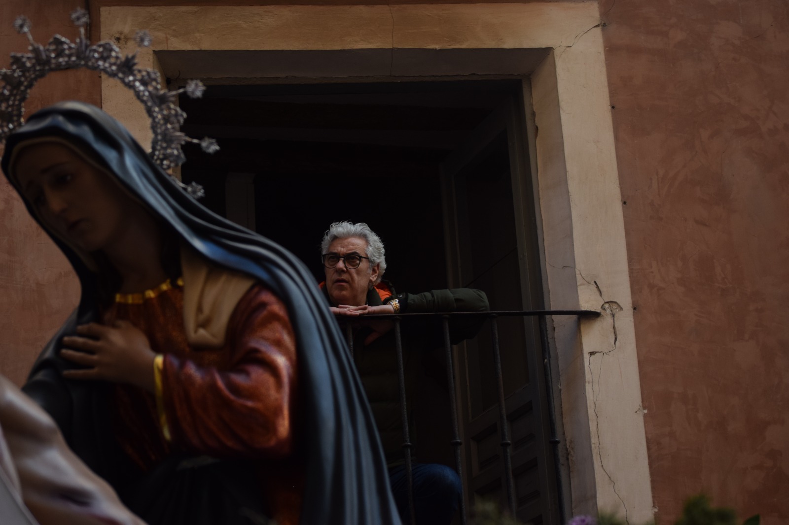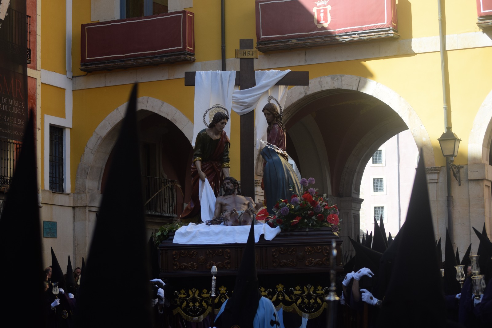 Con la comitiva ya en marcha, la Virgen de las Angustias ultimaba los detalles de su salida en el convento de las Concepcionistas de la Puerta de Valencia. Los banceros acunaban al Cristo Descendido mientras dejaban paso a la hermandad que encabezaba la procesión. Después han iniciado su camino, con esa serenidad que tanto cuesta conservar en la tragedia.
