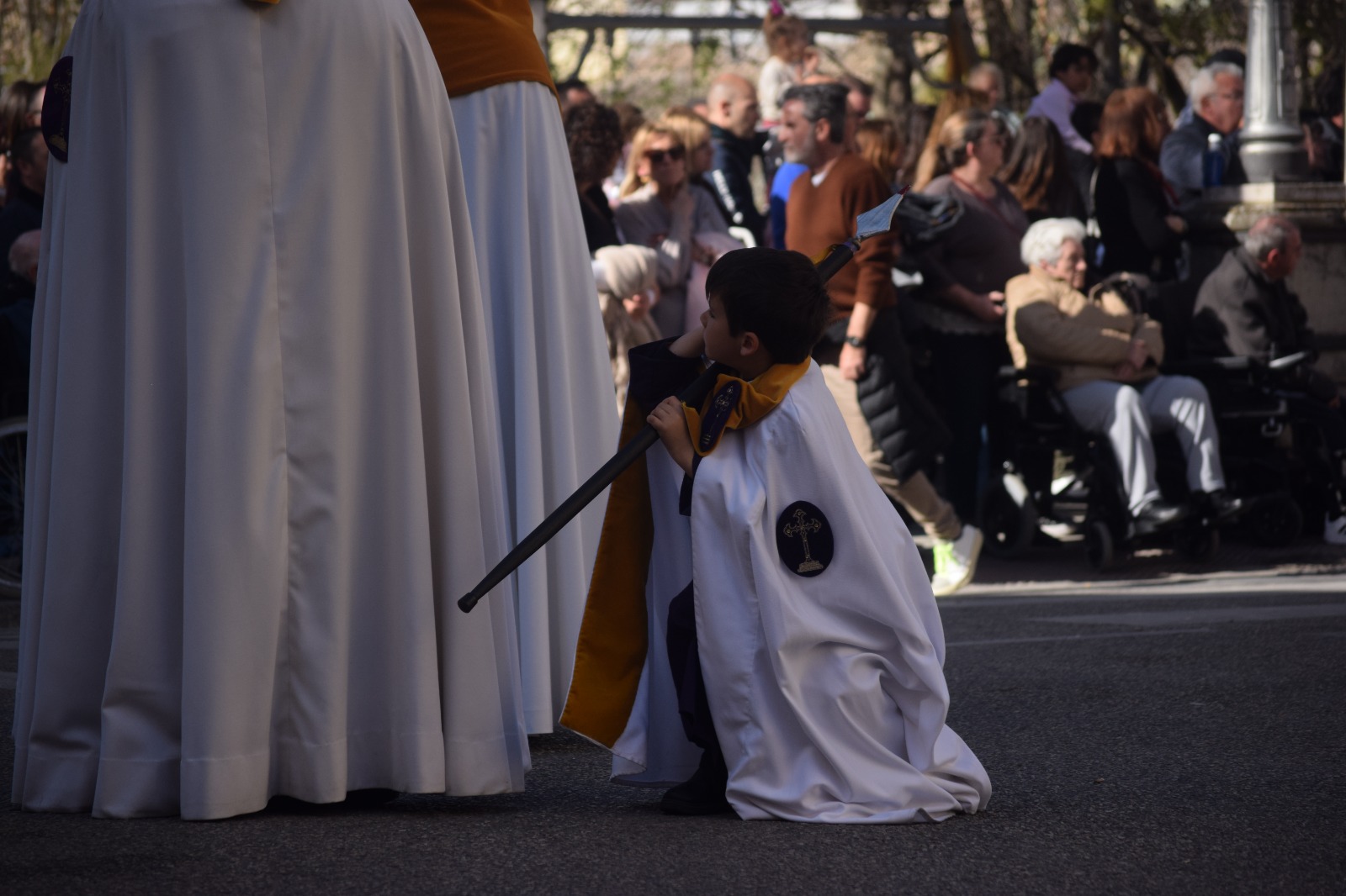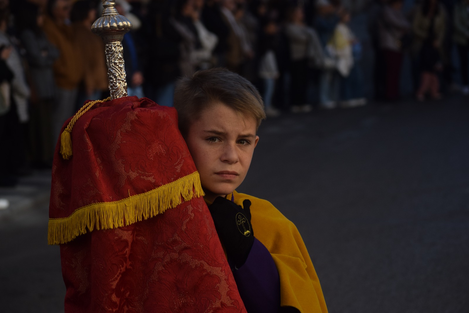 Tras el receso, la procesión ha iniciado su descenso bajo un calor al que le ha costado hacer acto de presencia en esta Semana Santa. Al frente del desfile, nuevamente, la Exaltación, que es la primera hermandad que recibe el Miserere del Coro del Conservatorio en San Felipe Neri. Estas voces entonaron también el Jesu Christe de Van Berchem para los dos pasos del Cristo de la Agonía y el Stabat Mater a la Virgen.