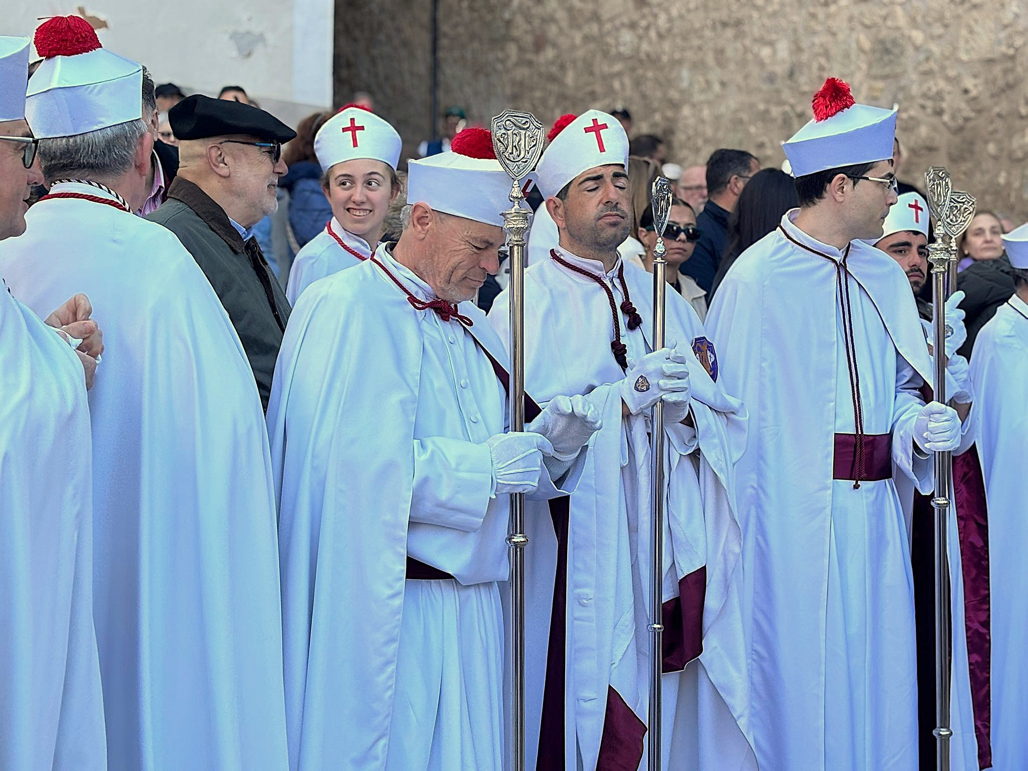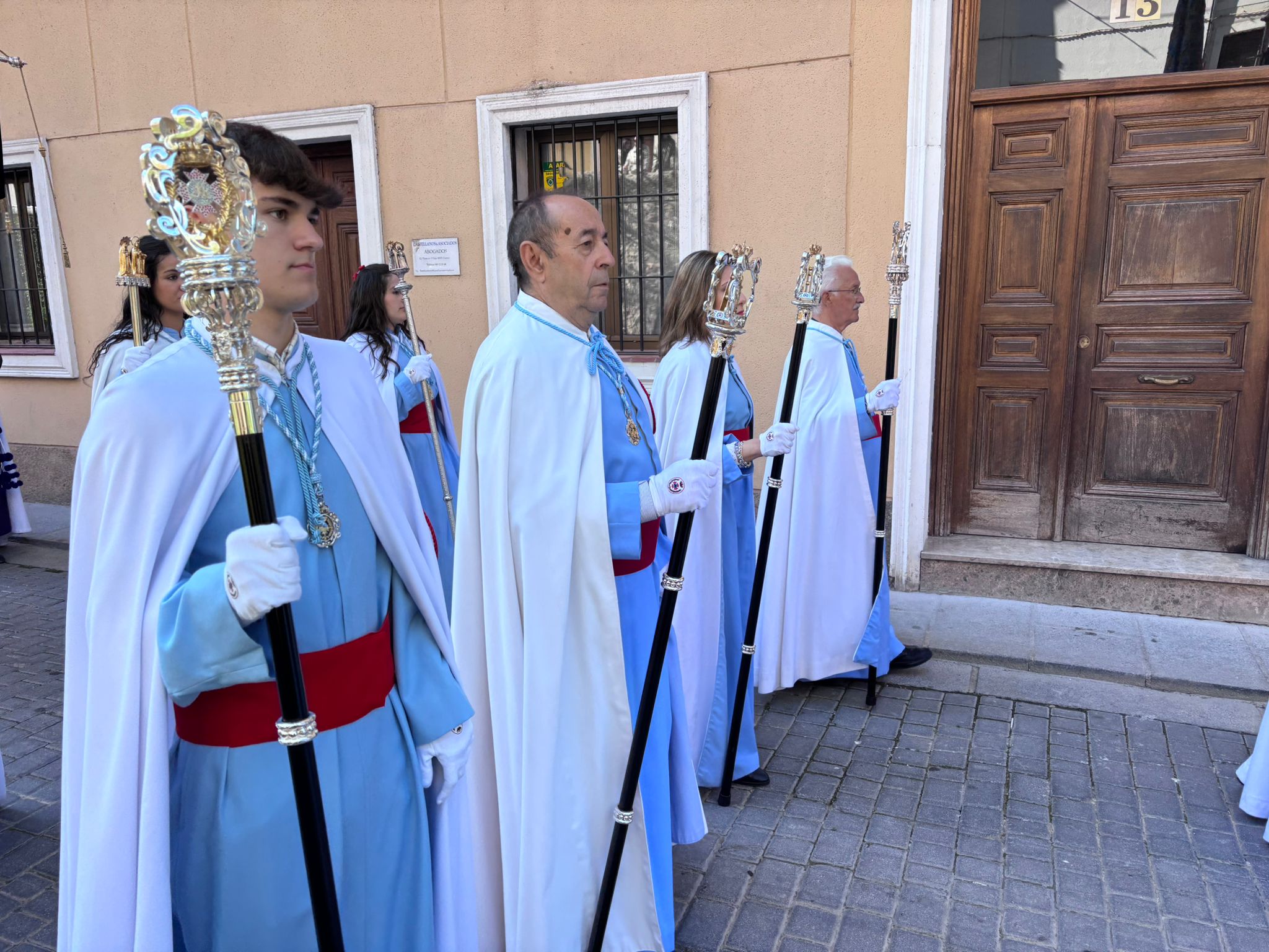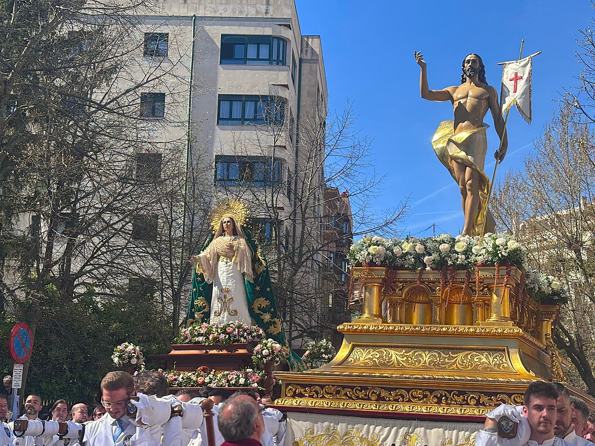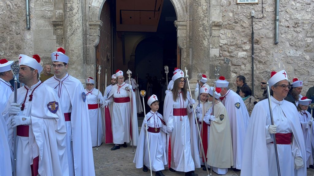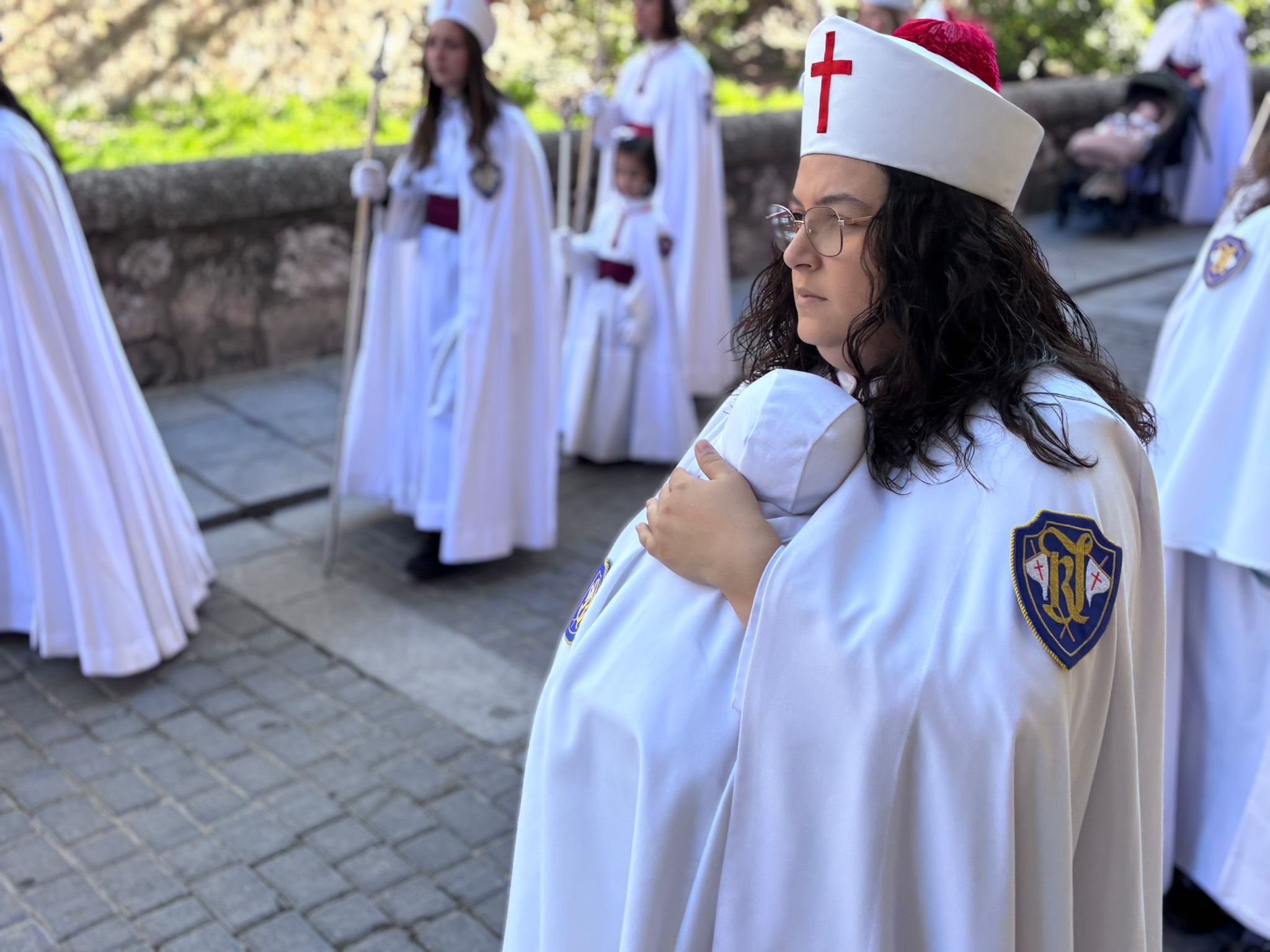 El Domingo de Resurrección es jubiloso por naturaleza, pero todavía es más alegre cuando una Semana Santa se cierra sin lágrimas perdidas en la lluvia. En San Andrés se concentran otras emociones: el encuentro antes de El Encuentro con los hermanos, los balances provisionales del resto de procesiones, los nervios entre bambalinas antes del desfile… Los rostros de la hermandad del Jesús Resucitado y la Virgen del Amparo son hoy los rostros de todos los nazarenos de Cuenca.