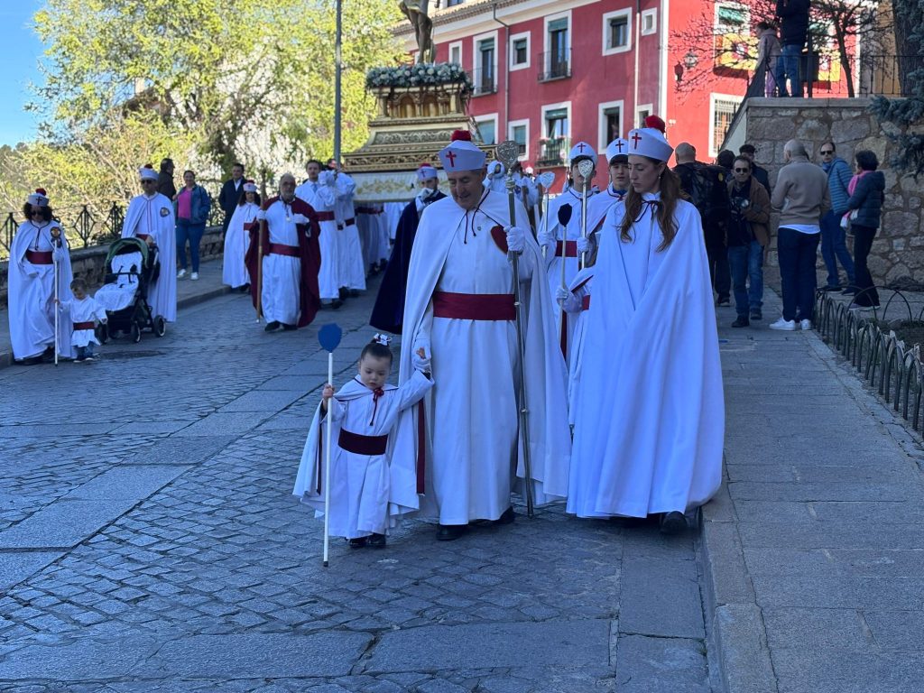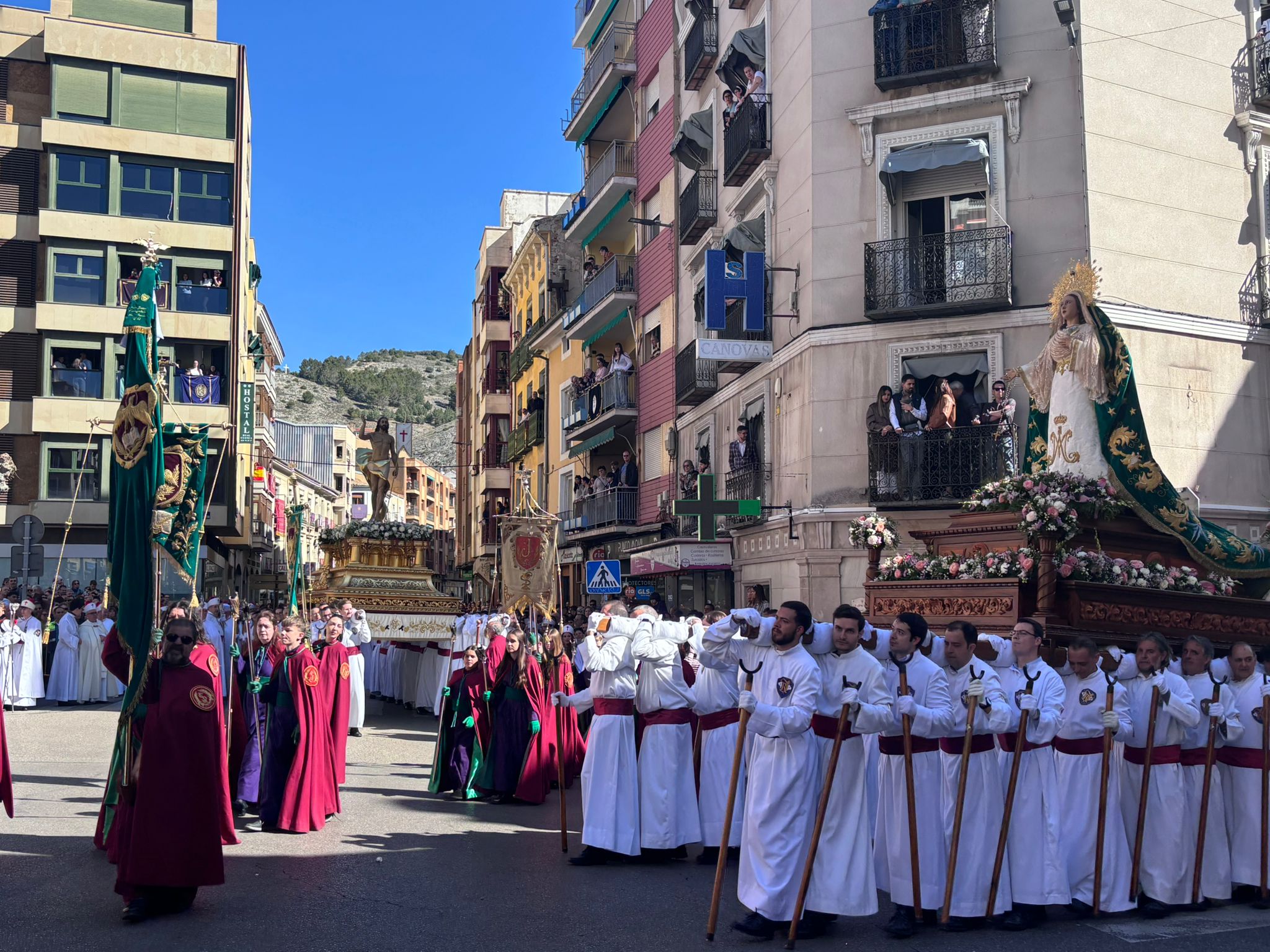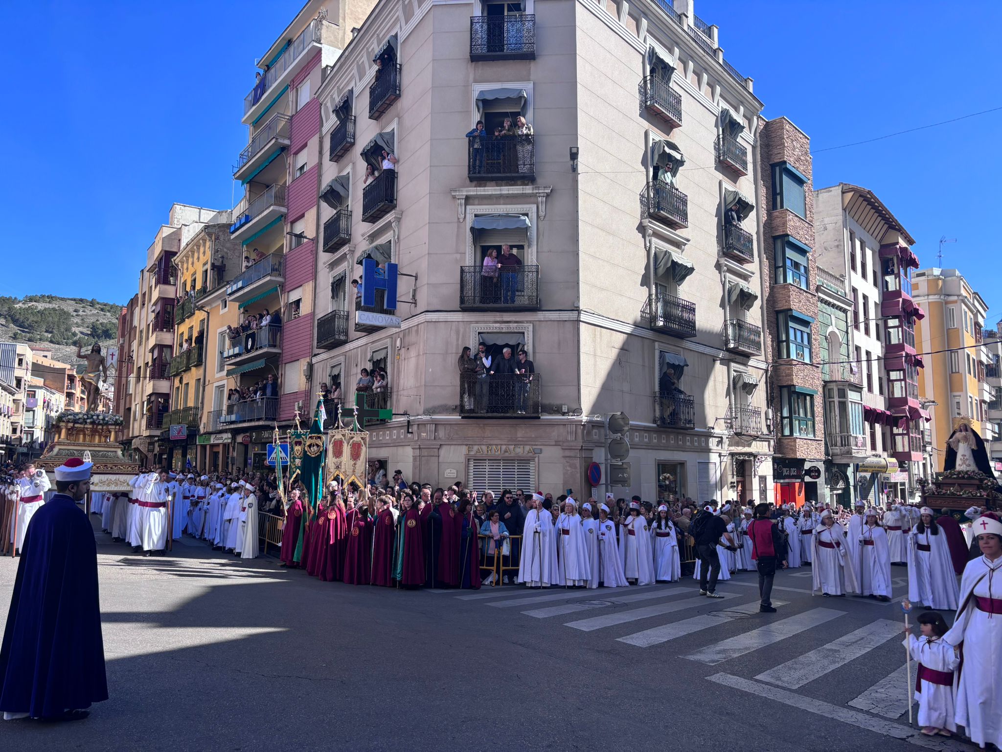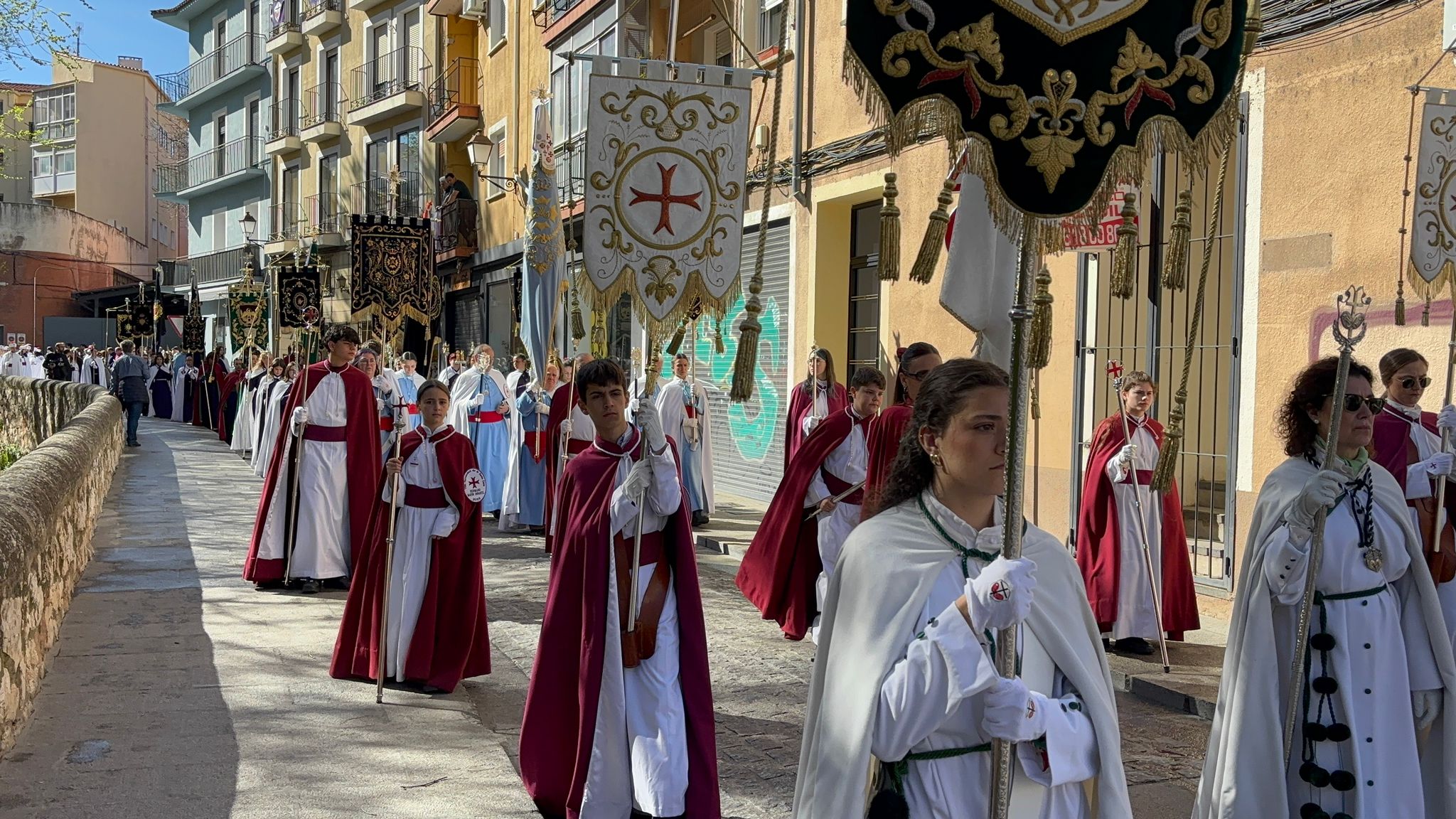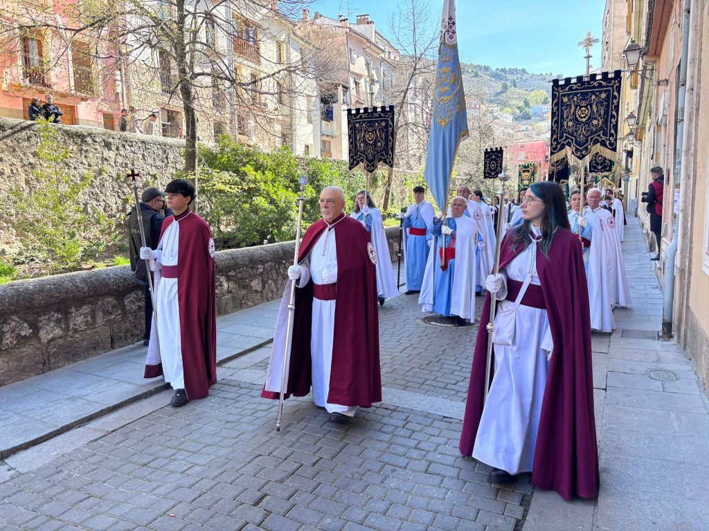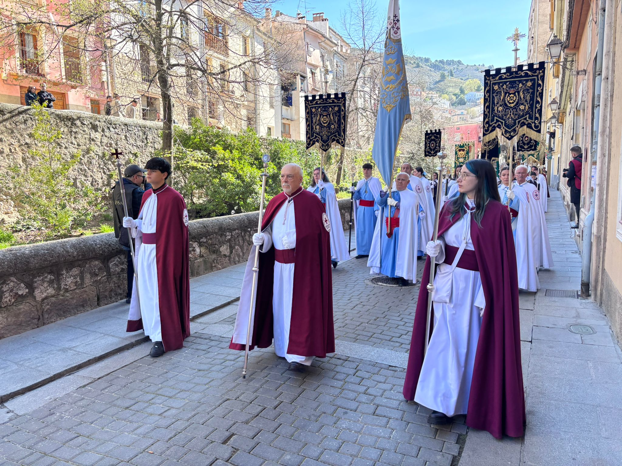 Las Sagradas Imágenes eligen caminos distintos. El Resucitado avanza por calles amplias para empaparse de la luz y el aire que echaba en falta en el sepulcro. Sigue la estela de color que forman los representantes de las hermandades de Cuenca, reunidas por este gran acontecimiento.
