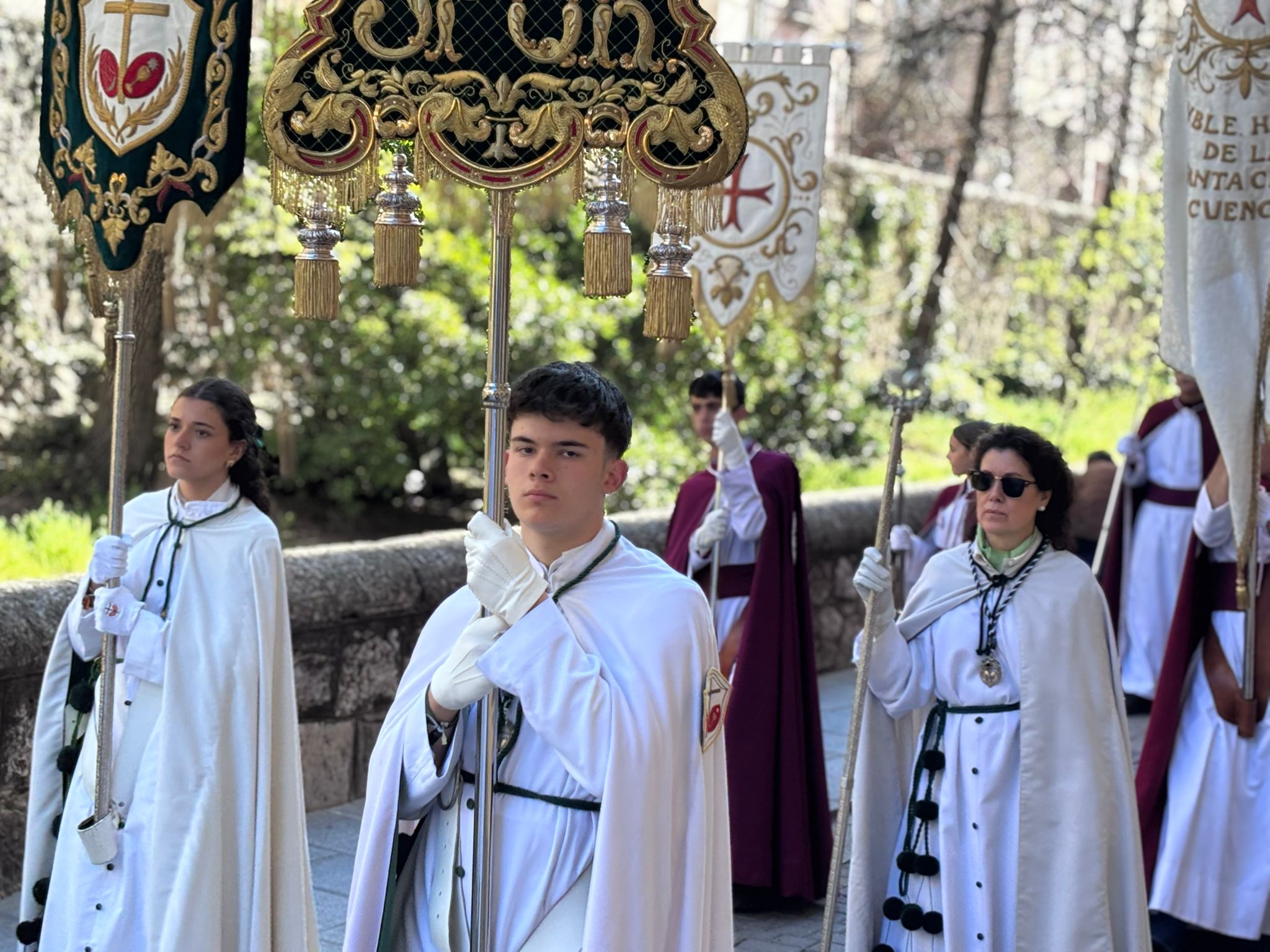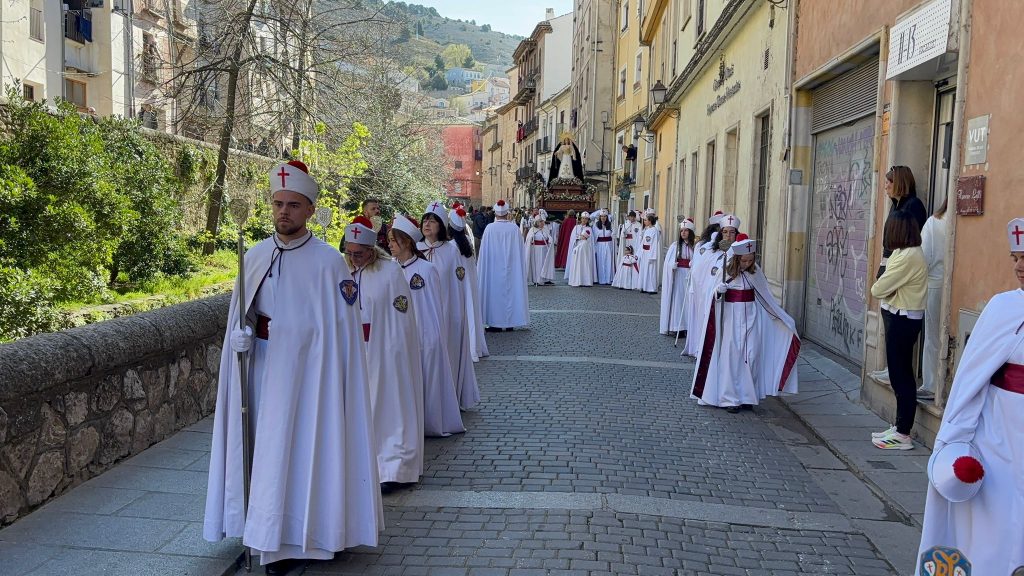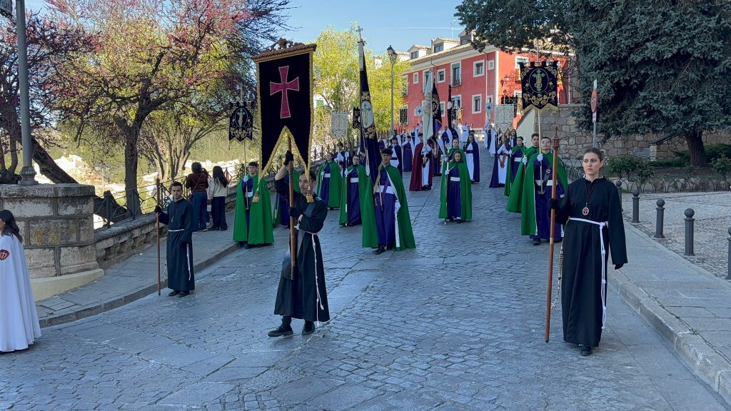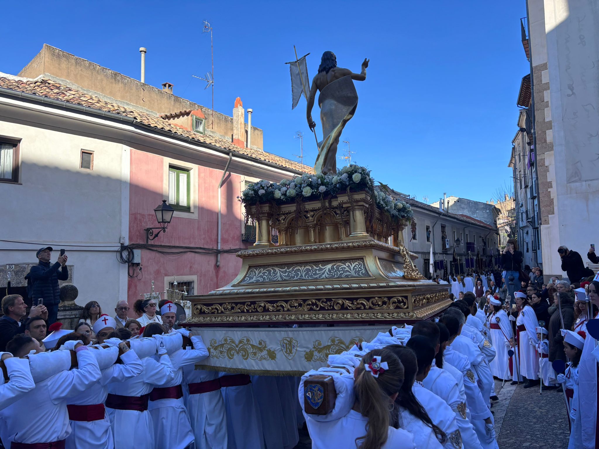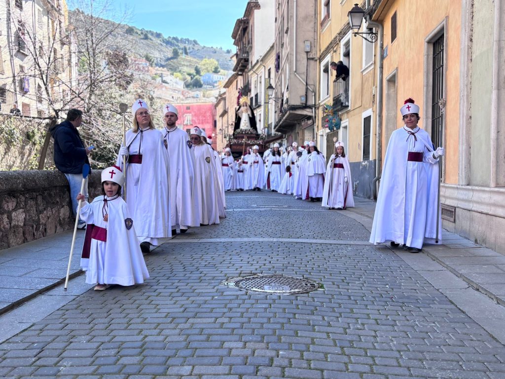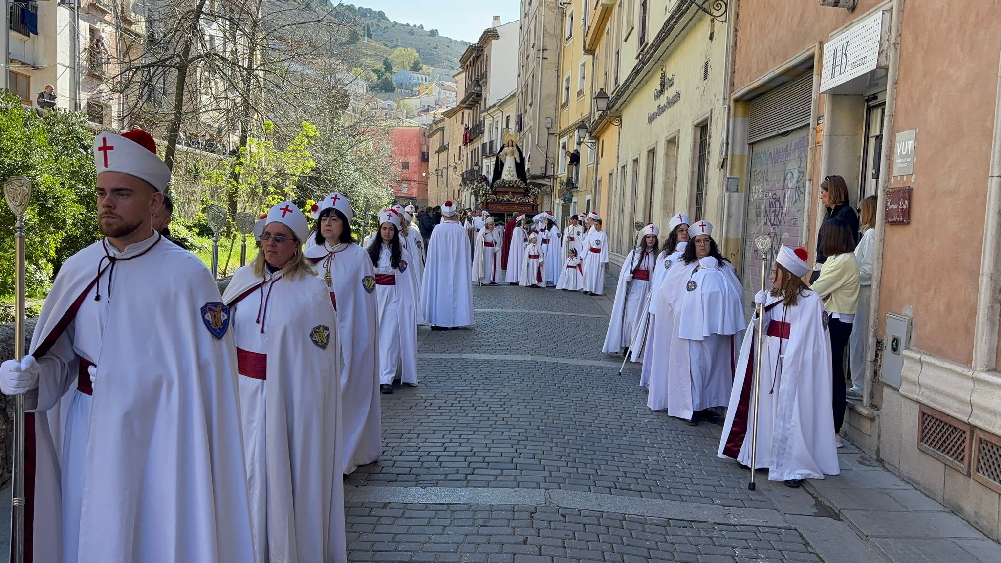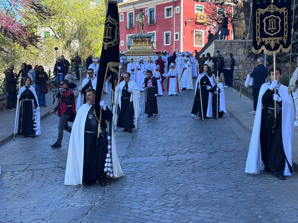 Las Sagradas Imágenes eligen caminos distintos. El Resucitado avanza por calles amplias para empaparse de la luz y el aire que echaba en falta en el sepulcro. Sigue la estela de color que forman los representantes de las hermandades de Cuenca, reunidas por este gran acontecimiento.