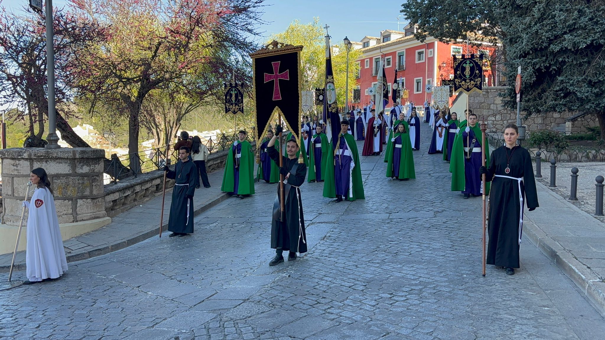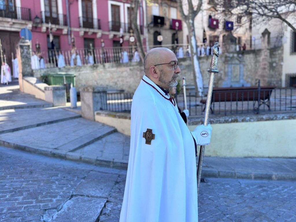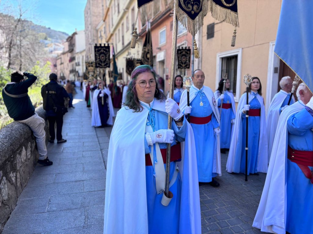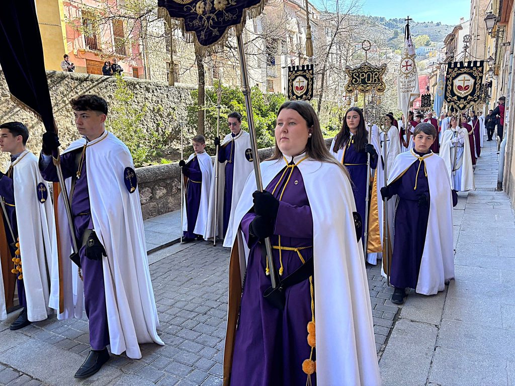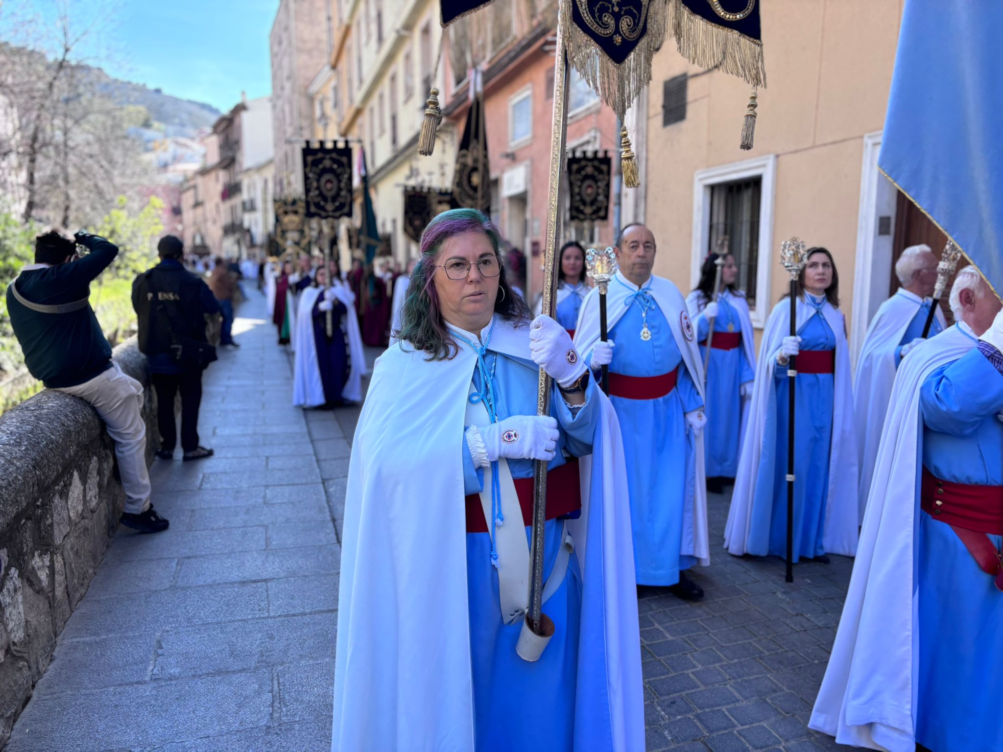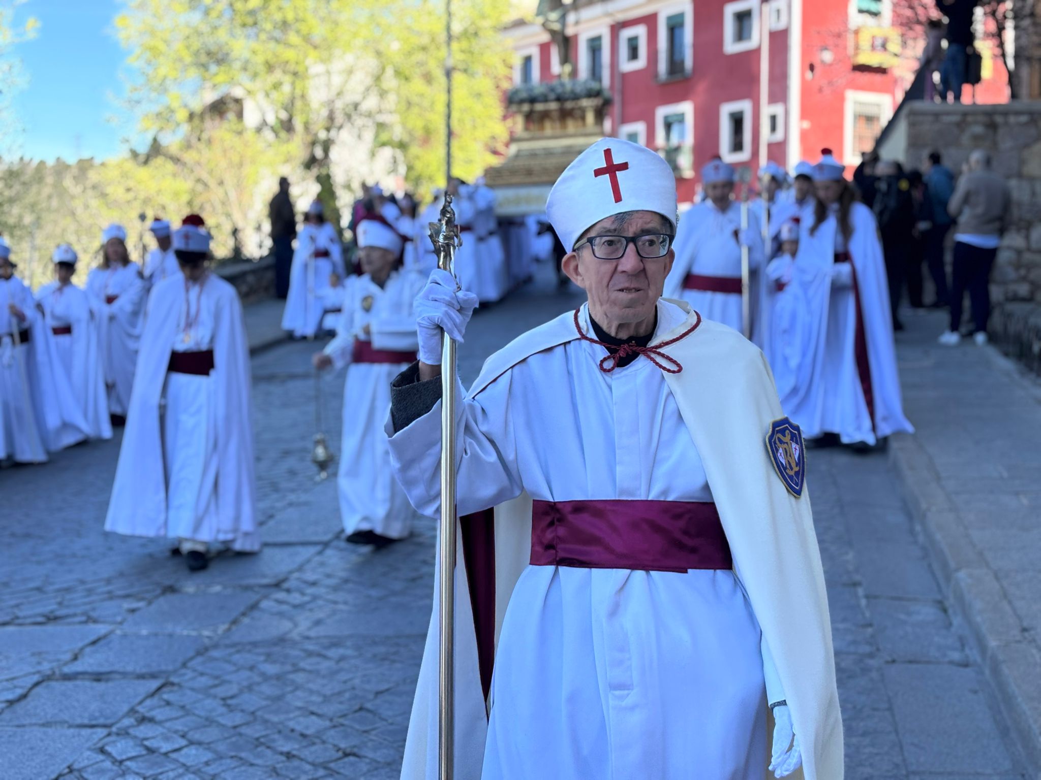 Las Sagradas Imágenes eligen caminos distintos. El Resucitado avanza por calles amplias para empaparse de la luz y el aire que echaba en falta en el sepulcro. Sigue la estela de color que forman los representantes de las hermandades de Cuenca, reunidas por este gran acontecimiento.
