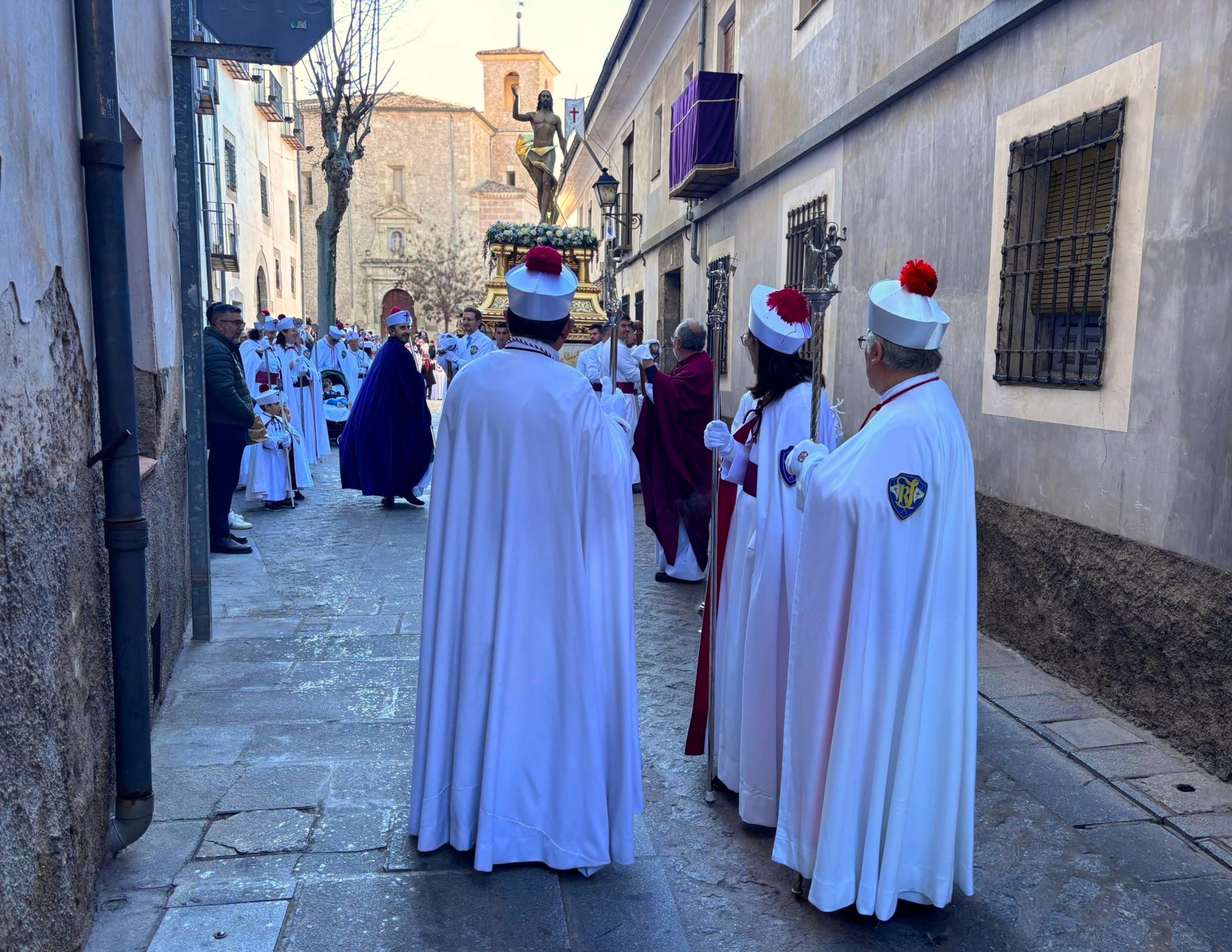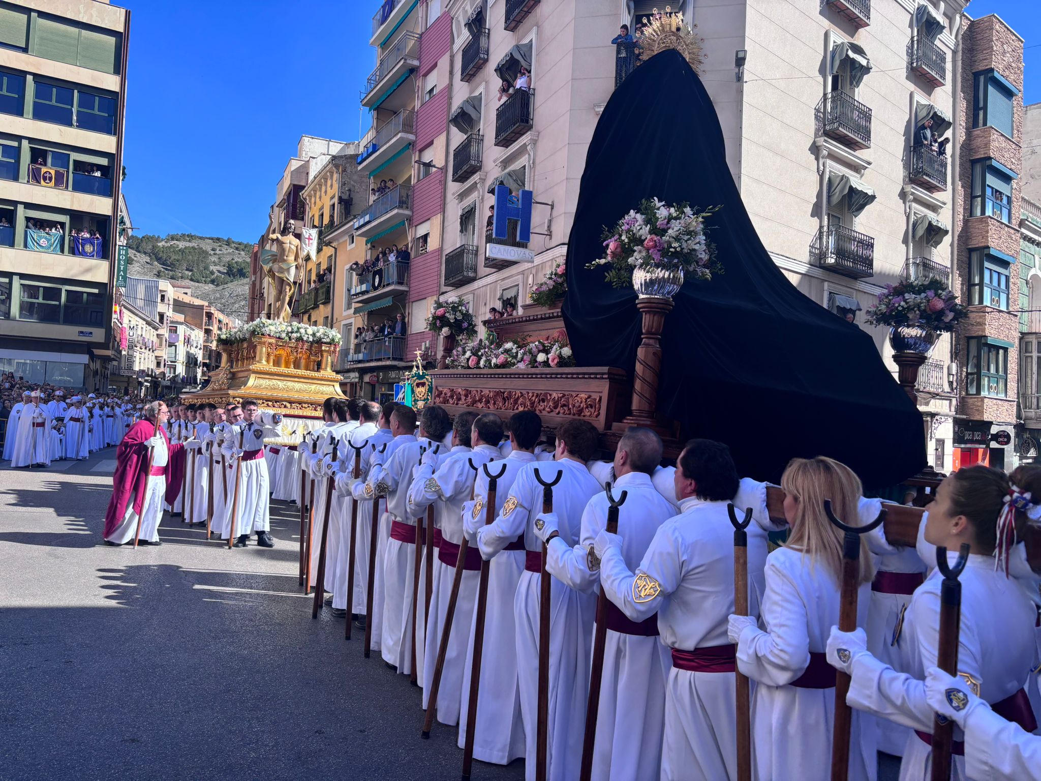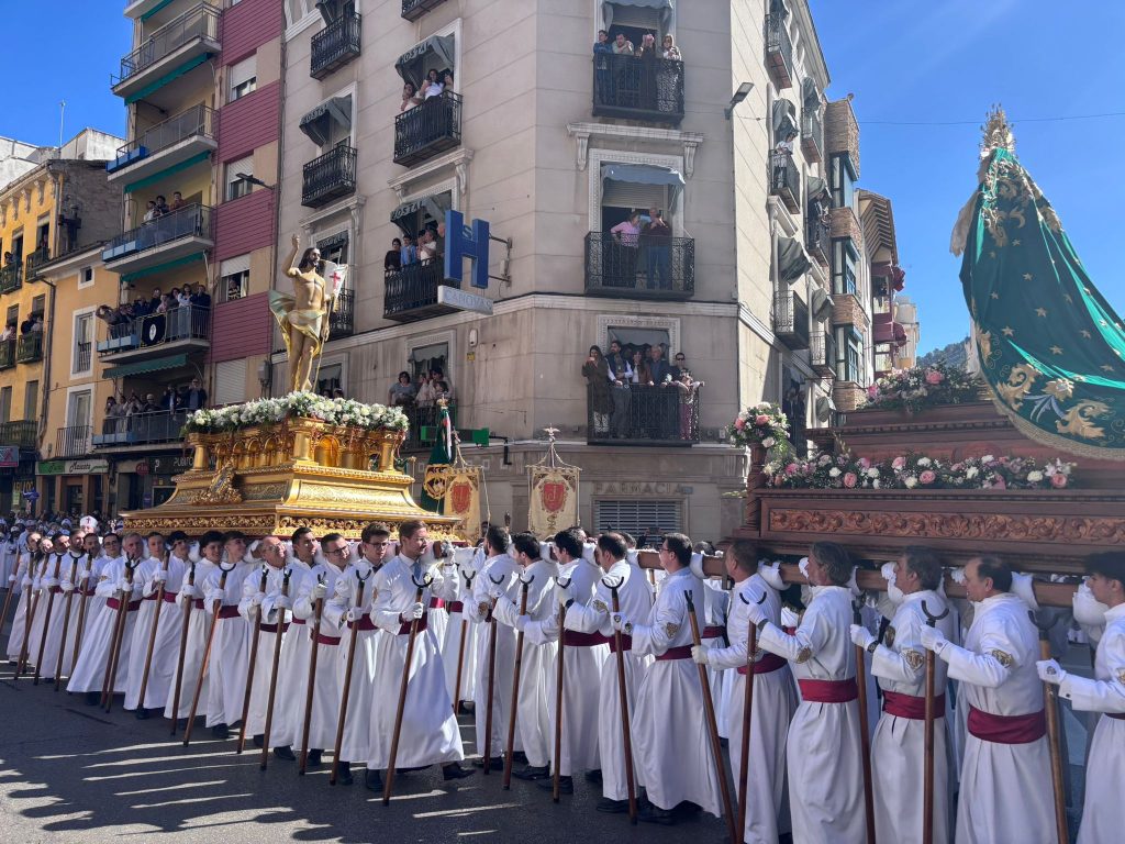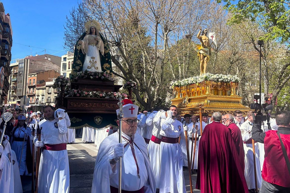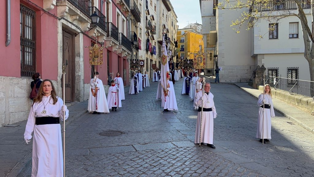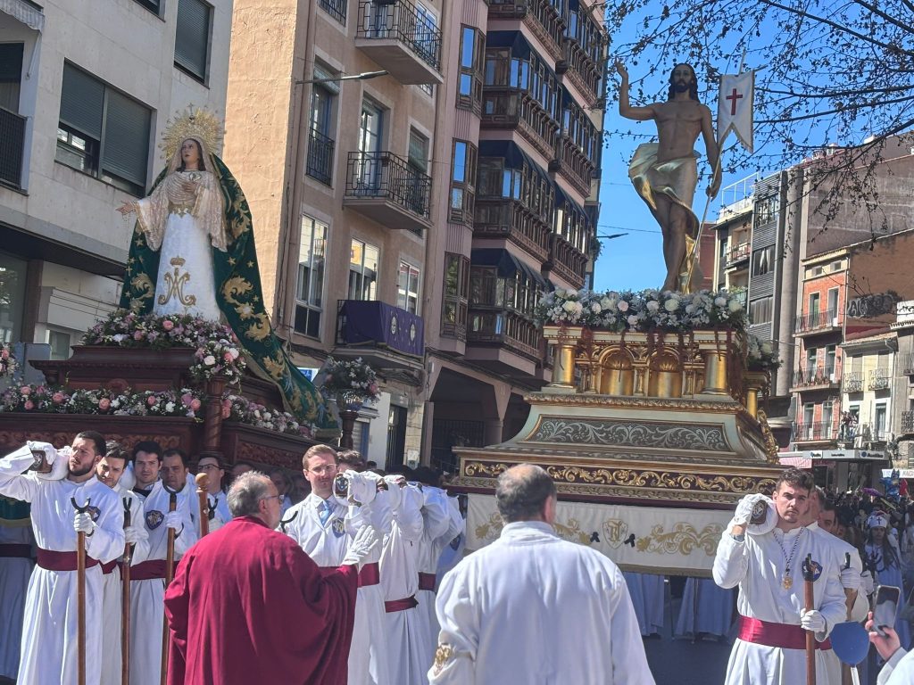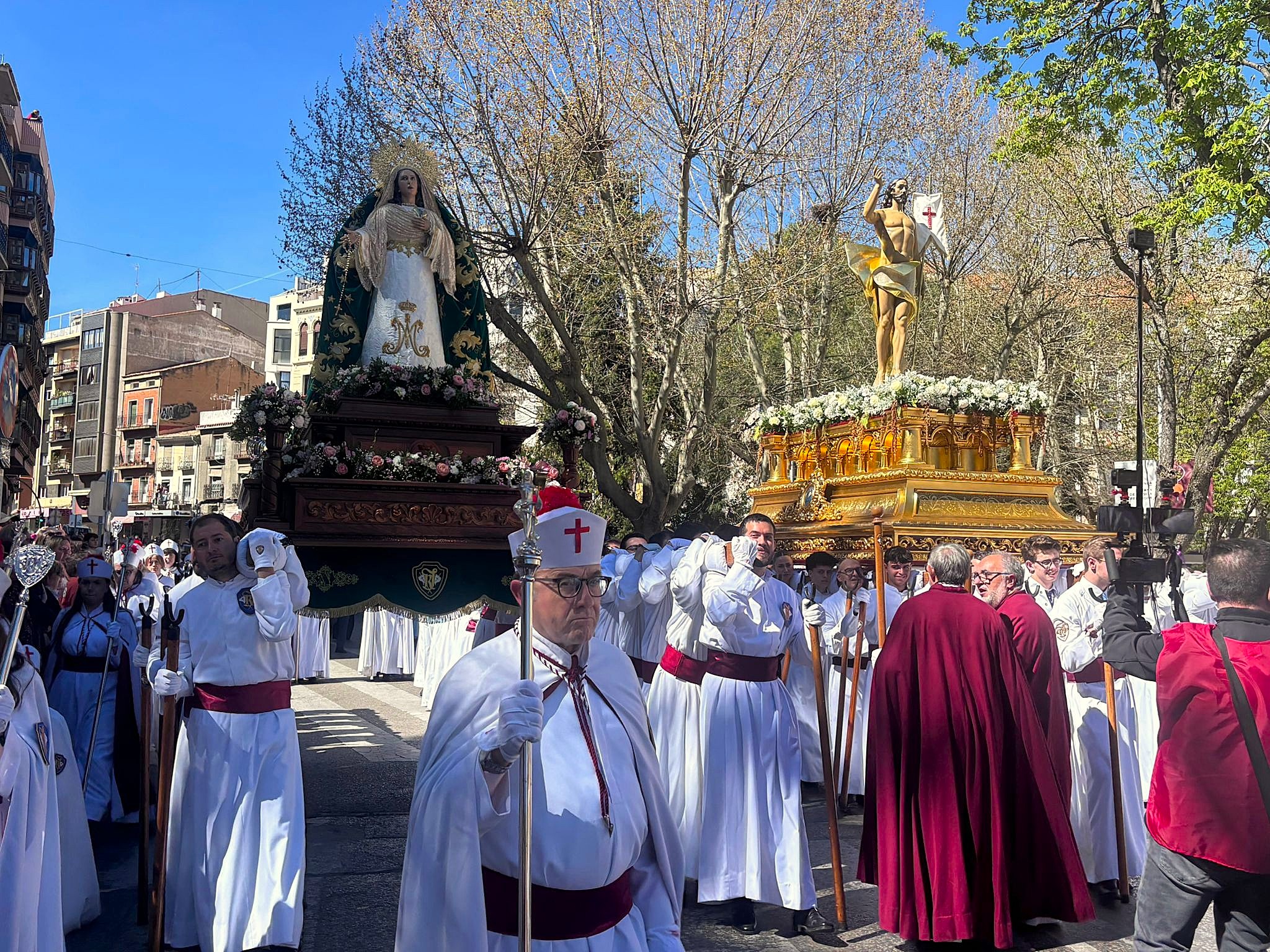 Las Sagradas Imágenes eligen caminos distintos. El Resucitado avanza por calles amplias para empaparse de la luz y el aire que echaba en falta en el sepulcro. Sigue la estela de color que forman los representantes de las hermandades de Cuenca, reunidas por este gran acontecimiento.